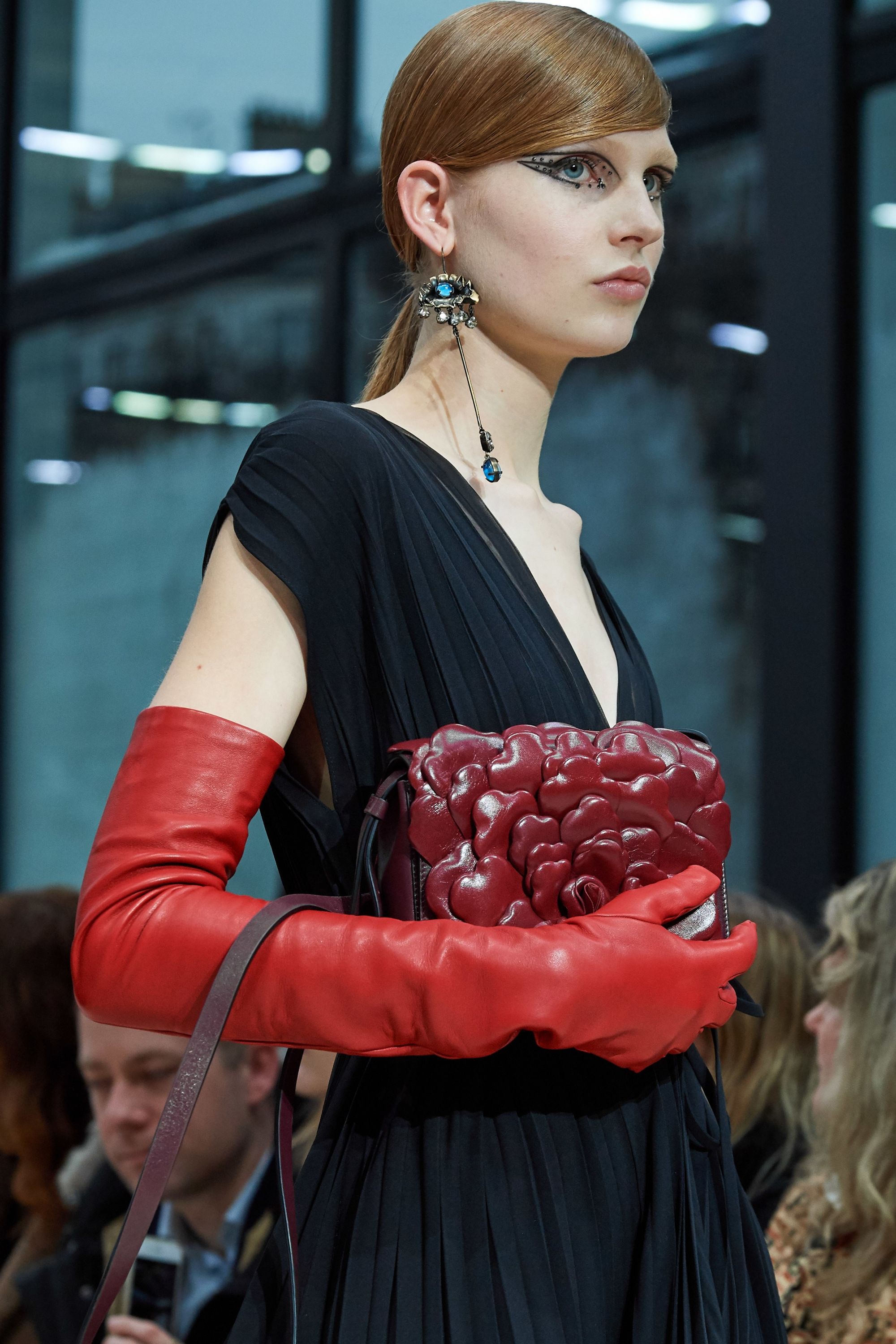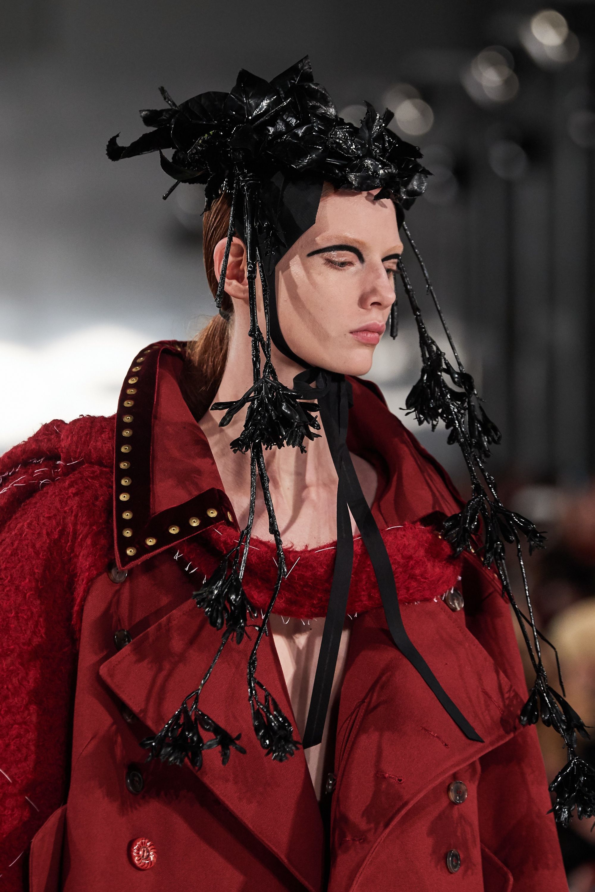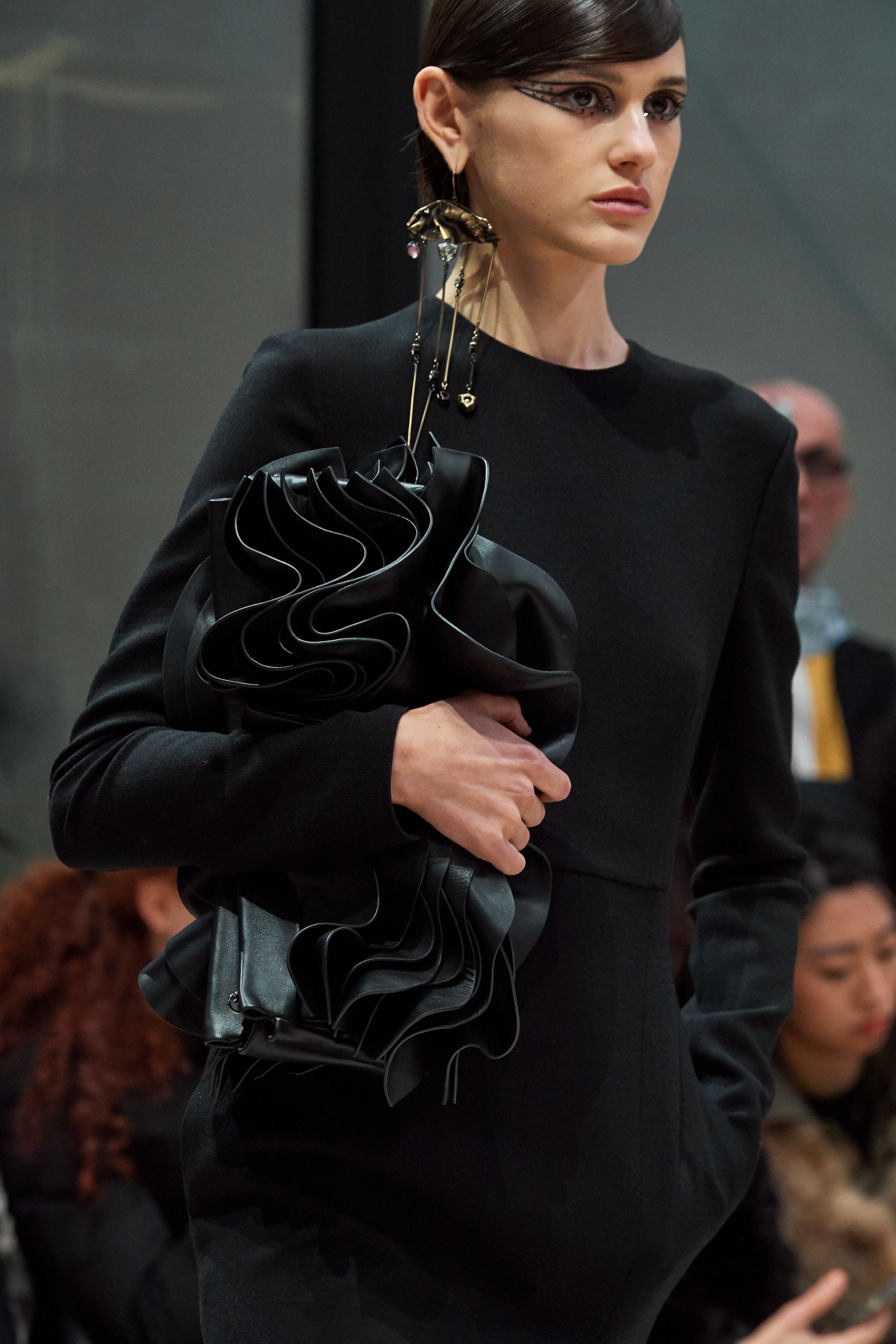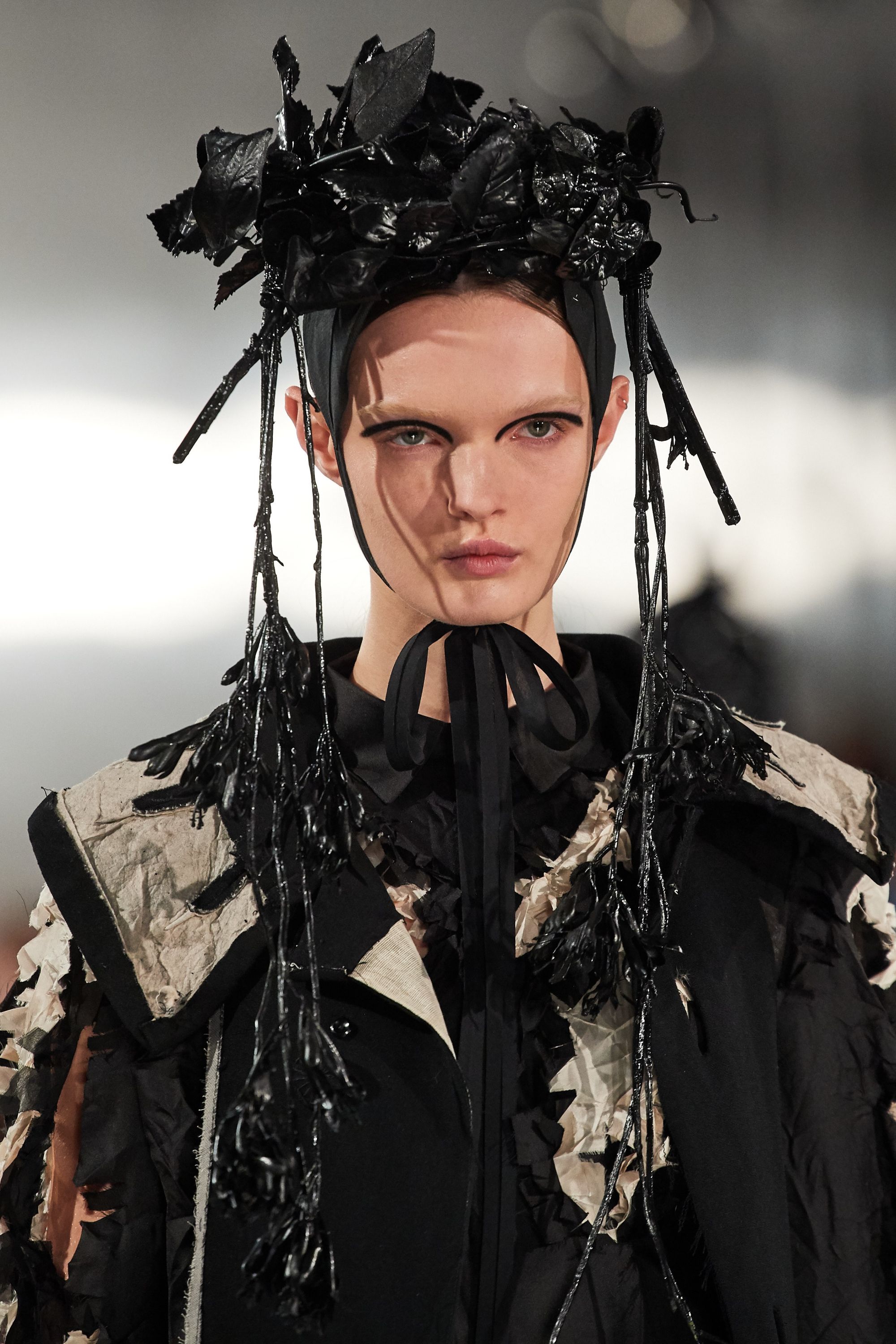 I beauty look di Valentino, creati dalla combo di leggende Pat McGrath e Guido Palau, prevedono un eyeliner grafico impreziosito da piccole "borchie" in total black che illuminano lo sguardo, e capelli effetto liscissimo e wet portati su un lato della fronte. I gioielli sono audaci e vistosi, ma elegantissimi, come tutto il look.