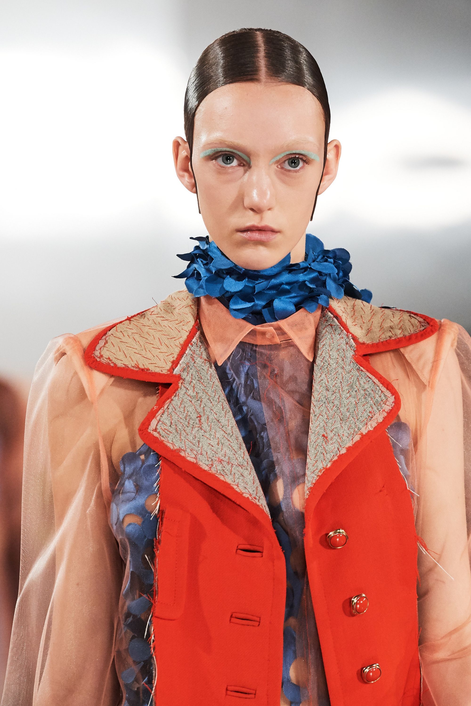 Anche sulla passerella di Dries Van Noten il protagonista è il colore, a partire dall'hairstyle di Sam Knight, che applica piume colorate all'attaccatura dei capelli, creando un effetto ricrescita coloratissimo e anni '70. Inge Grognard alla direzione del make up, sceglie ombretti sfumati sopra e sotto l'occhio in diverse tonalità e texture, e rossetti che variano dal rosso al burgundy.