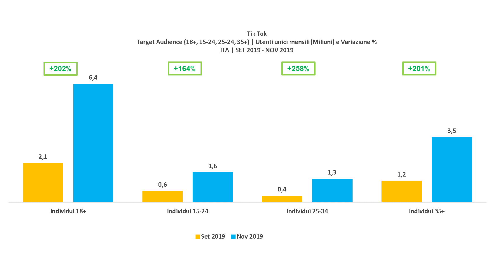 Sorto dalle ceneri dell’app musical.ly, TikTok (secondo i dati di Comscore) negli ultimi mesi ha registrato solo in Italia una crescita esponenziale: da settembre a novembre 2019 gli iscritti sono passati da 2,1 milioni a più di 6,4 milioni (+202%, la più alta crescita nel panorama internet italiano). E se fino a qualche mese fa il totale degli utenti si aggirava intorno ai 500 milioni (il 41% nella fascia 16-24 anni), oggi ByteDance è valutata 75 miliardi di dollari (la valutazione più alta al mondo) e TikTok ha raggiunto un miliardo di utenti in 3 anni (per intenderci: Facebook ne impiegò 9).