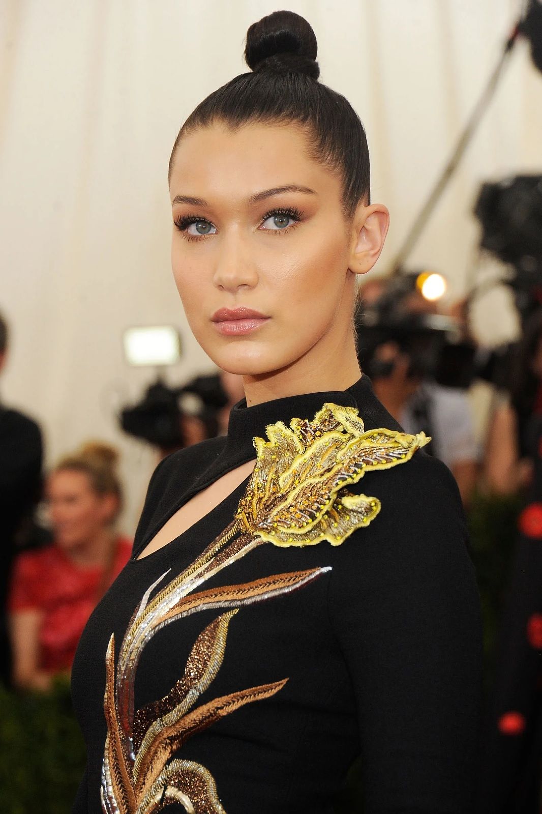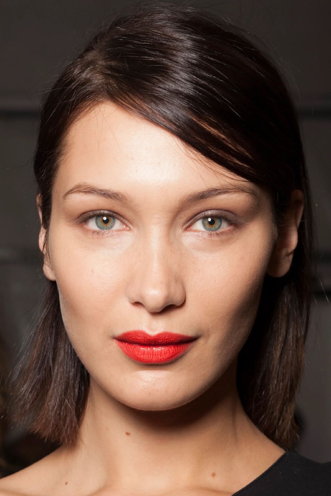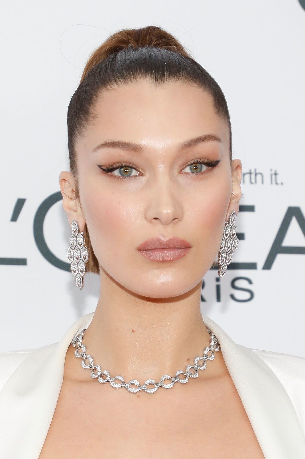 Con un viso come il suo, che, per un noto chirurgo plastico londinese, si avvicina per il 94,35% alle misure perfette della sezione aurea, risultare impeccabile è fin troppo facile. Ignorando i rumours riguardo ai presunti ritocchi di chirurgia plastica ai quali si sarebbe sottoposta, Bella ha imparato a valorizzare al meglio i suoi lineamenti. Da sempre il suo vero marchio di fabbrica sono i cat-eyes. La sorella di Gigi Hadid utilizza l’eyeliner per mettere in risalto lo sguardo, delineando un tratto sottile e preciso che si inspessisce e si allunga leggermente verso l’alto nella più esterna dell’occhio. Per gli eventi speciali, questa linea grafica può essere colorata, glitter, come per il ballo annuale del 2018 di Christian Dior, o può essere arricchita da un ombretto smokey nei toni del marrone e del prugna. Immancabile un tocco di mascara nero per rendere le ciglia voluminose e sensuali, così come un velo di gloss o, di tanto in tanto, di rossetto rosso.