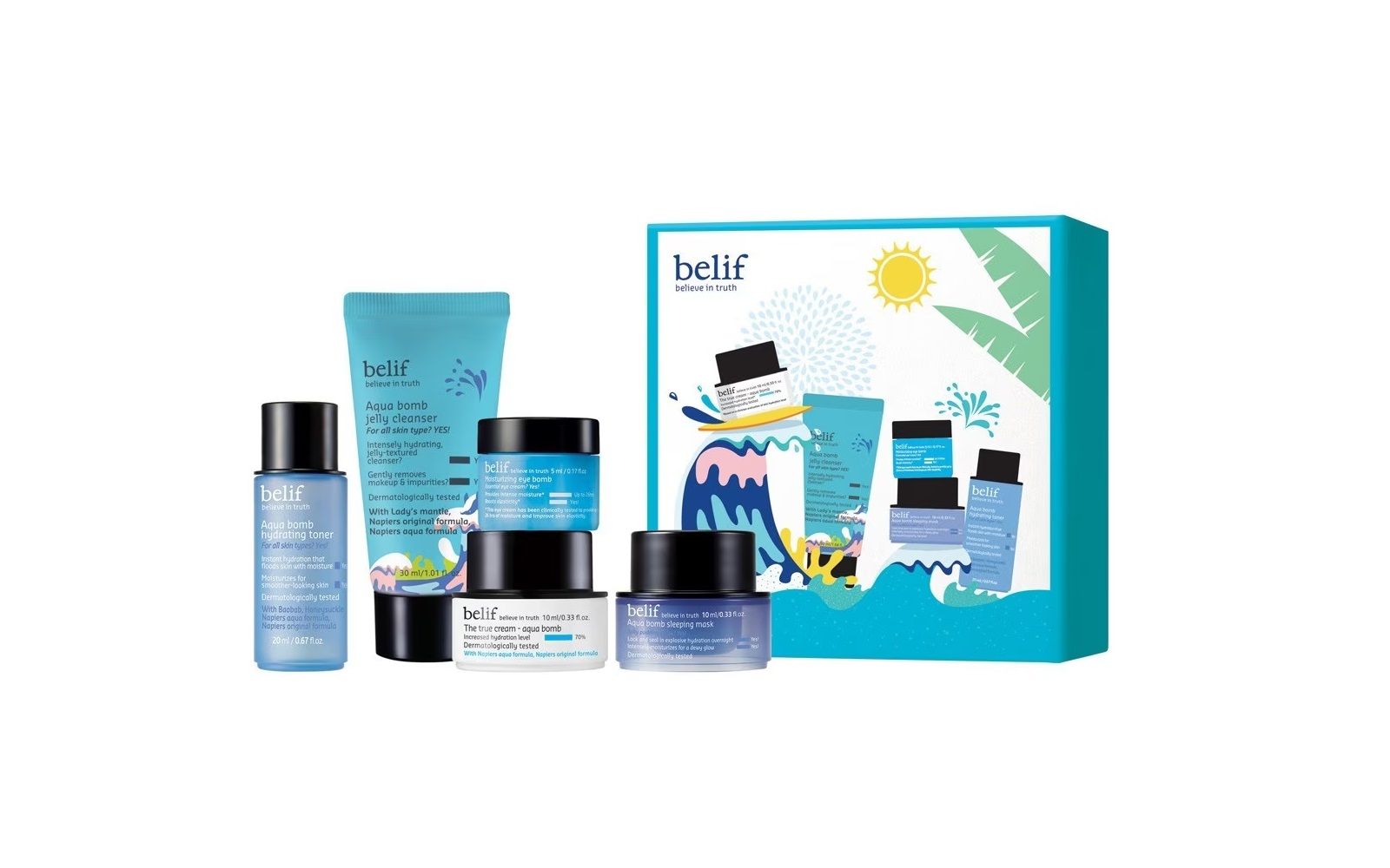 I prodotti più venduti di belif sono ora racchiusi in un kit per un rituale completo di trattamento ultra-idratante della pelle, dalla pulizia alla cura, ovunque ci troviamo. All’interno ci sono un gel detergente; un tonico idratante; una crema viso dal potere antiossidante; una crema occhi sviluppata per aumentare l'elasticità della pelle e migliorare la compattezza della pelle nella zona del contorno occhi; una sleeping mask per risvegliarsi con un aspetto luminoso.