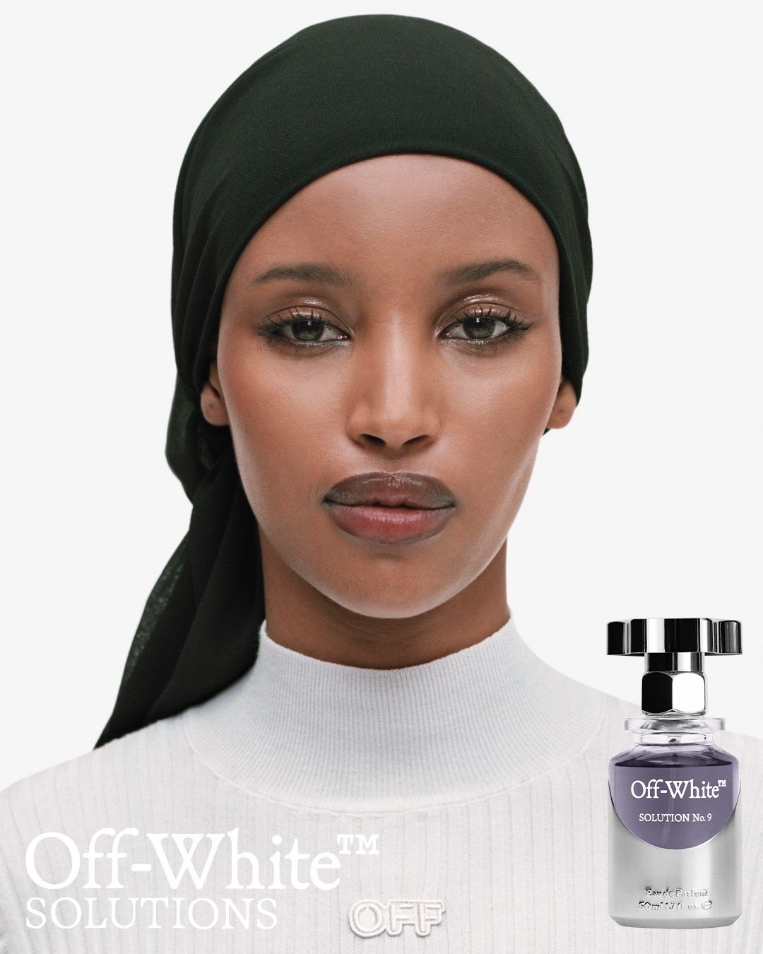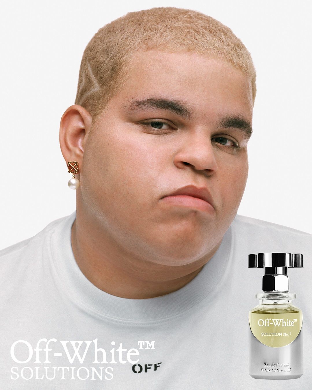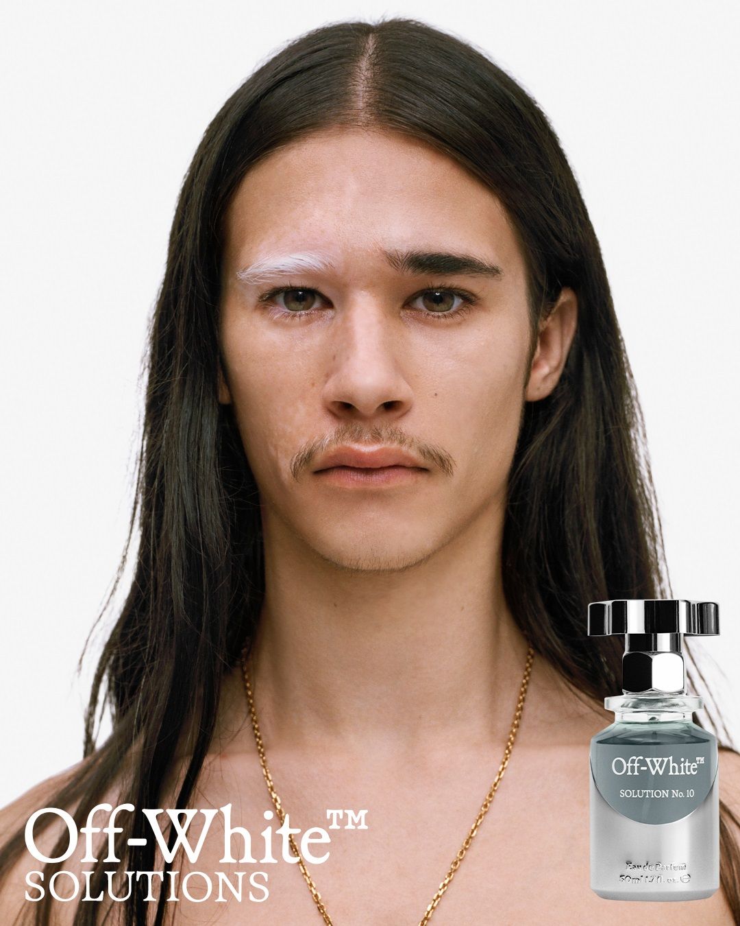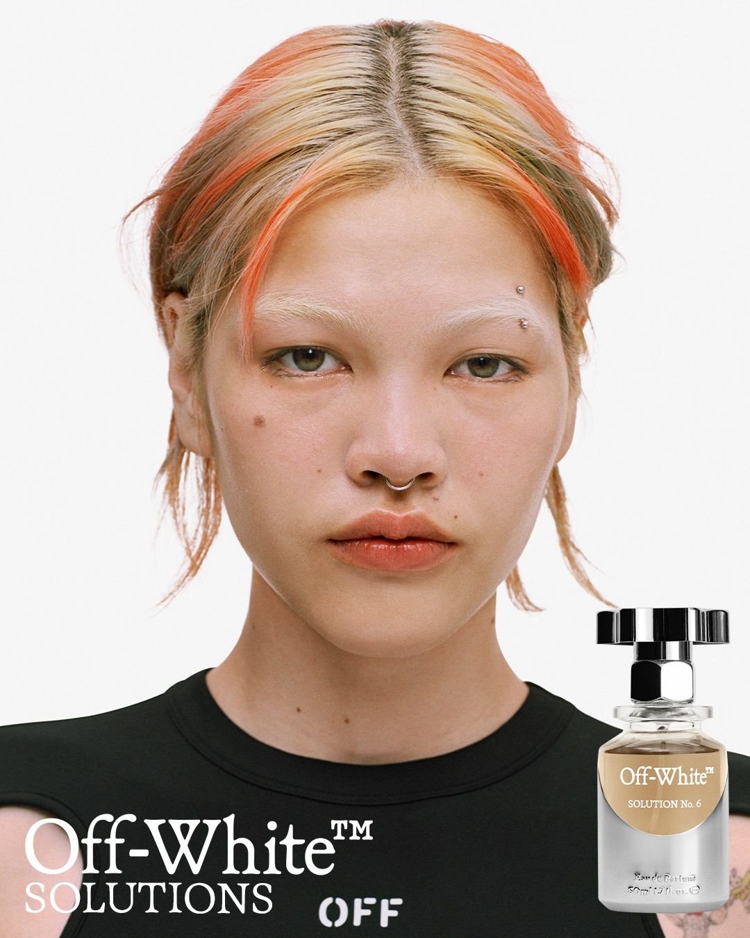 Le vere protagoniste della collezione di Off-White™ Beauty sono le fragranze Solutions, una selezione di 9 Olfactive ID senza nome per offrire a chi le indossa un’esperienza interamente personalizzabile e un beauty libero, lontano dalle convenzionali "istruzioni per l'uso", liberandosi da ogni possibile condizionamento dato dal nome. Le Solutions dalla No.1 alla No.4 sono state create da Virgil Abloh in collaborazione con celebri profumieri, mentre le Solutions dalla No.6 alla No.10 sono state sviluppate in collaborazione con Isamaya Ffrench, curatrice di bellezza di Off-White™. Ogni fragranza evoca sensazioni diverse e uniche, adattandosi a mood, momenti e personalità diversi. Solution No.1, firmata da Alexis Dadier, ricorda l’odore della sabbia con note di testa di Ho Wood e Bergamotto mescolate con vetiver e patchouli; Solution No.2, di Jérome Epinette, gioca sulla dualità di freschezza e legnosità, con una nota di agrumi accentuata dalla scorza di zenzero fresco; per Solution No.3 Sidonie Lancesseur ha associato il potere del muschio e dell'ambretta alla rosa Damascena; Solution No.4, creata da Jérome Epinette, è descritta come una freschezza urban aromatica, con note principali di foglie di mandarino, fiori d'arancio e vetiver. Solution No.6, sviluppata con Steve Guo, è una fragranza legnosa gourmand, con note riconoscibili di rum, cioccolato, patchouli; per Solution No.7 Alexis Dadier ha mescolato arancia amara, resina di abete e sandalo; Solution No.8, di Emily Bouge, ha un bouquet ambrato floreale con zafferano, pepe e vaniglia; Solution No.9, immaginato da Sidonie Lancesseur, mixa la mandorla amara, il gelsomino e il riso; mentre Solution No.10 unisce pepe rosa, patchouli e sale marino.
