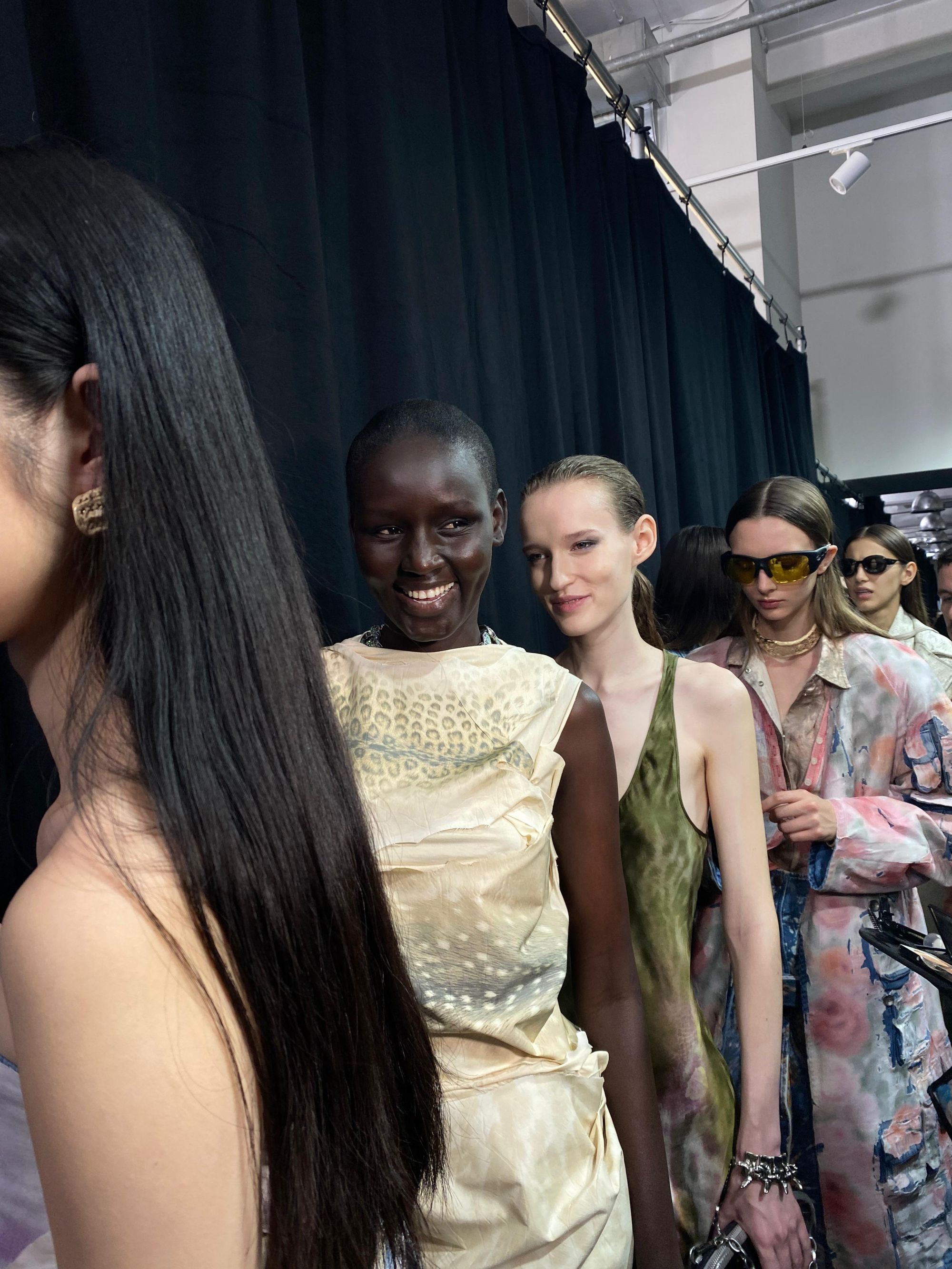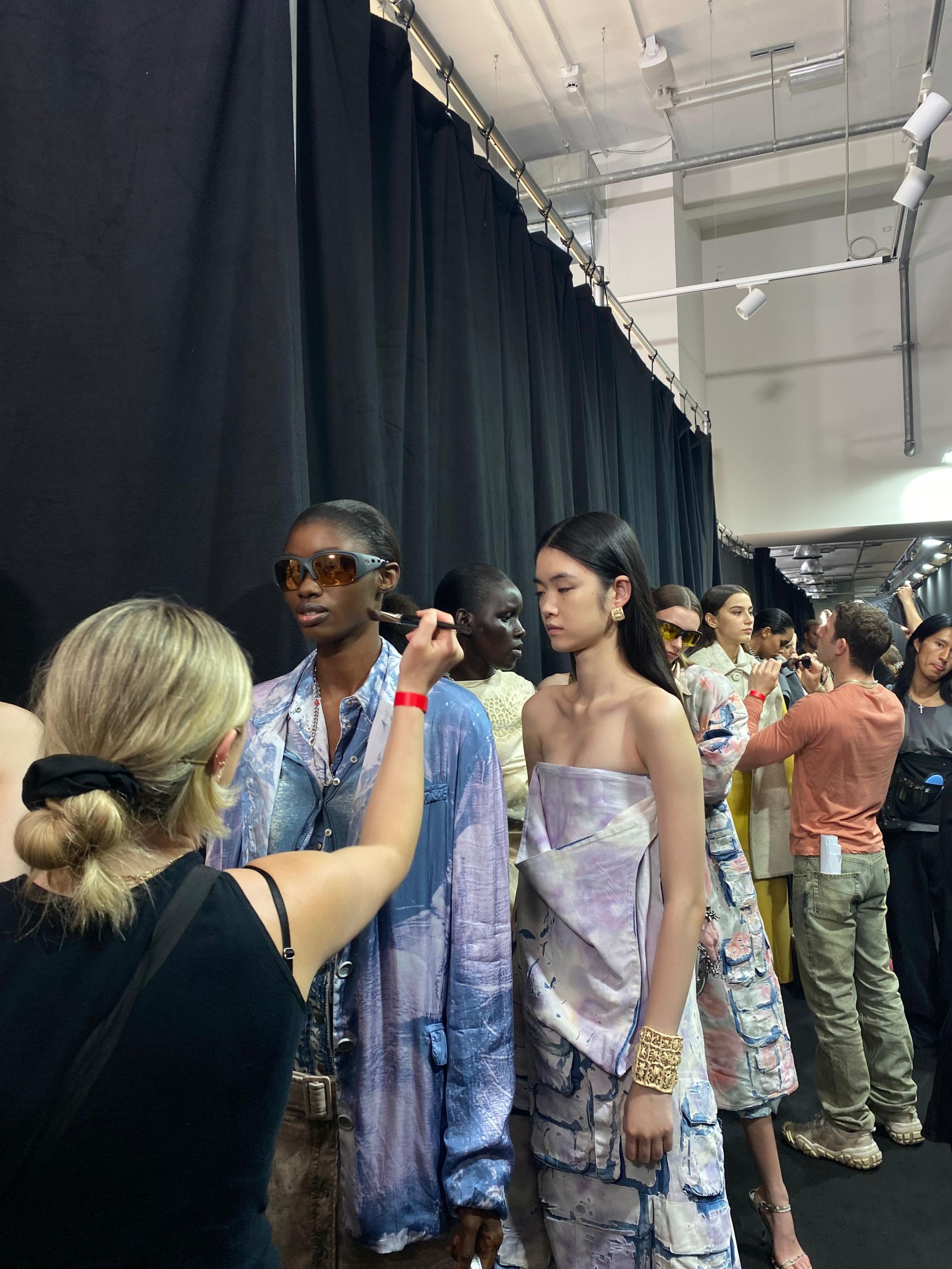 Sul mascara interviene anche Inge Grognard, make-up artist d'avanguardia, personaggio storico che con la sua visione ha cambiato per sempre il mondo della bellezza sulla passerella ma anche nelle strade: "I fan di Diesel sono giovani, quindi volevamo che i modelli fossero freschi e allo stesso tempo sexy. Abbiamo messo molto mascara nell'angolo esterno dell'occhio, per tirarlo su. Il nero è sbavato, come fosse una macchia, un avanzo, l'eyeliner del giorno prima. Per il resto, la pelle è idratata. Abbiamo messo un po' di cipria e via. È molto semplice, la cosa più importante era mantenere lo spirito di Diesel. Sapevamo che il focus doveva essere sugli occhi".