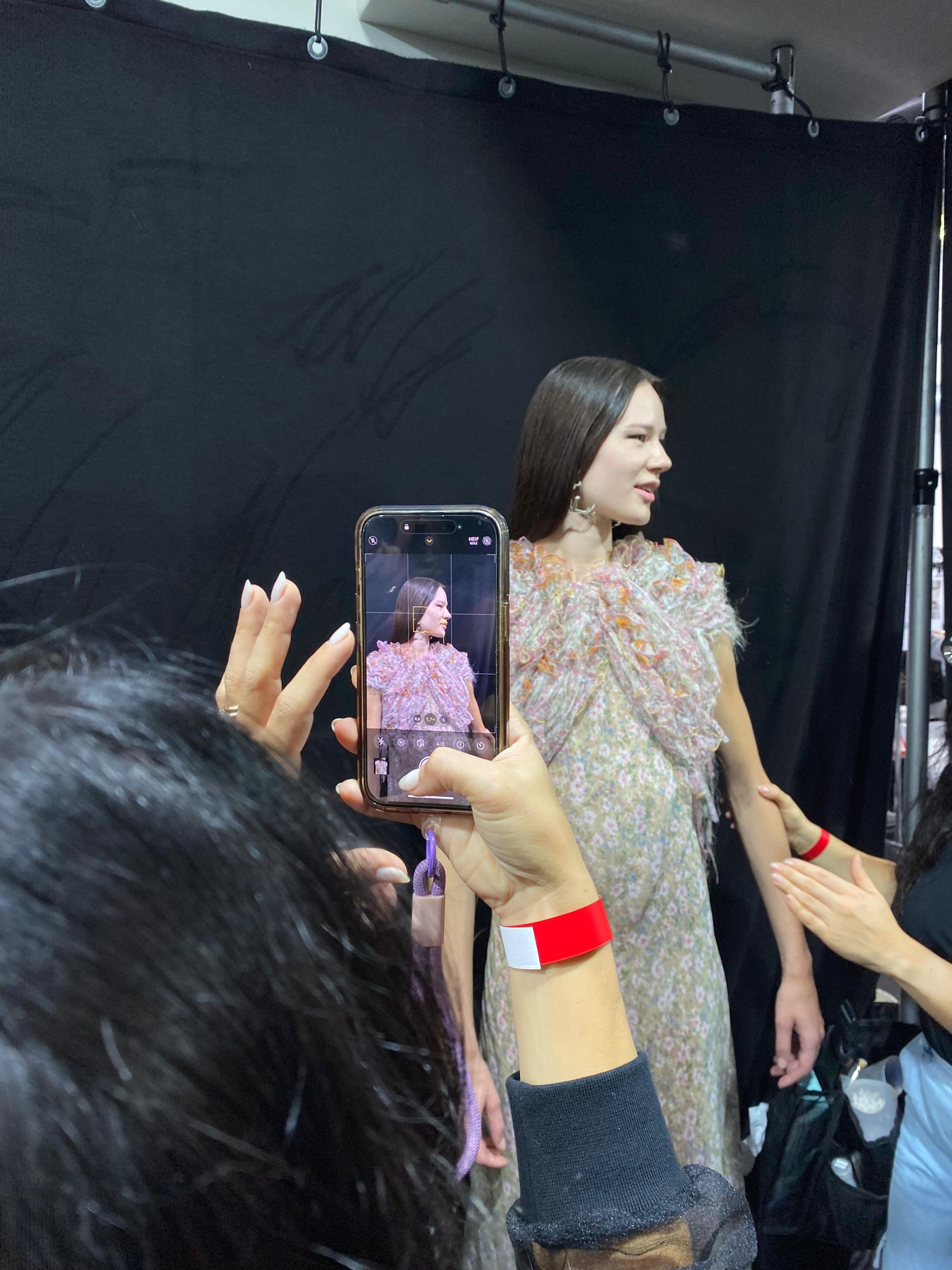 "Per la base" ha aggiunto Magnani, "abbiamo usato Studio Fix fluid in una quantità minima, solo per uniformare l'incarnato e togliere le imperfezioni. Era importante non dare texture alla pelle. Anche la skincare è di MAC Cosmetics. Poi siamo andati a perfezionare, eliminando brufoletti e imperfezioni. Le sopracciglia sono pettinate verso l'altro. Gli occhi sono molto interessanti, con un mascara applicato come lo faremmo ogni giorno della nostra vita, mentre siamo in macchina o mentre ci tuffiamo in metropolitana. Lo applichiamo non come se ce lo stessimo mettendo in un posto safe, nel nostro bagno con la nostra trousse. Che magari sporca leggermente la palpebra". Un make-up perfettamente imperfetto, dunque, che imita la vita e che non si priva di qualche difetto di applicazione, anzi. "Sugli occhi poi va un gloss e l'ombretto Carbon, super matte e super pigmentato. Lo scopo è rafforzare l'imperfezione, non seguire i trend in maniera didattica, uscire dagli schemi e trovare un modo per essere notati. Usciamo dall'idea di lip combo, ad esempio".
