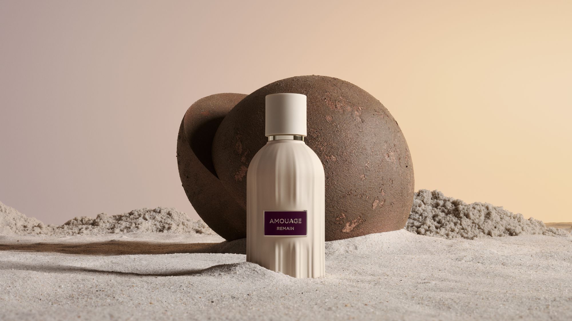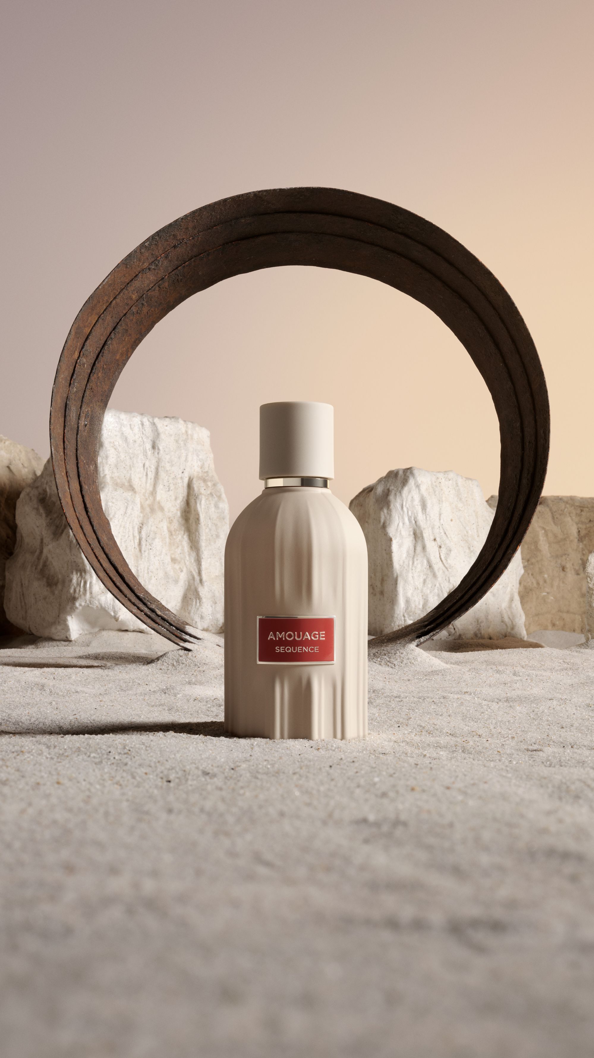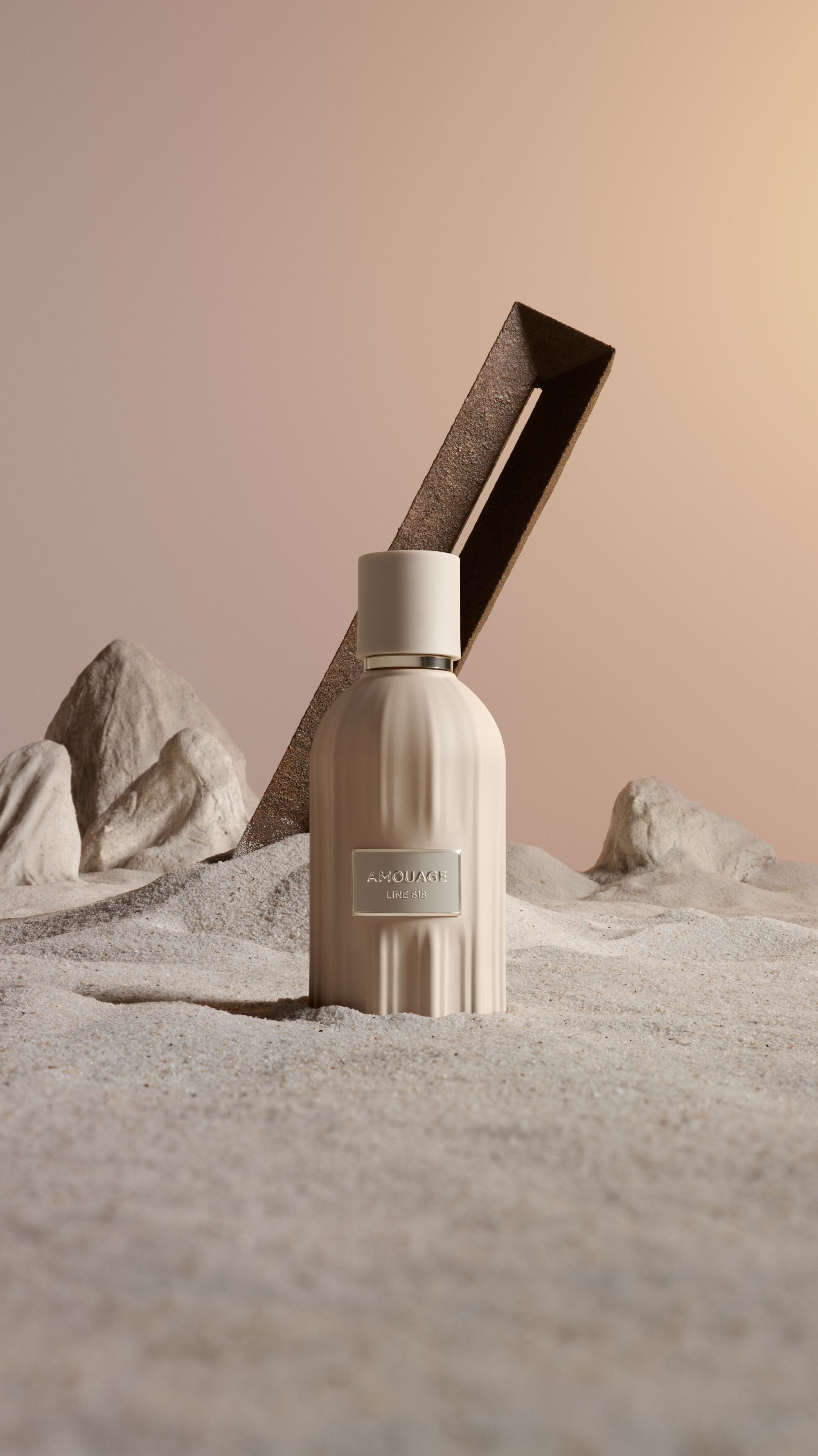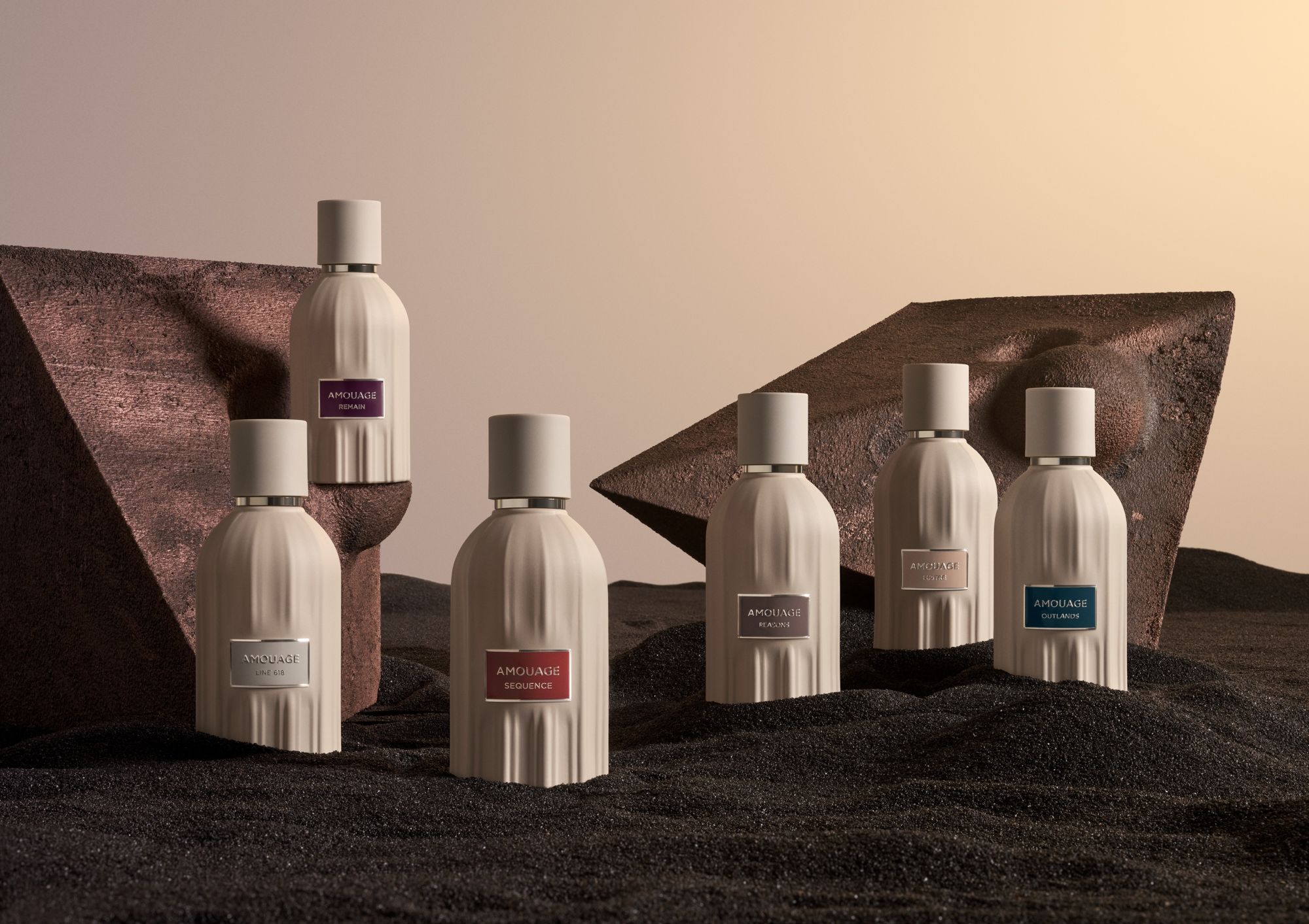 Line 618, Remain e Sequence sono racchiusi nel flacone Essences, creato su misura. Osservato frontalmente, le scanalature verticali evocano le dune del deserto omanita; visto dall’alto, il flacone riproduce l’iconico emblema Amouage a dodici punte. Sotto ogni flacone si trova la medaglia Essences, un oggetto lucente realizzato a mano che riporta le informazioni chiave del profumo e una rappresentazione grafica stilizzata della fragranza. Su ogni confezione, l’immagine della clessidra ricorda l’importanza del tempo. Le composizioni visive di grande impatto dell’artista Louise Mertens, presenti sull’involucro esterno, offrono un’evocazione poetica dei concetti racchiusi nei profumi. La campagna visiva di Essences, fotografata da Louise Mertens, dà vita al linguaggio astratto del tempo attraverso composizioni severe di ispirazione brutalista. Ogni immagine presenta monoliti scultorei color bronzo che rispecchiano l’identità geometrica delle fragranze e fungono da espressioni fisiche della struttura del tempo.