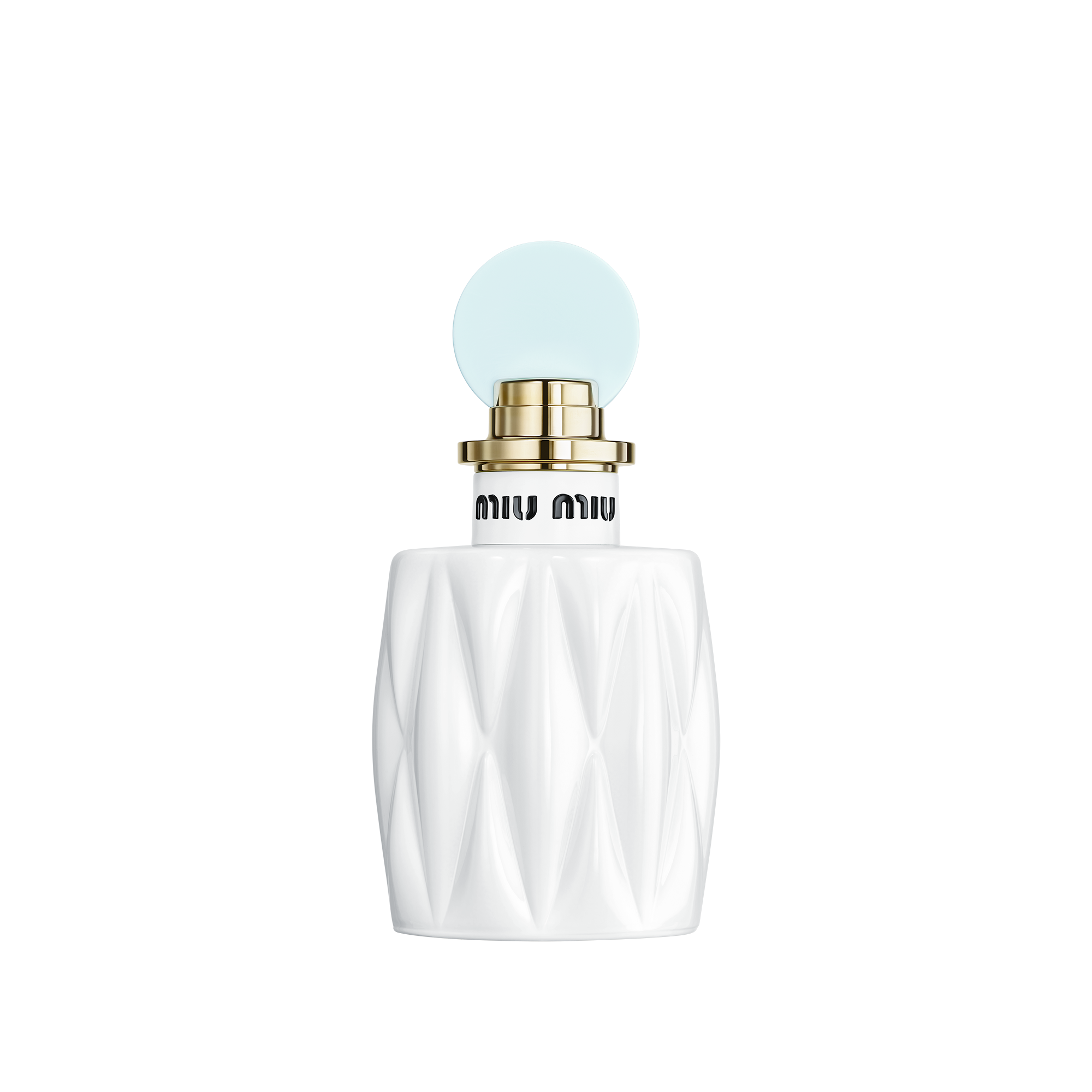 Rivisitando i codici iconici di Miu Miu, il flacone di Fleur de Lait richiama l’iconica texture matelassé delle borse in pelle della Maison. Il vetro opaco diventa bianco latte. Morbido al tatto, luminoso allo sguardo. Un anello con etichetta Miu Miu bianca e nera adorna il collo del flacone, coronato dall’iconico tappo azzurro ispirato alle paillettes del brand.