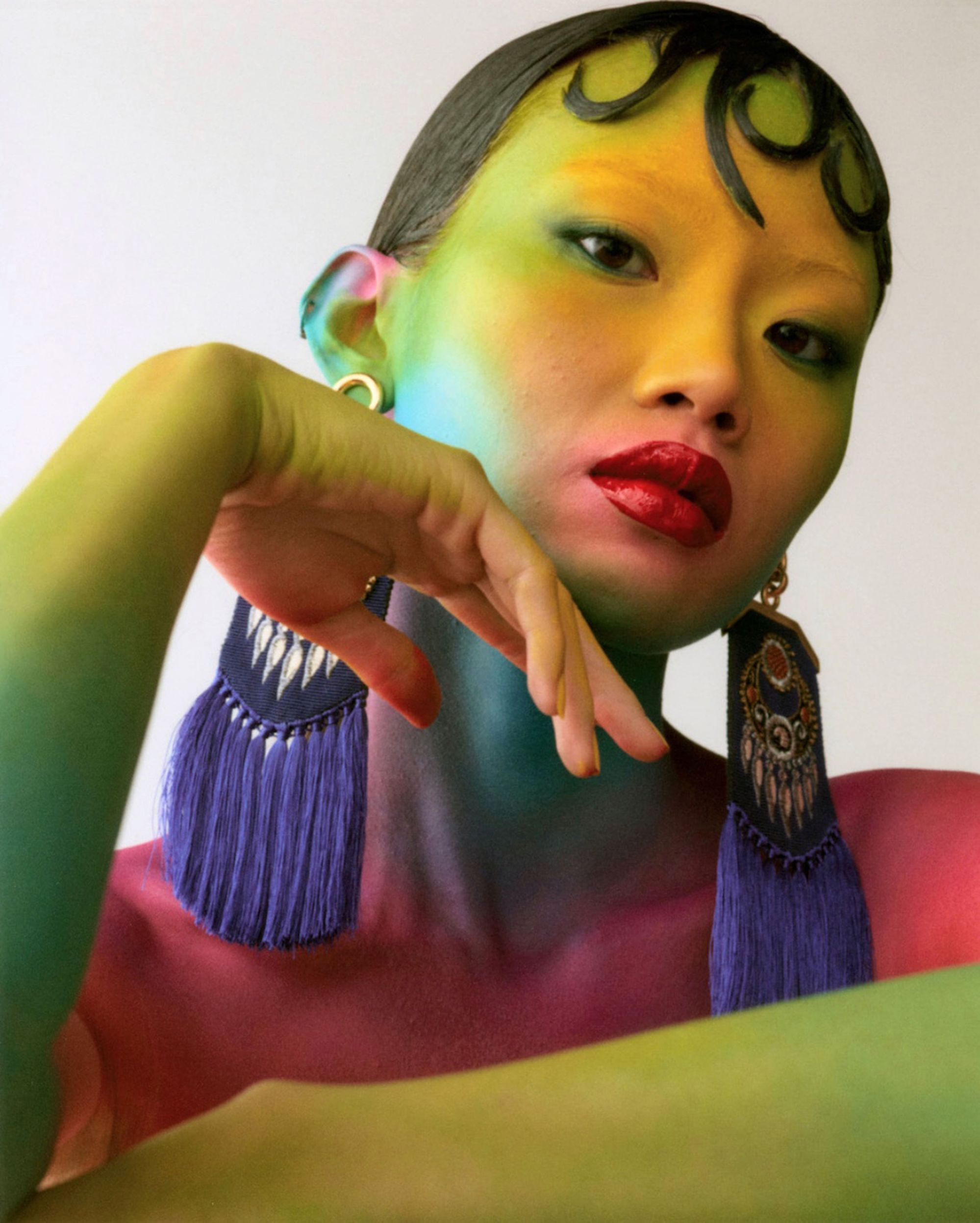 Parlare di me mi imbarazza sempre un po’, ma col tempo ho imparato che è giusto dare valore al proprio talento e alla propria visione! Se dovessi riassumere il mio approccio al make-up in tre parole sceglierei: pensato, colorato, creativo. Pensato perché cerco sempre di studiare bene i volumi del volto sulla quale sto lavorando, i colori e quello che voglio raccontare con il mio make-up. Colorato perché lascio poi che la creatività faccia il suo corso e i colori sono spesso la strada che prendo. Può essere un colore unico o più colori accostati o mischiati per crearne di nuovi. Creativo perché la cosa che mi piace del mio stile è che non so mai dove andrà a finire. Spesso inizio con un’idea, ma se qualcosa attorno mi colpisce o un raggio di luce o riflesso cade sul volto della mia modella allora cambio strada, e quello che avevo pensato si trasforma in tutt’altro.