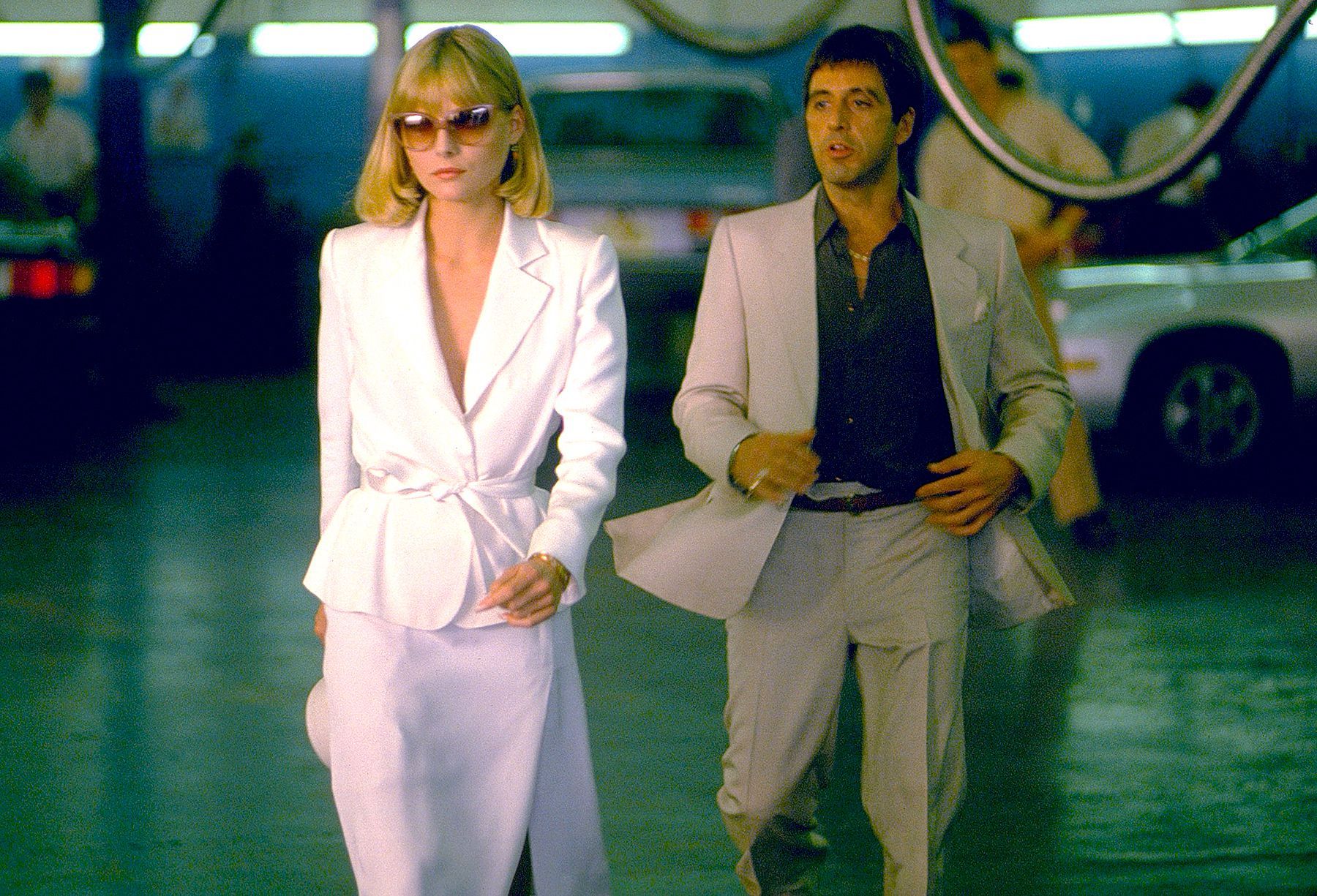 Come? Con tre pezzi gessati di colori chiari, basati su quelli degli originali gangster degli anni 30’, mixati con camicie hawaiane dai toni accesi (tornati prepotentemente di moda nel menswear) per Pacino; mentre per la Pfeiffer (una delle attrici più belle di sempre) con tailleur con spacchi e spalline, con slip dress in seta o raso che fanno riferimento agli anni ’30, ma ricordano Roy Halston e Versace e sopravvivono negli scatti Instagram di molte blogger e influencer.