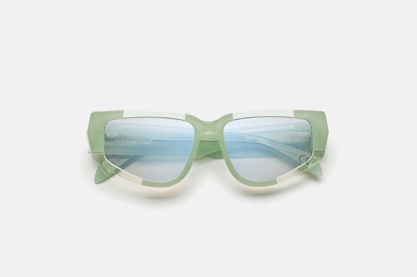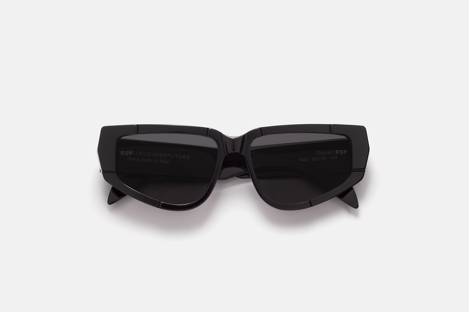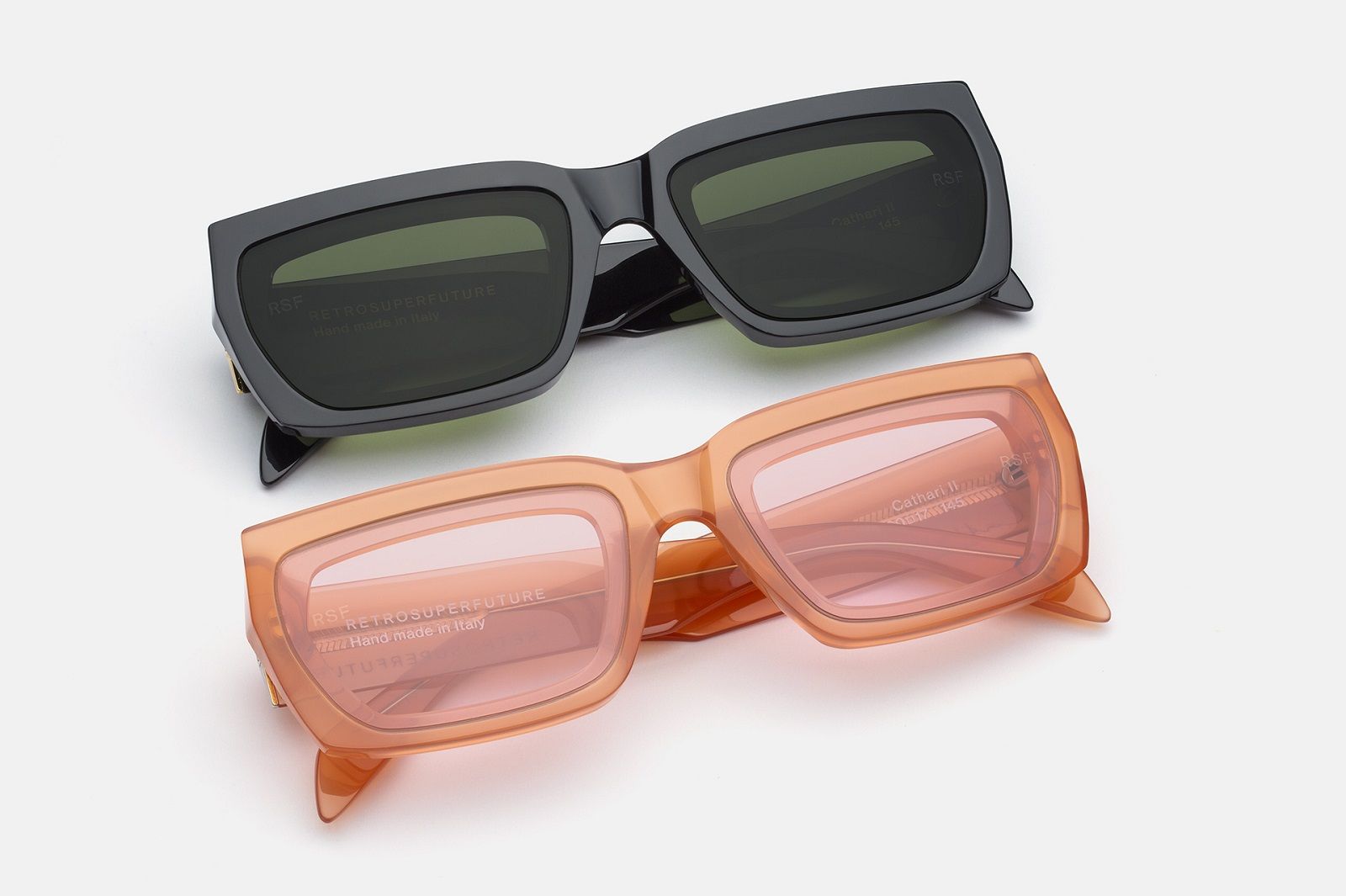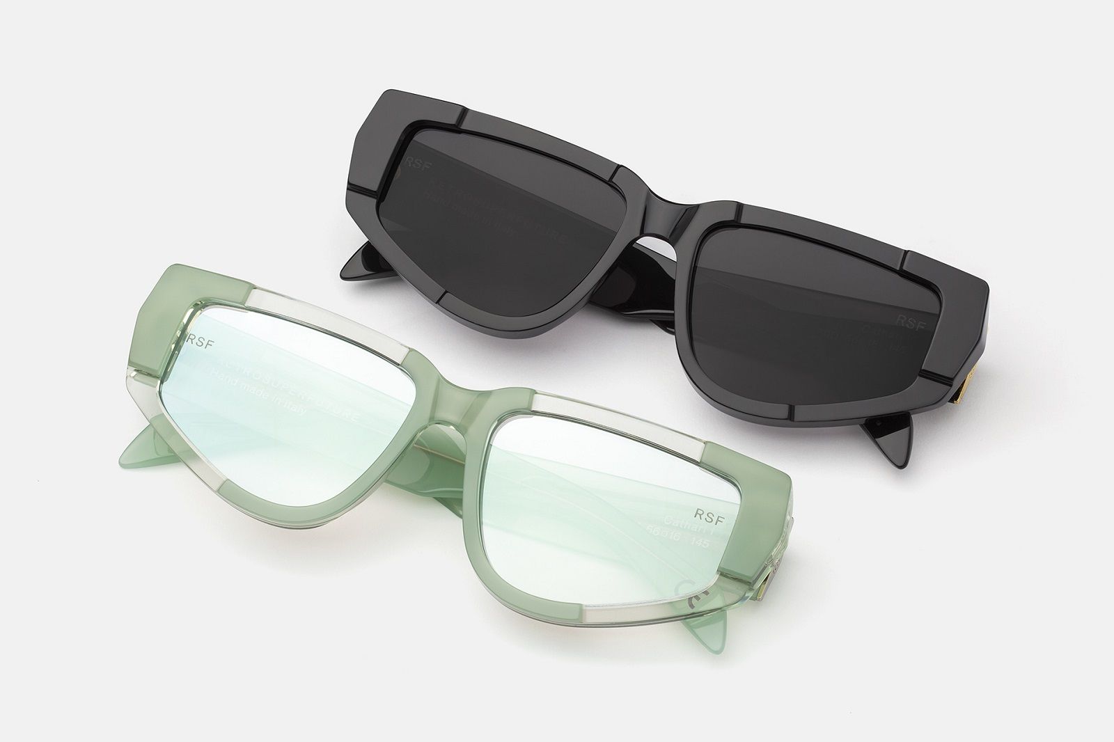 L’estetica sperimentale di Cathari ha influenzato le due silhouette degli occhiali da sole che hanno un design più audace, compatto e massiccio, fatto di spessi strati di acetato che scolpisce la montatura con una varietà di sfaccettature di angoli acuti e tagli geometrici. Oltre all’acetato nero senza tempo rivela la costruzione scultorea della montatura, gli occhiali sono disponibili in versione verde menta chiaro e arancione ruggine.