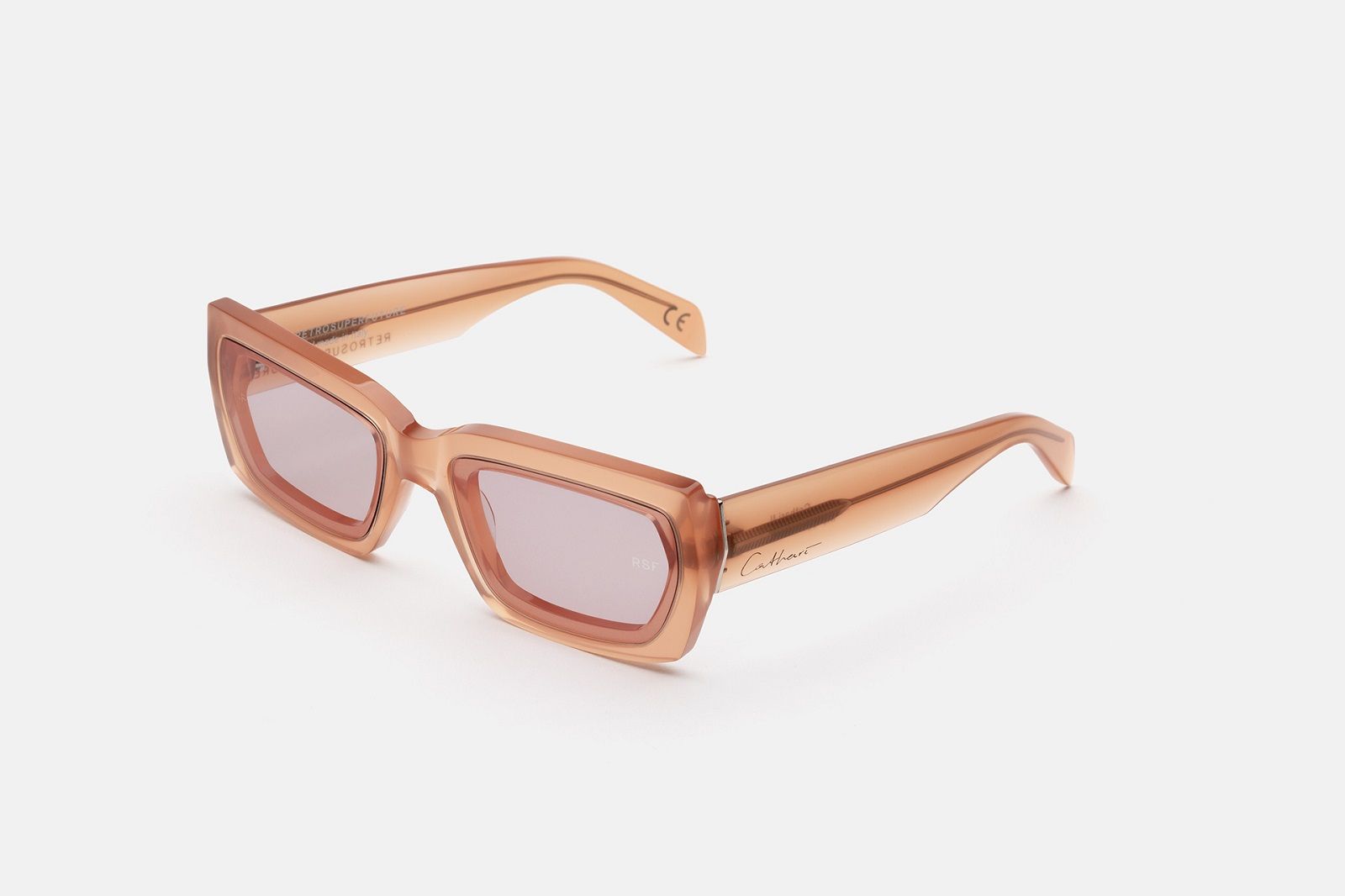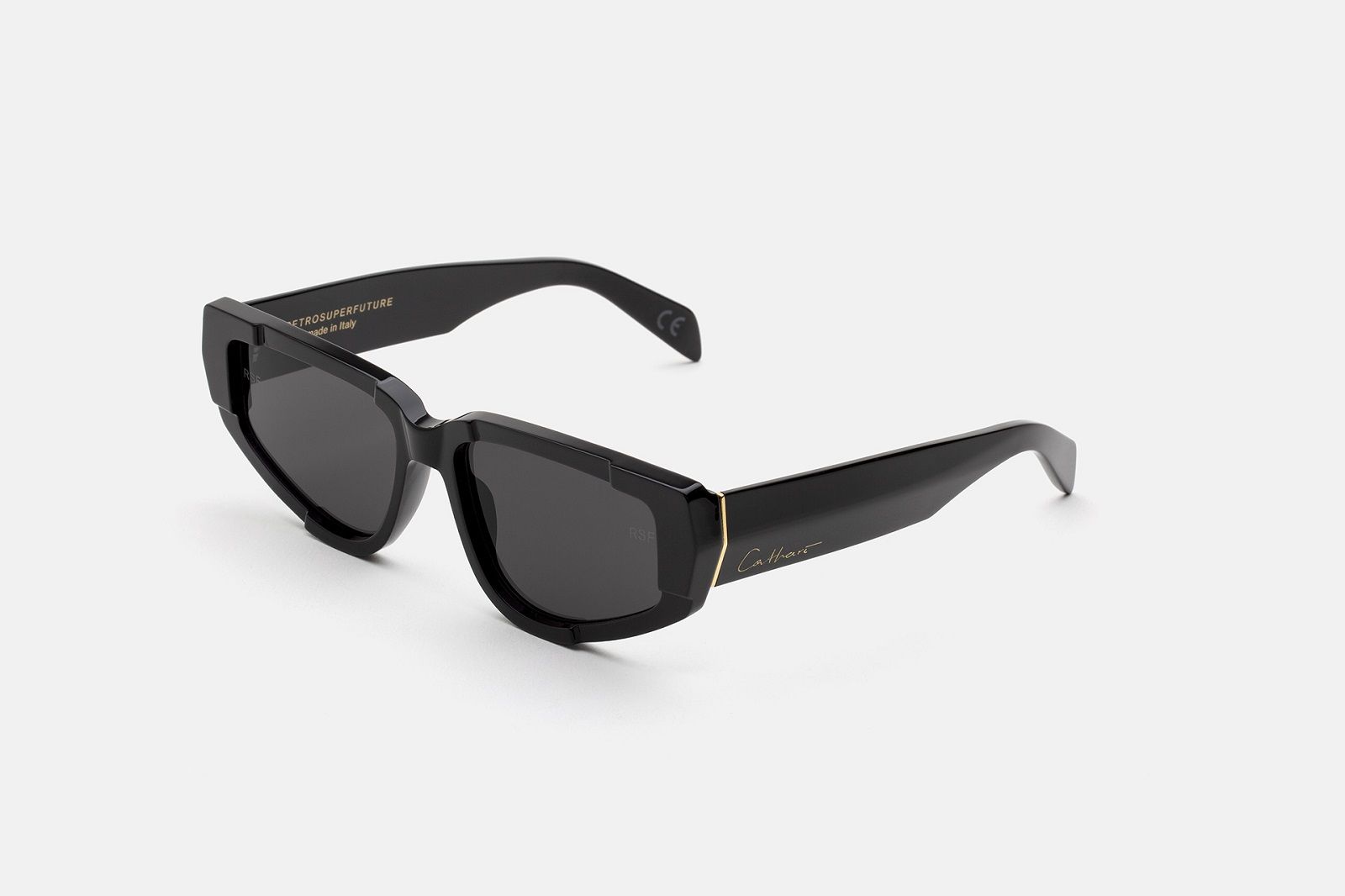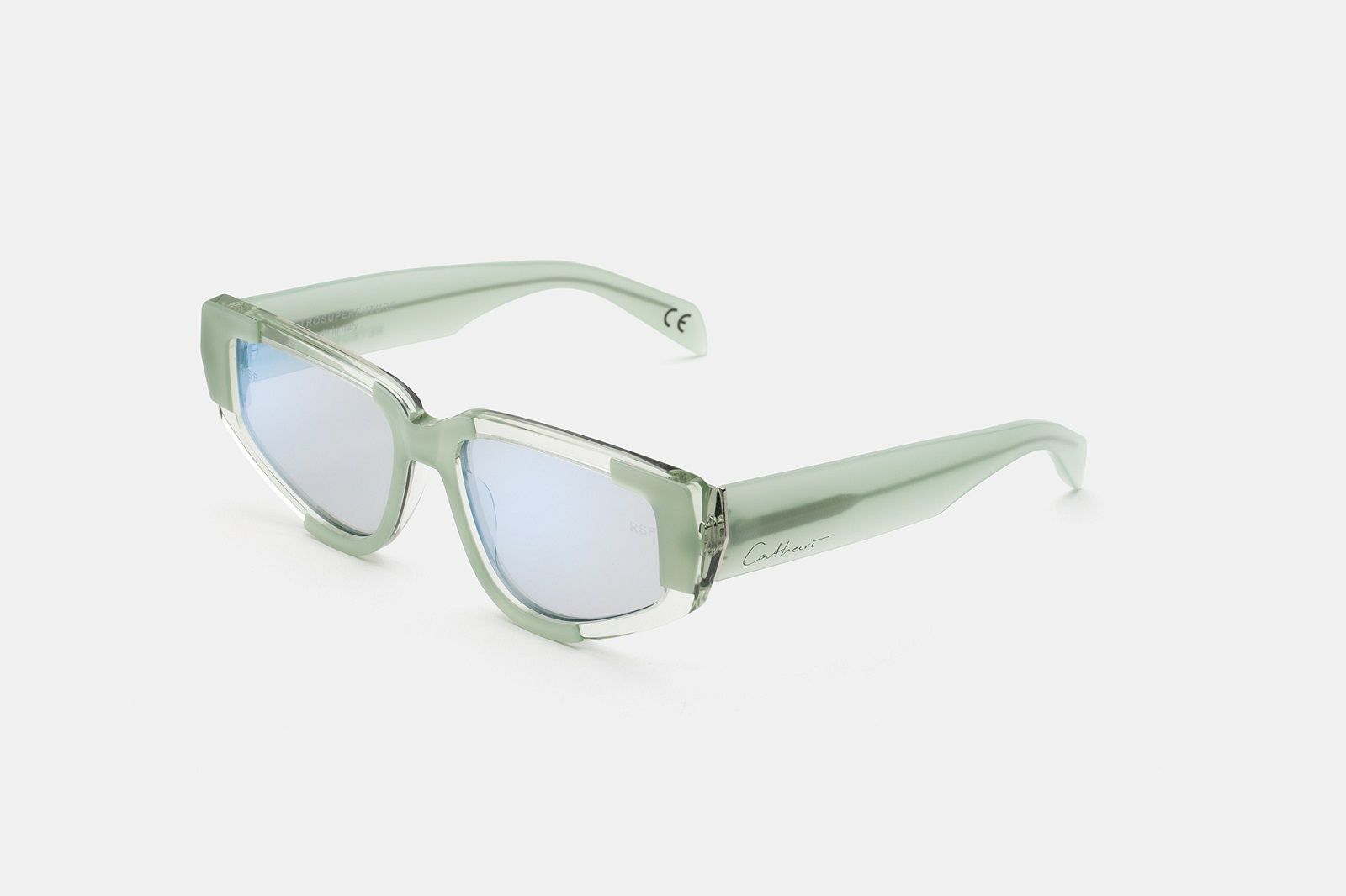L’estetica sperimentale di Cathari ha influenzato le due silhouette degli occhiali da sole che hanno un design più audace, compatto e massiccio, fatto di spessi strati di acetato che scolpisce la montatura con una varietà di sfaccettature di angoli acuti e tagli geometrici. Oltre all’acetato nero senza tempo rivela la costruzione scultorea della montatura, gli occhiali sono disponibili in versione verde menta chiaro e arancione ruggine.