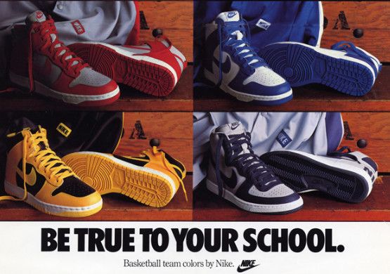 La Dunk fonda le sue origini nel colore. Durante l’estate 1985 Nike rilasciò il “Be True to Your School” pack, dando la possibilità a tutti di indossare i colori della propria squadra preferita dalla testa ai piedi. La Dunk era la protagonista del College Colors program, introducendo per la prima volta così tanto colore sul campo da basket.