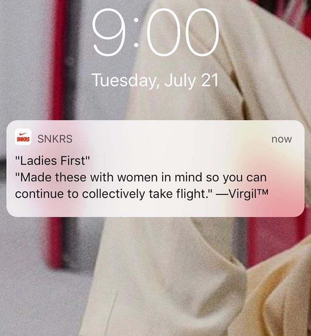 Questa la notifica apparsa sull’app SNKRS per il lancio della silhouette. Il messaggio condiviso da Virgil Abloh evidenzia la decisione del brand di modellare la Air Jordan IV sulla scala taglie W (women), e questo inevitabilmente comporta una difficoltà di acquisto per le taglie più grandi.