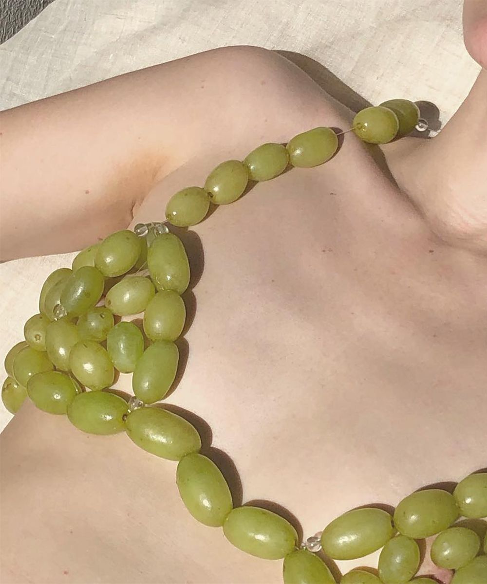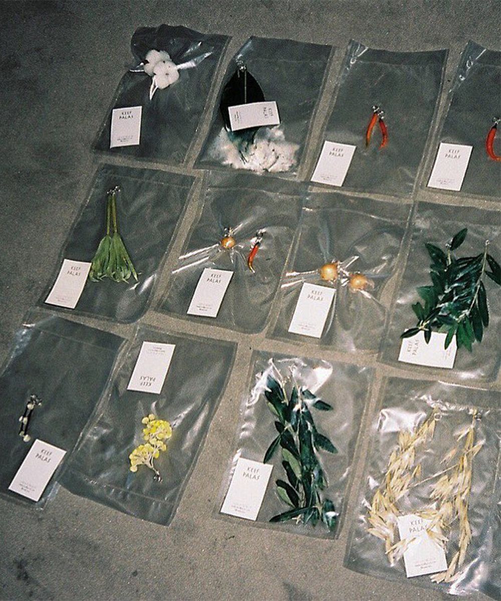 Con il progetto Keef Palas il concetto di effimero persiste, perchè il duo delle co-fondatrici Claire O’Keefe e Eugenia Oliva propone gioielli che durano solo un breve lasso di tempo, in armonia con la natura e in contrapposizione con il consumo del fast fashion. Al posto di oro e pietre il brand usa tutti gli ingredienti della dieta mediterranea per la sua Ephemereal Collection: aglio, noci, cozze, uva, olive e peperoncini sono protagonisti di gioielli e accessori che sembrano fatti sulla spiaggia o sull’erba, intrecciando quello che la natura offre. La differenza è che Keefe li mette sottovuoto e li spedisce in tutto il mondo.