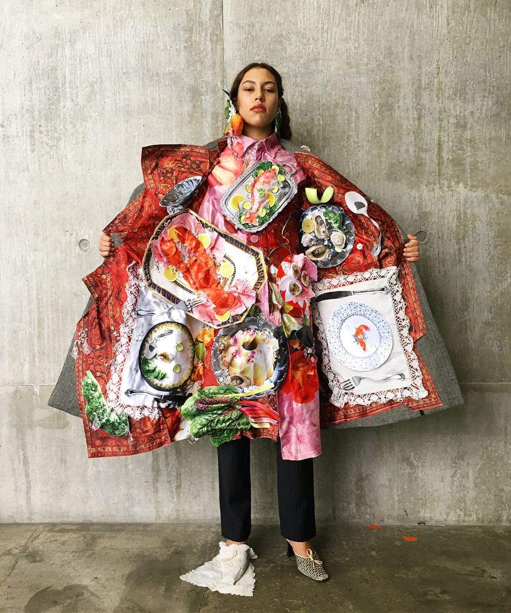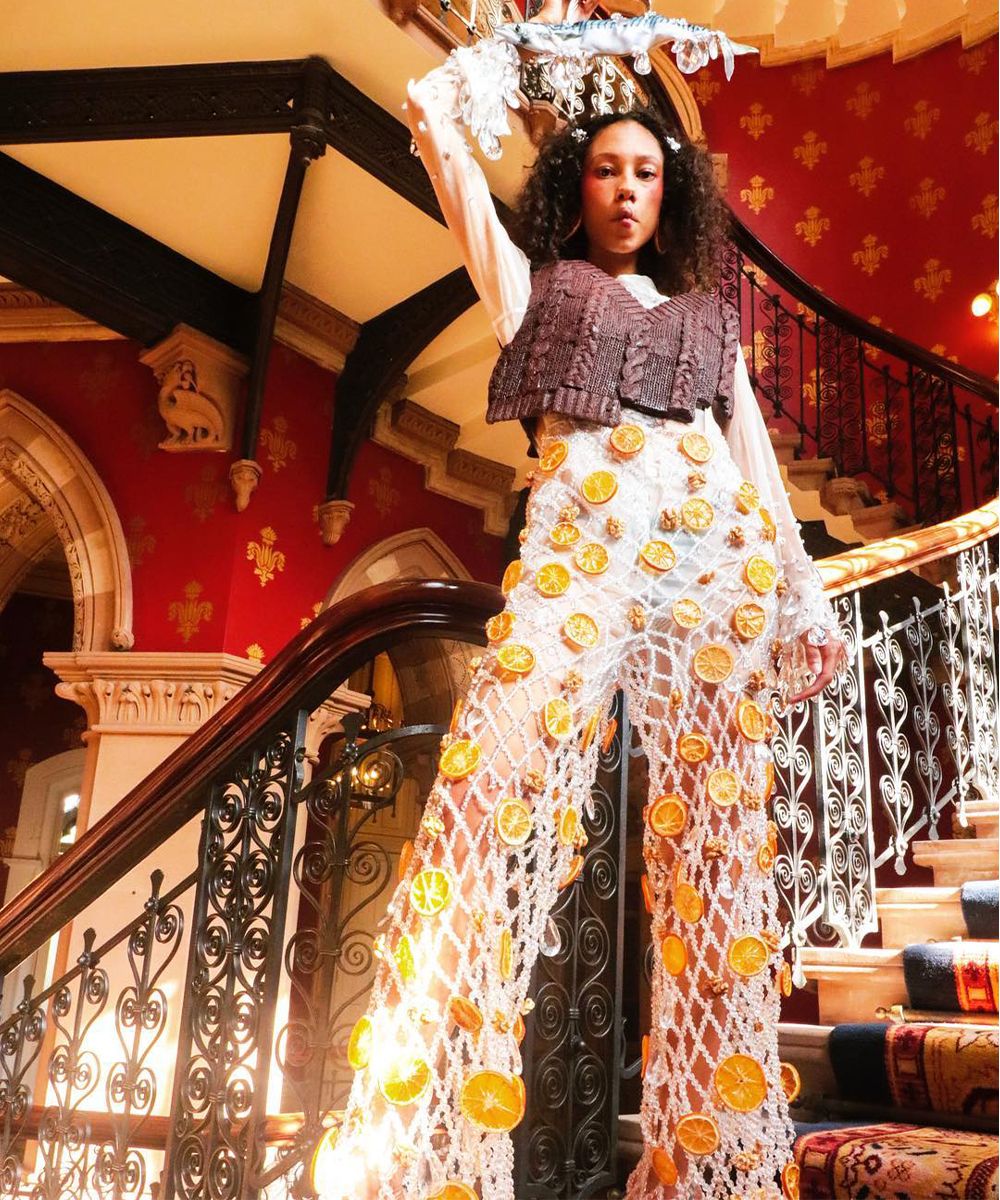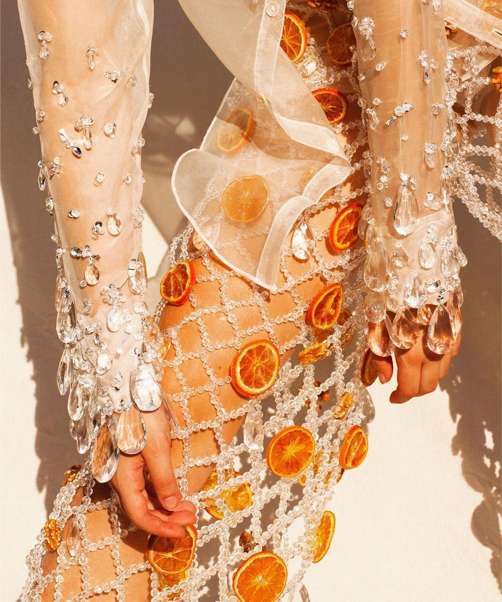 Diplomata alla prestigiosa Central Saint Martins di Londra, accademia di moda frequentata da grandi creativi come Stella McCartney e Riccardo Tisci, Leeann Huang è ora parte del team creativo di Maison Martin Margiela. Per la sua collezione primavera/estate 2019, l’artista asiatica punta sulla sua passione per la cucina e sull’effimera esistenza del cibo: maglie in gelatina e cioccolato e pantaloni brillanti con arance e noci incastonate nella resina. Gli indumenti possono essere mangiati lanciando così un messaggio di rottura contro il consumismo.