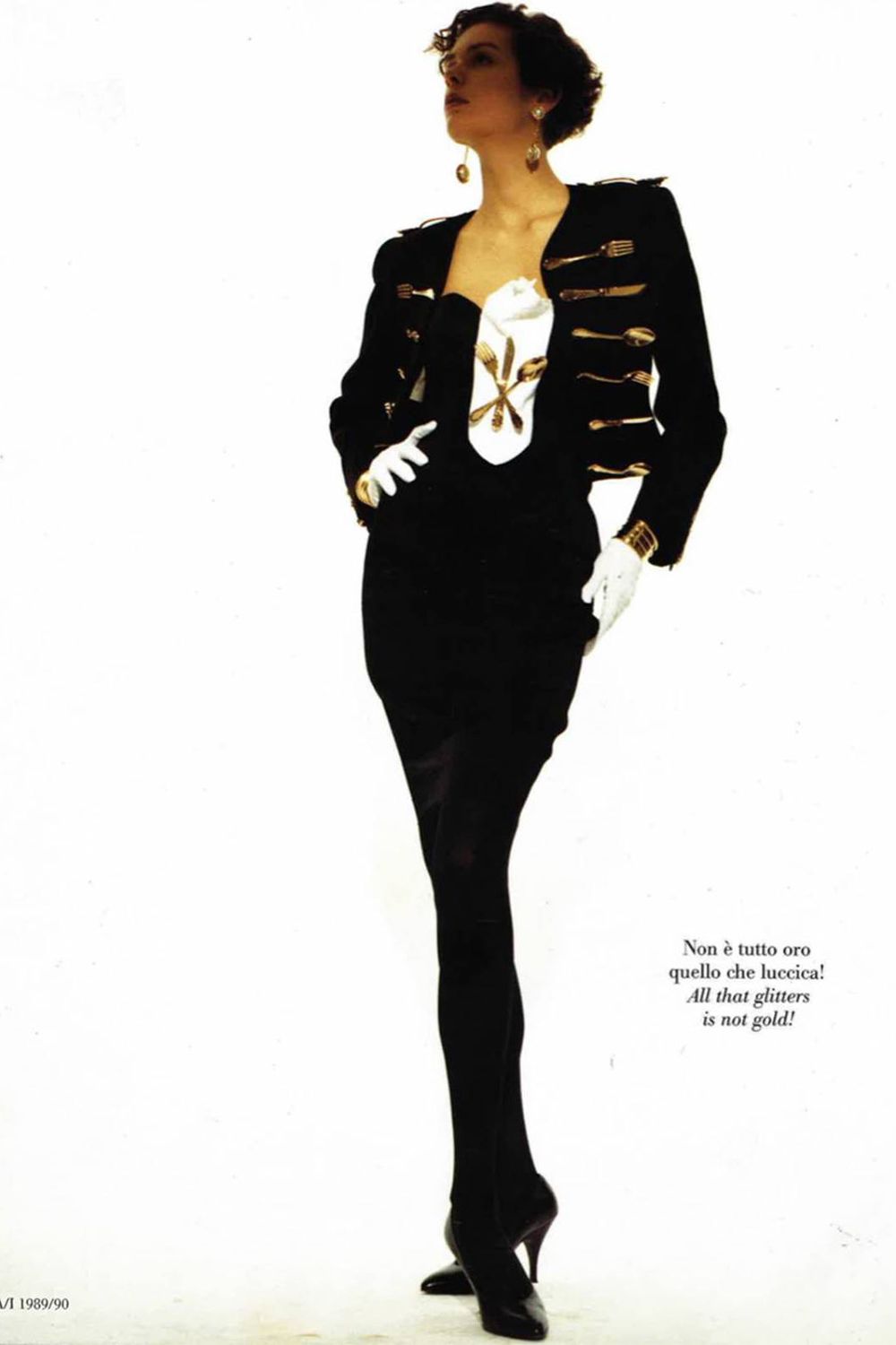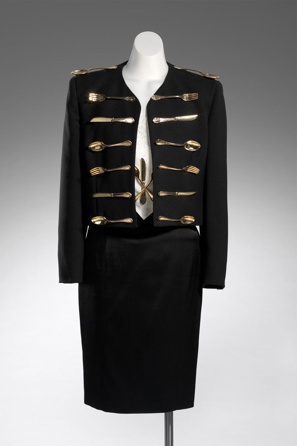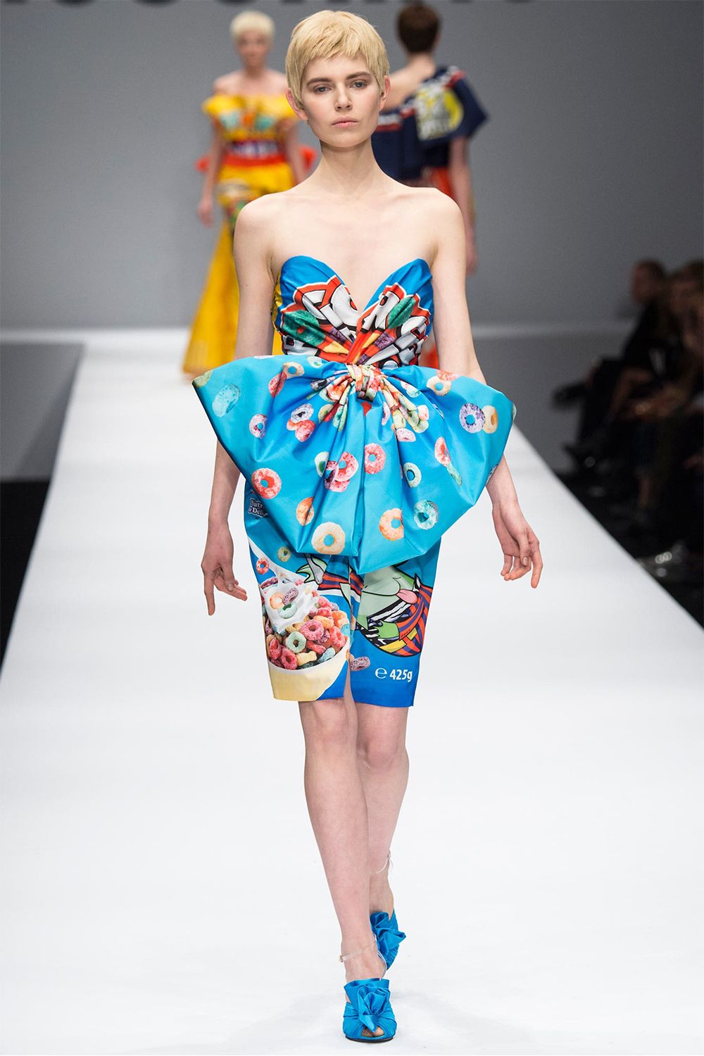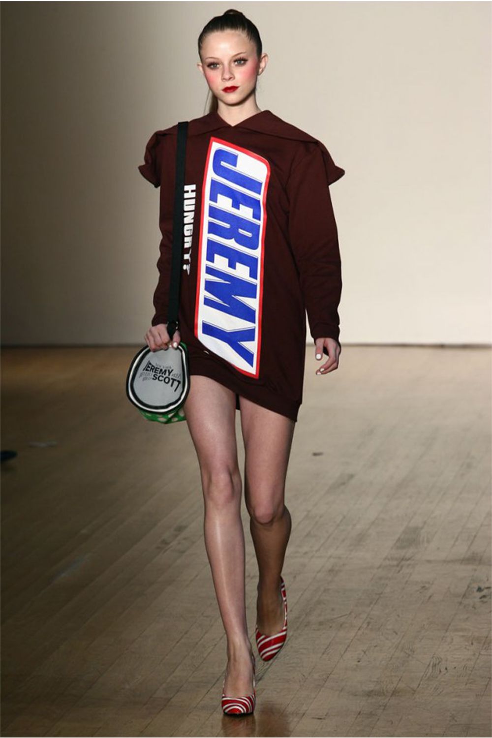 Momento storico, catartico, geniale quello segnato dalla prima sfilata di Jeremy Scott alla direzione creativa di Moschino nel 2014 a Milano. Il designer americano utilizza le iniziali del brand fondendole all’icona pop dell’insegna del Mc Donald’s, seguendo l’idea del Junk Fashion con borse, scarpe e accessori vari. Scott fa poi lo stesso con diversi brand celebri del settore food. Altro fenomeno di unione tra moda e cibo, con valore identitario per giunta, perchè lo stesso Franco Moschino, fondatore della casa di moda italiana, aveva proposto il connubio con una “dinner jacket”, dunque giacca da sera, indossata per le cene di gala secondo il galateo, dalla quale pendevano forchette e coltelli. Ottimo lavoro di heritage e di inventiva, nonchè di ironia.