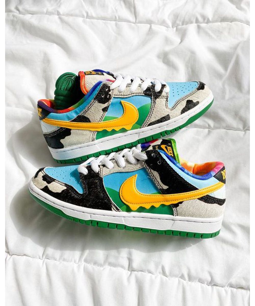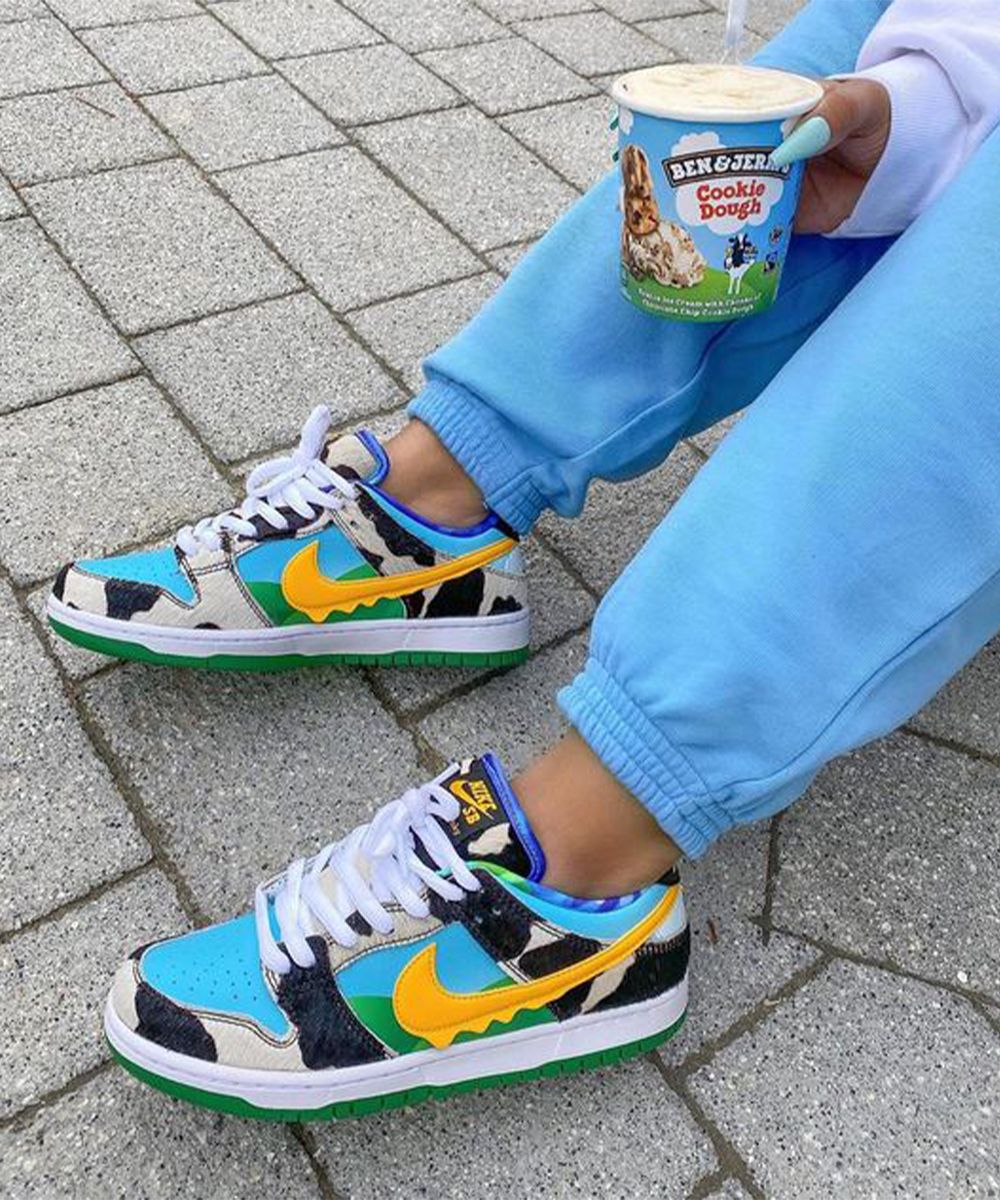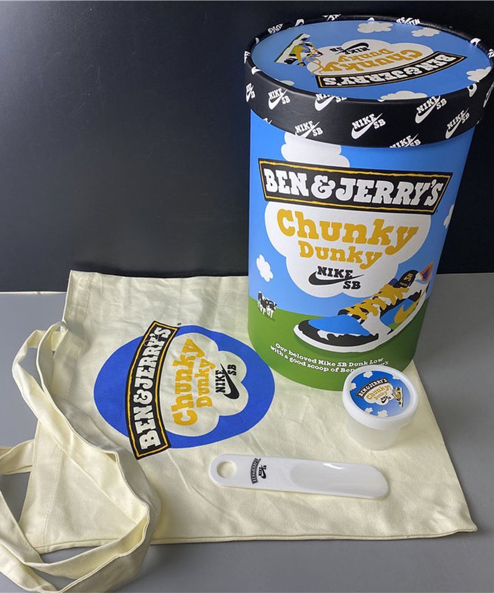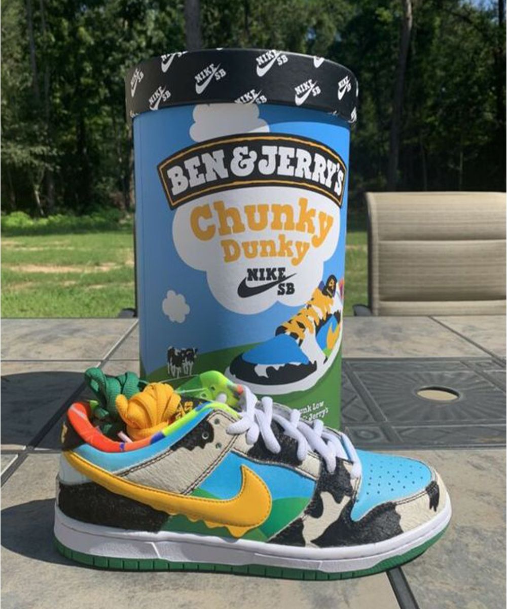 “From Licks to Kicks”, è lo slogan della coloratissima e introvabile collaborazione tra Nike SB ed il marchio di gelati americano Ben & Jerry. Le scarpe sono ispirate alla confezione del gelato Chunky Monkey e rievocano il cielo blu, le mucche da latte e i prati verdi da cui viene prodotto il gelato americano. “Sono la cosa più euforica che puoi metterti ai piedi”, afferma il comunicato di Ben & Jerry. L’euforia in effetti c’è stata, in quanto le scarpe sono ad ora disponibili sono in resell al modico prezzo di 6,500$.