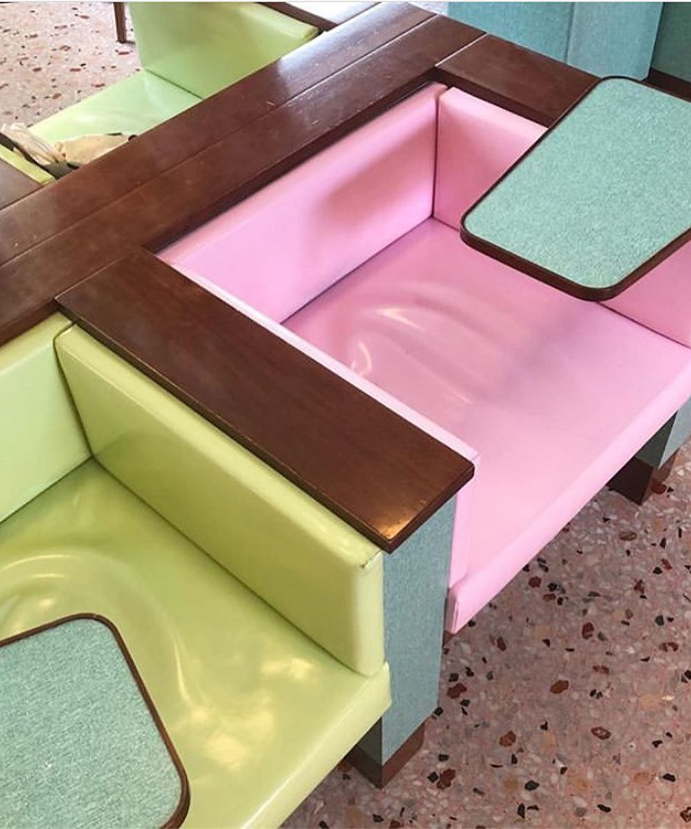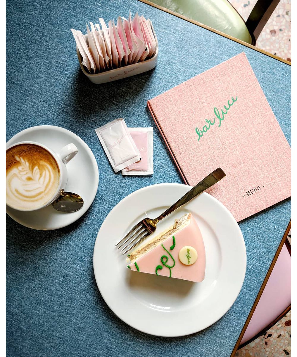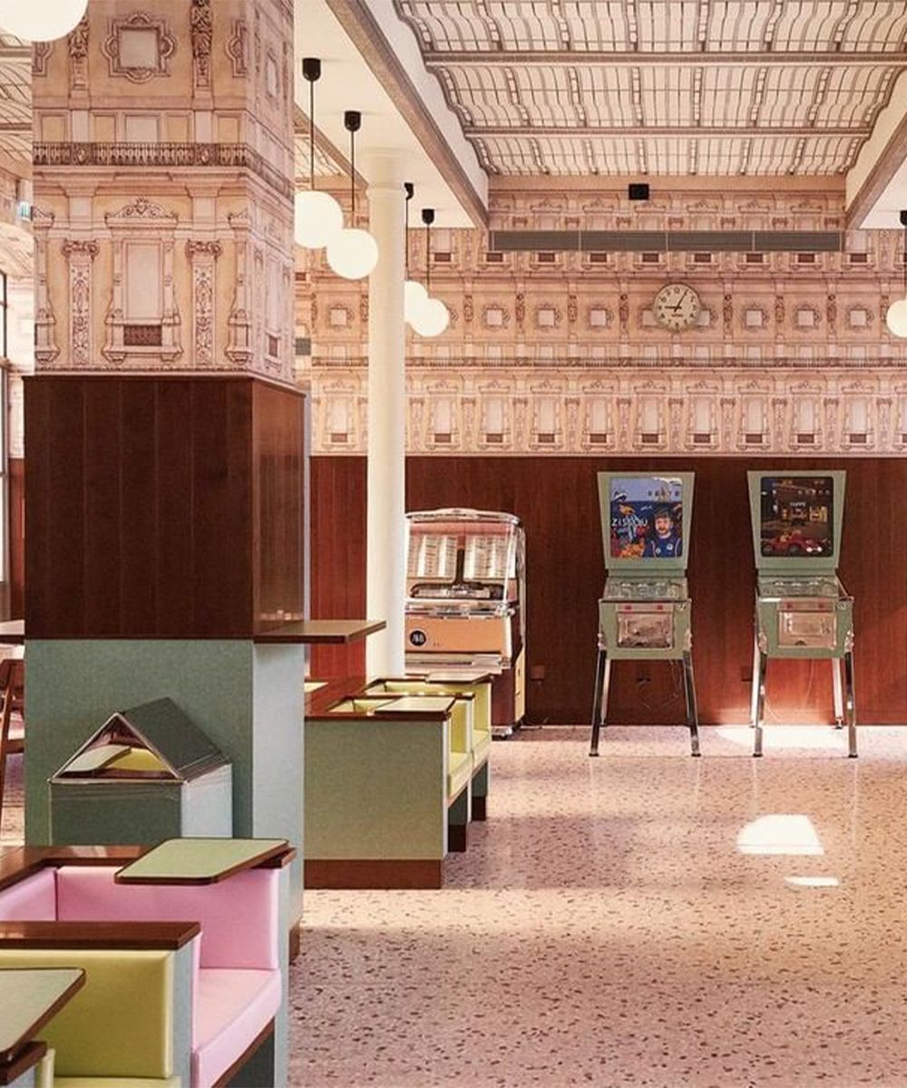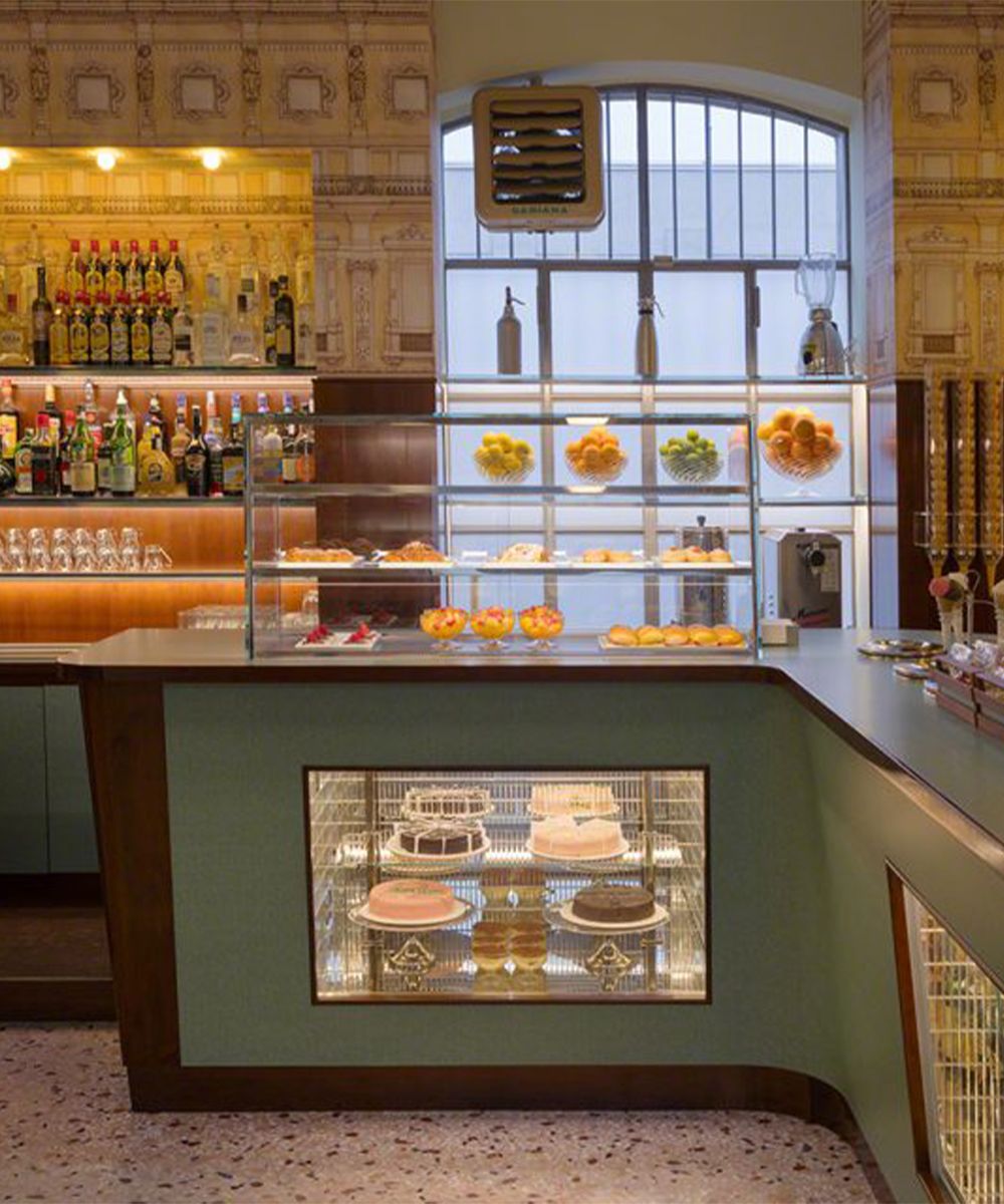 Del logo della casa milanese non c’è neanche l’ombra, in questo bar/bistrot in Fondazione Prada, ma la firma tagliente del brand e dell'iconico Wes Anderson è nell’aria. La gamma cromatica, gli arredi, le sedute, il pavimento e i pannelli di legno ricordano la cultura popolare e l’estetica della Vecchia Milano, a cui Anderson si era già ispirato per il cortometraggio Castello Cavalcanti (2013), e in cui Miuccia Prada è cresciuta. Al bancone sono serviti caffè, e pasticcini della Pasticceria Marchesi di Milano, di cui il Gruppo Prada è proprietario.