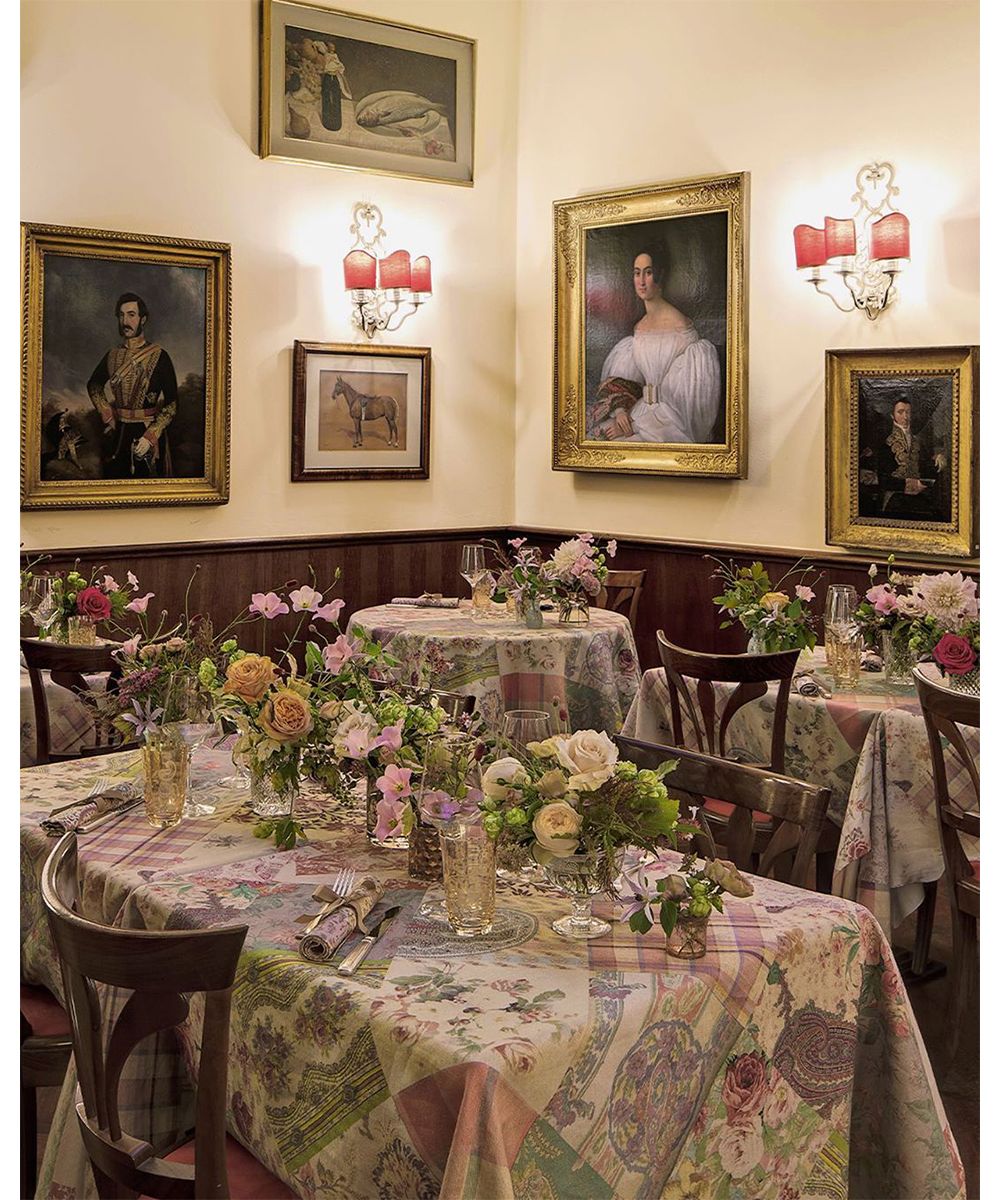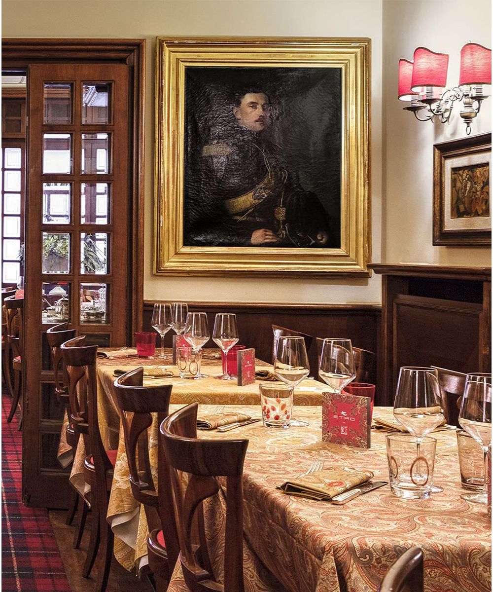 La nota trattoria milanese dove le ricette tipiche del capoluogo lombardo incontrano le origini toscane dei proprietari ha trasformato in occasione della Fashion Week 2019, una delle sue sale interne in un un allestimento speciale personalizzato con tessuti di arredo e complementi della linea ETRO Home. Tovaglie con stampe storiche ricoprivano i tavoli mentre vasi in vetro e argento, centrotavola e quadri dell’Ottocento dalla collezione privata della famiglia adornavano gli interni.
