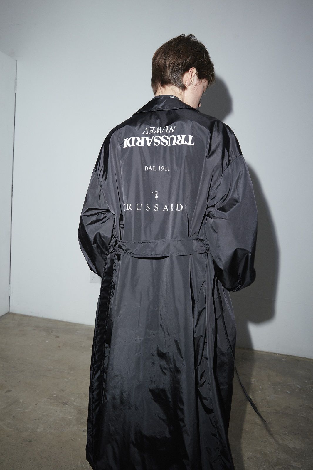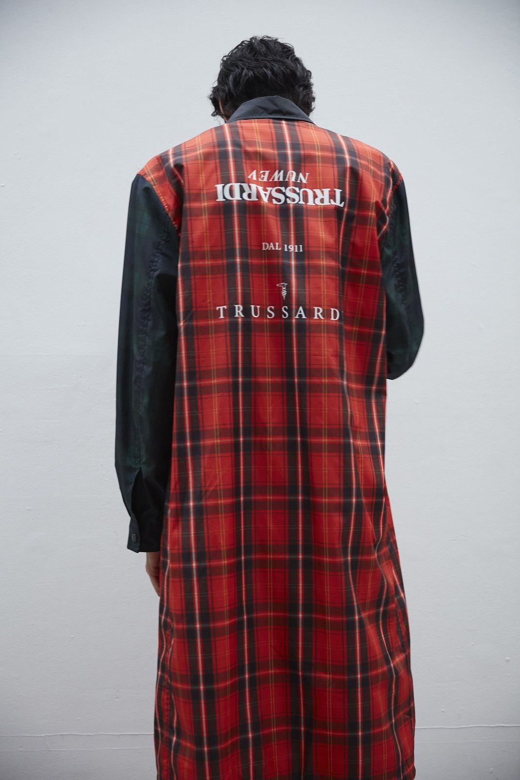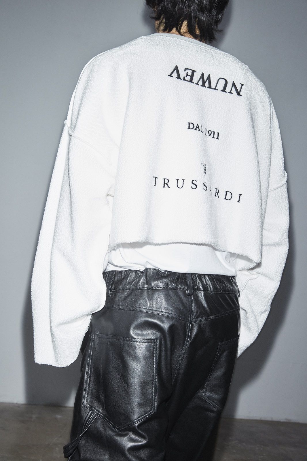 La collezione, intitolata NUWEV, si ispira alle contro-culture italiane degli anni ‘80 e ‘90, al periodo del post-punk e new wave, rievocando il mood e lo stile dei ragazzi del mondo del clubbing e dei video-bar di Napoli e Roma. Il risultato è un guardaroba essenziale, urbano e minimal, fatto di capi in pelle, denim e pattern in tartan. Le silhouettes sono oversize, le giacche in morbida pelle si alternano a capispalla in nylon, maglie super leggere in lino effetto rete, slip dress, maxi trench, felpe cropped, shirt dress e jeans dal fit rilassato. Il dettaglio sovversivo? Elementi iconografici e loghi storici Trussardi sono rovesciati. Completano i look maxi shopper minimal, clutch effetto nuvola e slides in pelle.