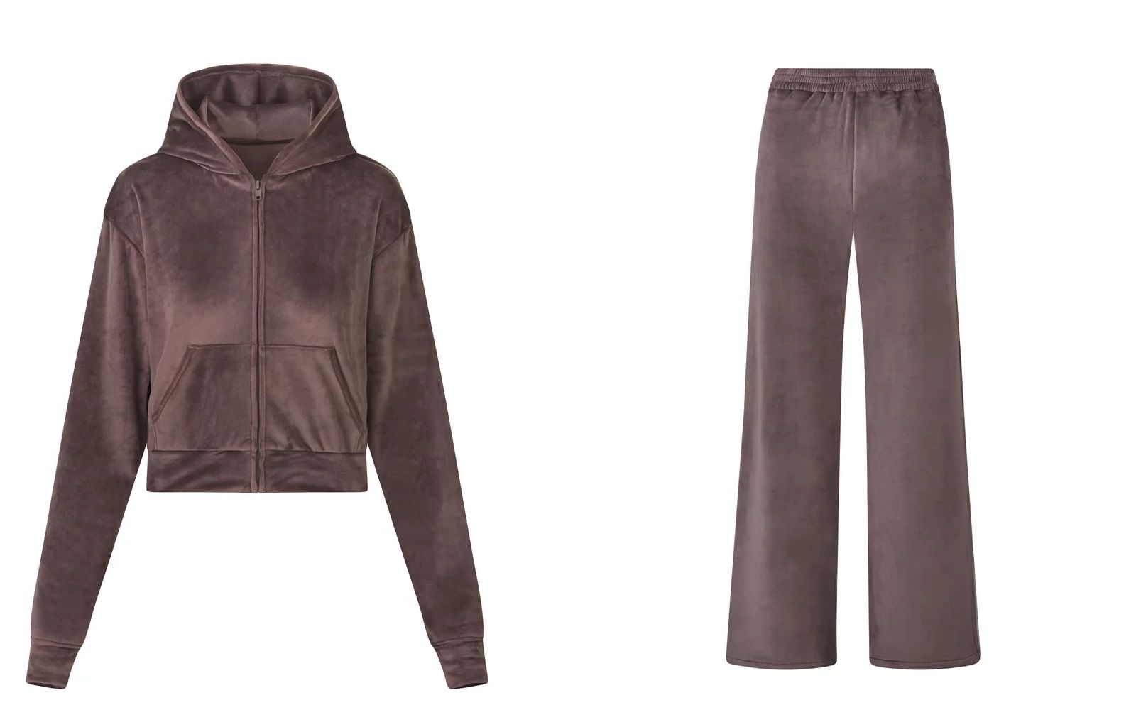 La linea Skims Velour, che sarà lanciata il 21 ottobre in esclusiva sul sito di SKIMS, comprende sette pezzi: hoodie, joggers, top a fascia, lunghe vestaglie e pantaloni larghi. Tutti declinati in quattro colori tra cui scegliere: miele, terra di Siena, fumo e ametista.