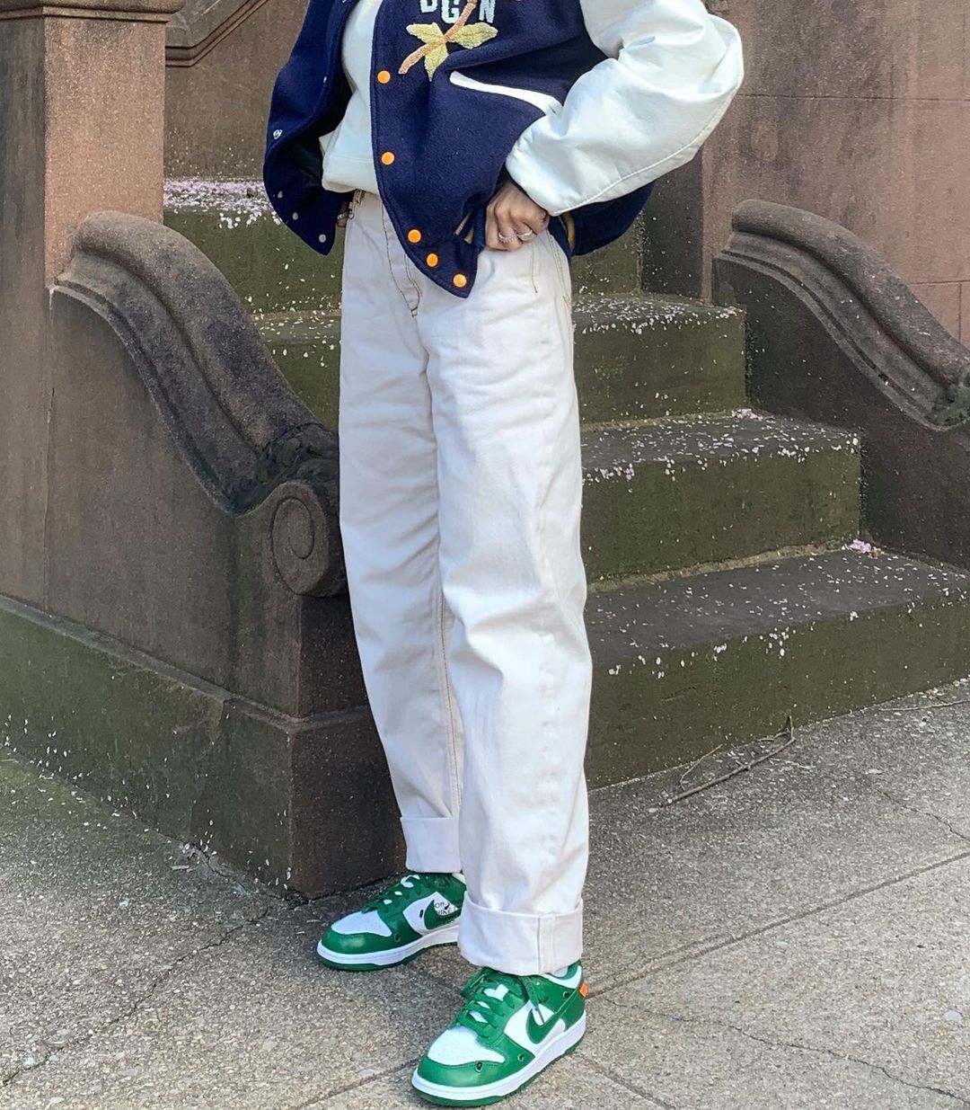 Il capo must have per eccellenza all'interno dei nostri armadi, il comodo, versatile e senza tempo denim si abbina perfettamente alla silhouette della Nike Dunk. Che sia high-waist o low-waist non importa, l'importante è che la gamba sia dritta e i volumi morbidi: mai indossare le Dunk con gli skinny jeans!
