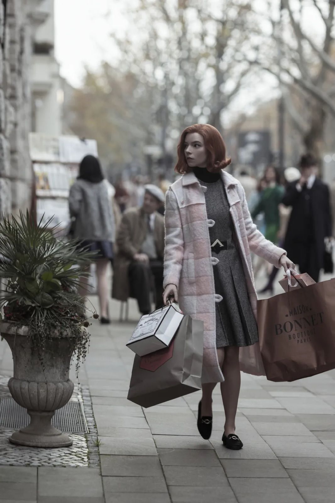 Il caschetto rosso è l’elemento che meglio identifica il personaggio interpretato da Anya Taylor-Joy. Nel corso delle puntate, grazie ad una serie di parrucche, la chioma naturale castano scuro dell’attrice si declina in look molto distanti tra loro.