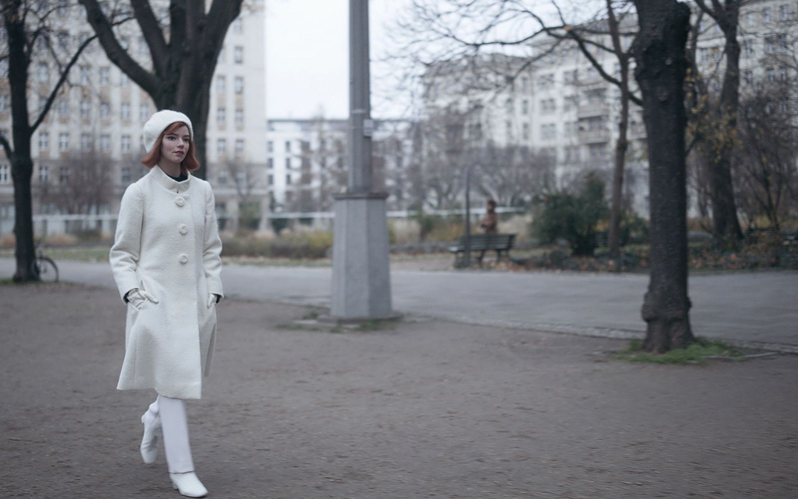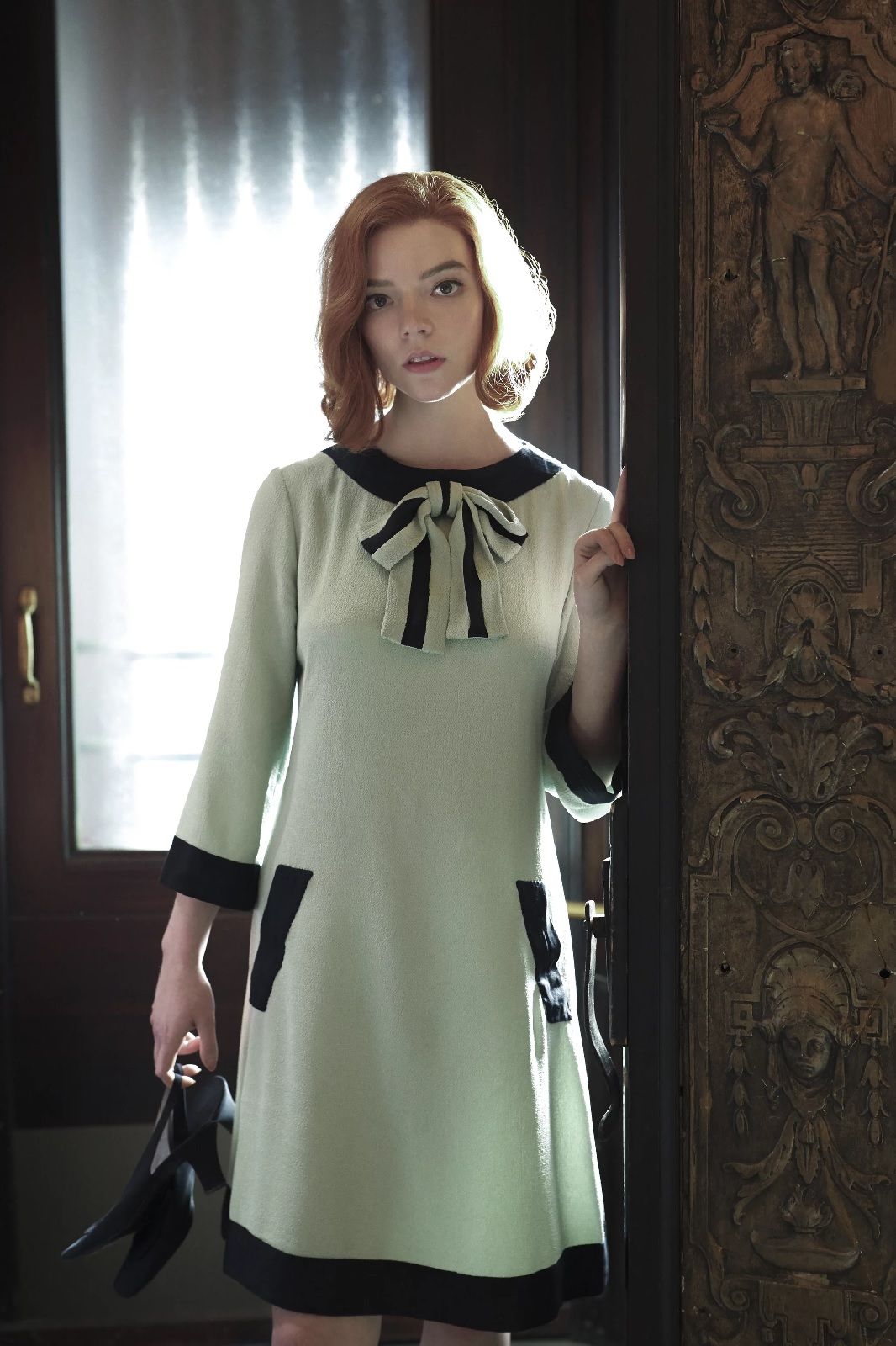 Uno dei maggiori punti di forza di La regina degli scacchi è l’estetica anni ’50-’60 che coinvolge ogni aspetto della serie, dalle location ai costumi, dal beauty alla soundtrack. Grazie all’attenta sceneggiatura di Allan Scott e da Scott Frank, Beth è un personaggio brillantemente complesso, in bilico tra intelligenza ed eccentricità, così emancipata e lontana da stereotipi, da non sacrificare il proprio amore per la moda per evitare di essere giudicata frivola dai suoi avversari o dalla società. Il suo guardaroba, creato ad arte da Gabriele Binder, si ispira alle outsider dell’epoca come Jean Seberg o Edie Sedgwick, ma ci sono anche riferimenti allo stile Biba e a Jackie Kennedy e Audrey Hepburn.