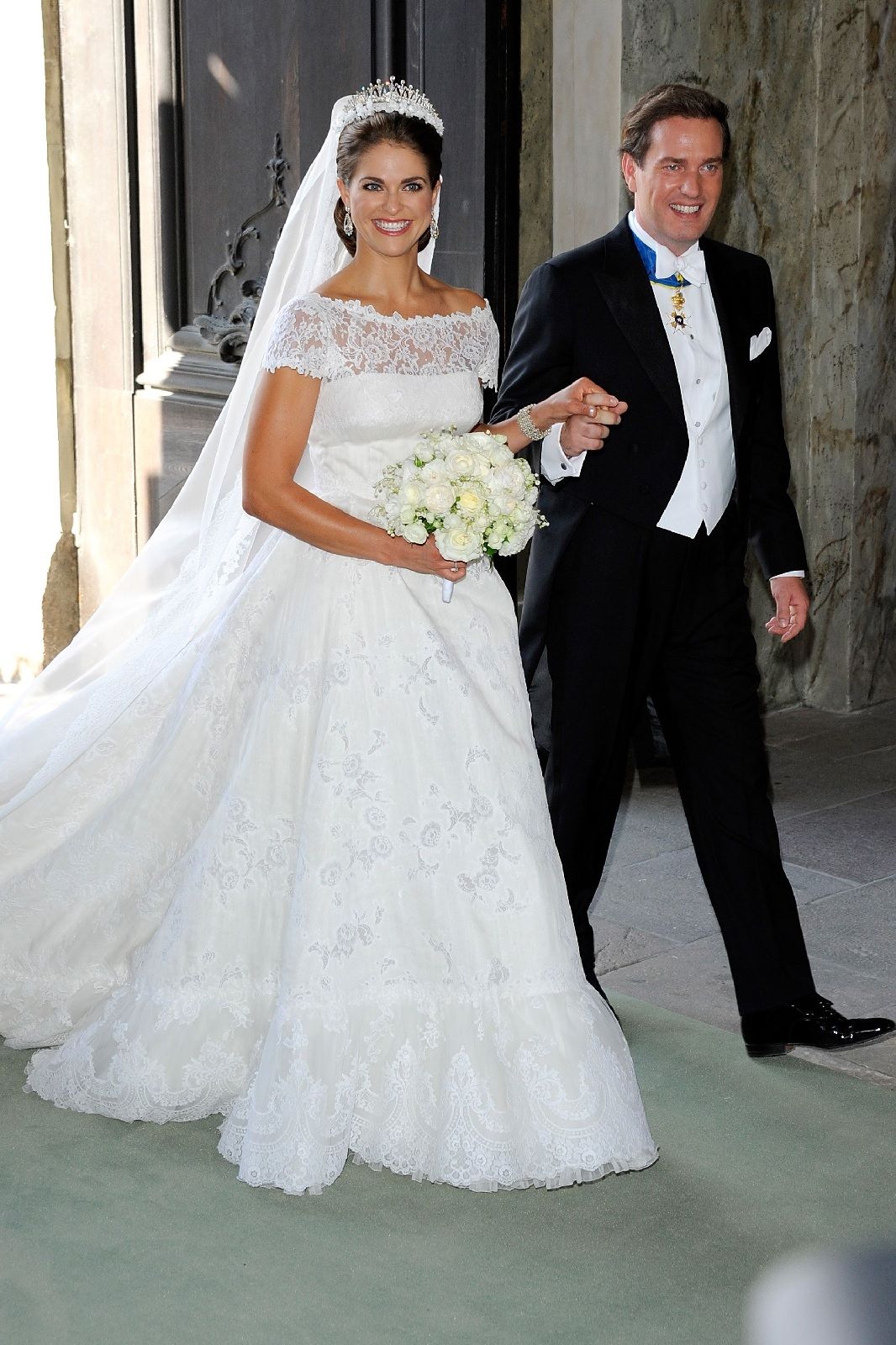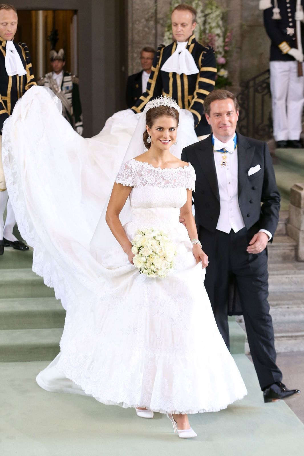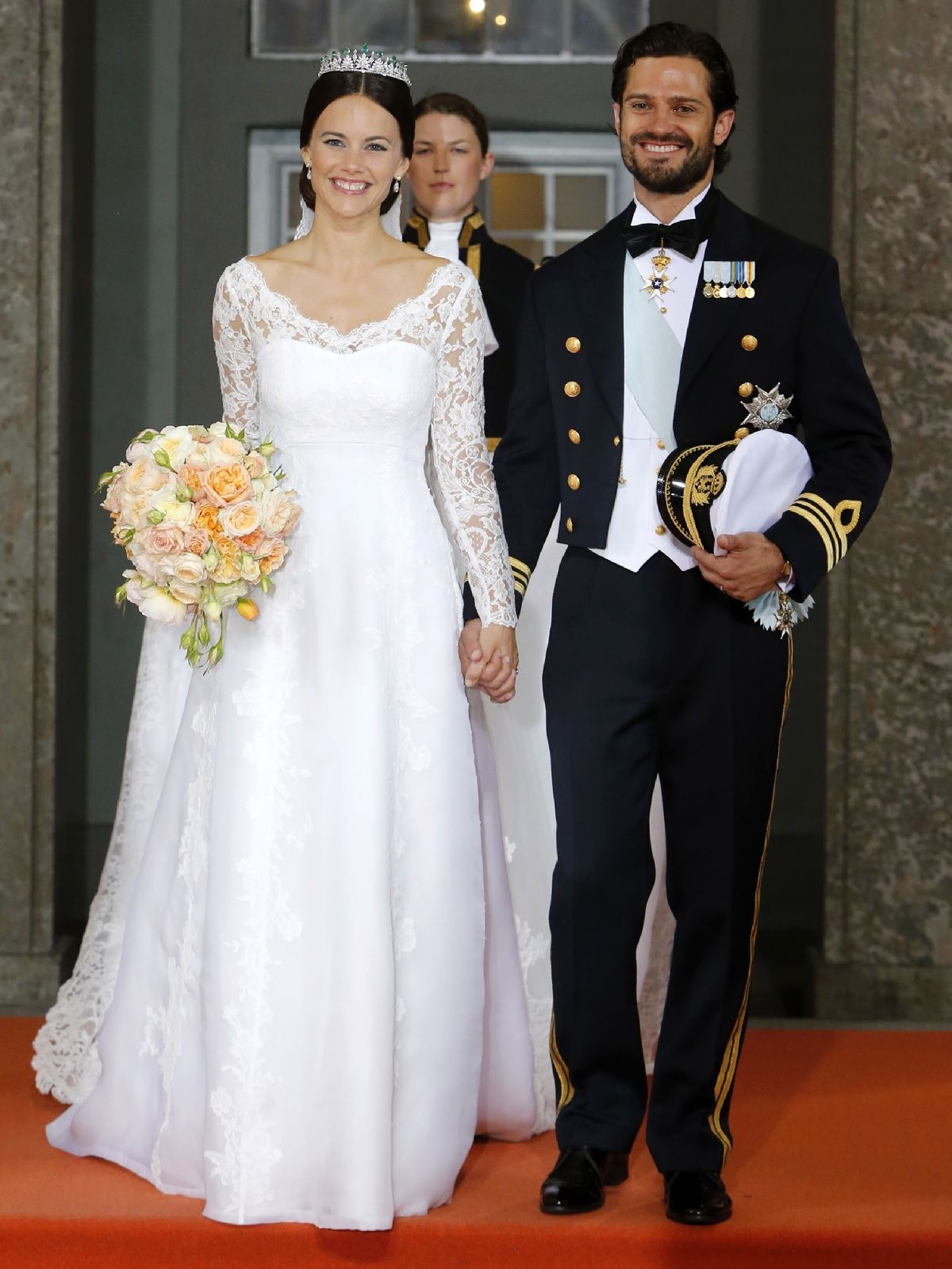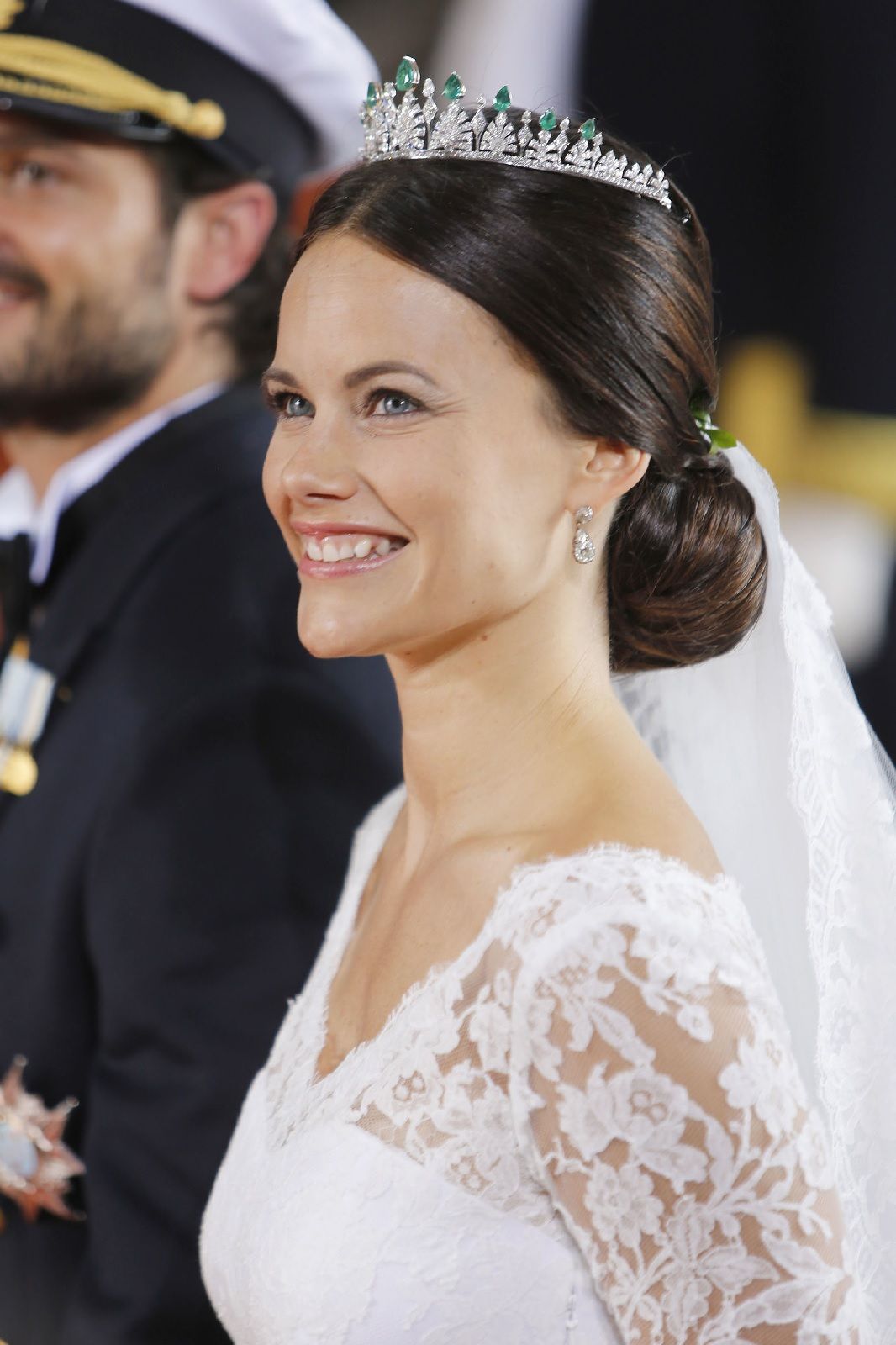 Il vestito: Sofia ha sposato il suo principe svedese in un romantico abito in pizzo ed organza in tre diversi toni di bianco, disegnato da Ida Sjöstedt e completato da un lungo strascico. I capelli erano in uno chignon basso, reso più prezioso da una tiara di diamanti e smeraldi.