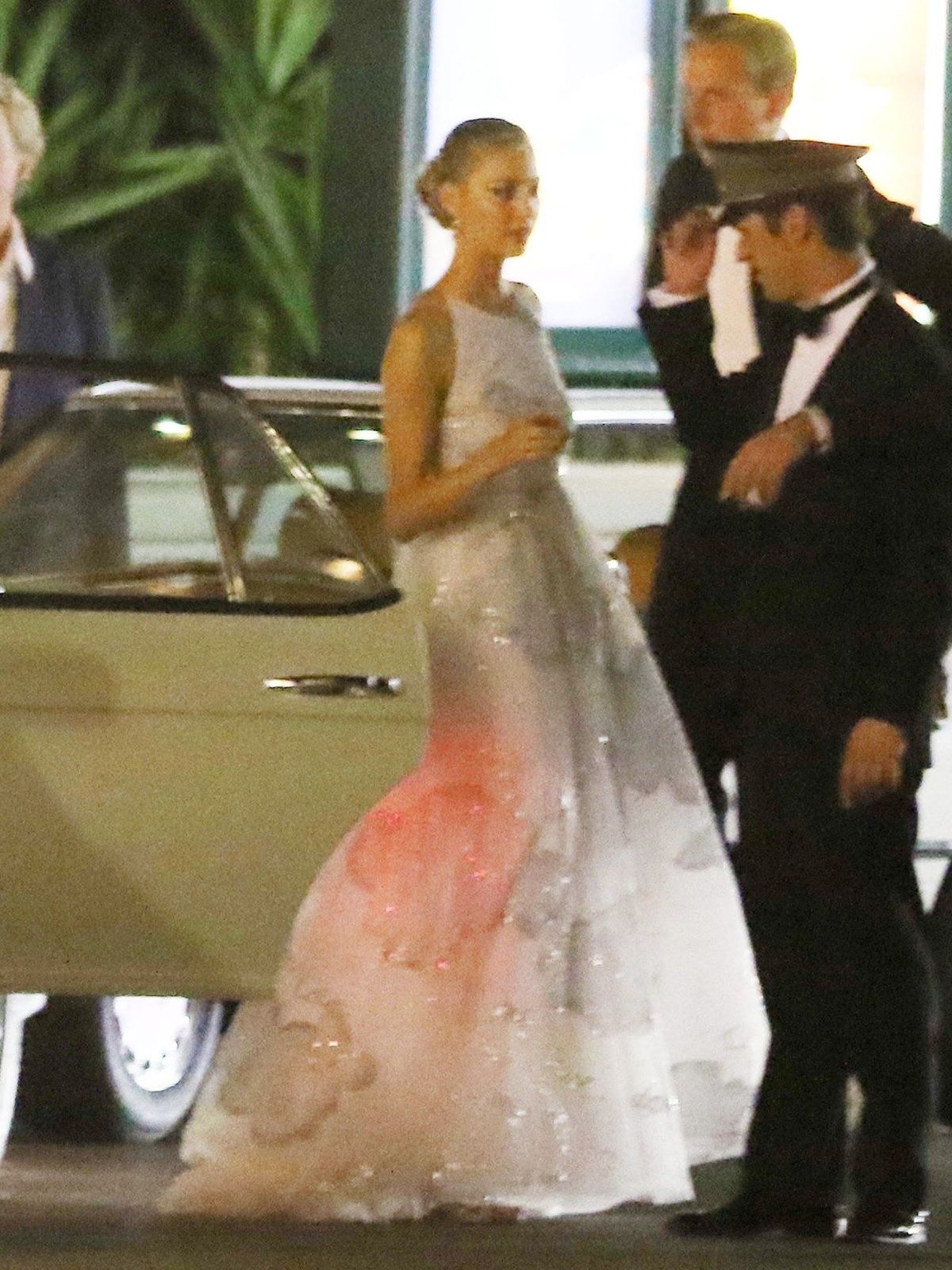 Il vestito: l’ex nuotatrice ha indossato una creazione di Armani Privè, minimale e preziosissima, realizzata da tre abili sarti con circa 2.500 ore di lavoro. L’abito, in duchesse di seta bianco opaco, era decorato con un ricamo floreale a ramage ottenuto mettendo insieme 40.000 cristalli Swarovski, 20.000 gocce di madreperla dorata e 30.000 pietrine dorate.