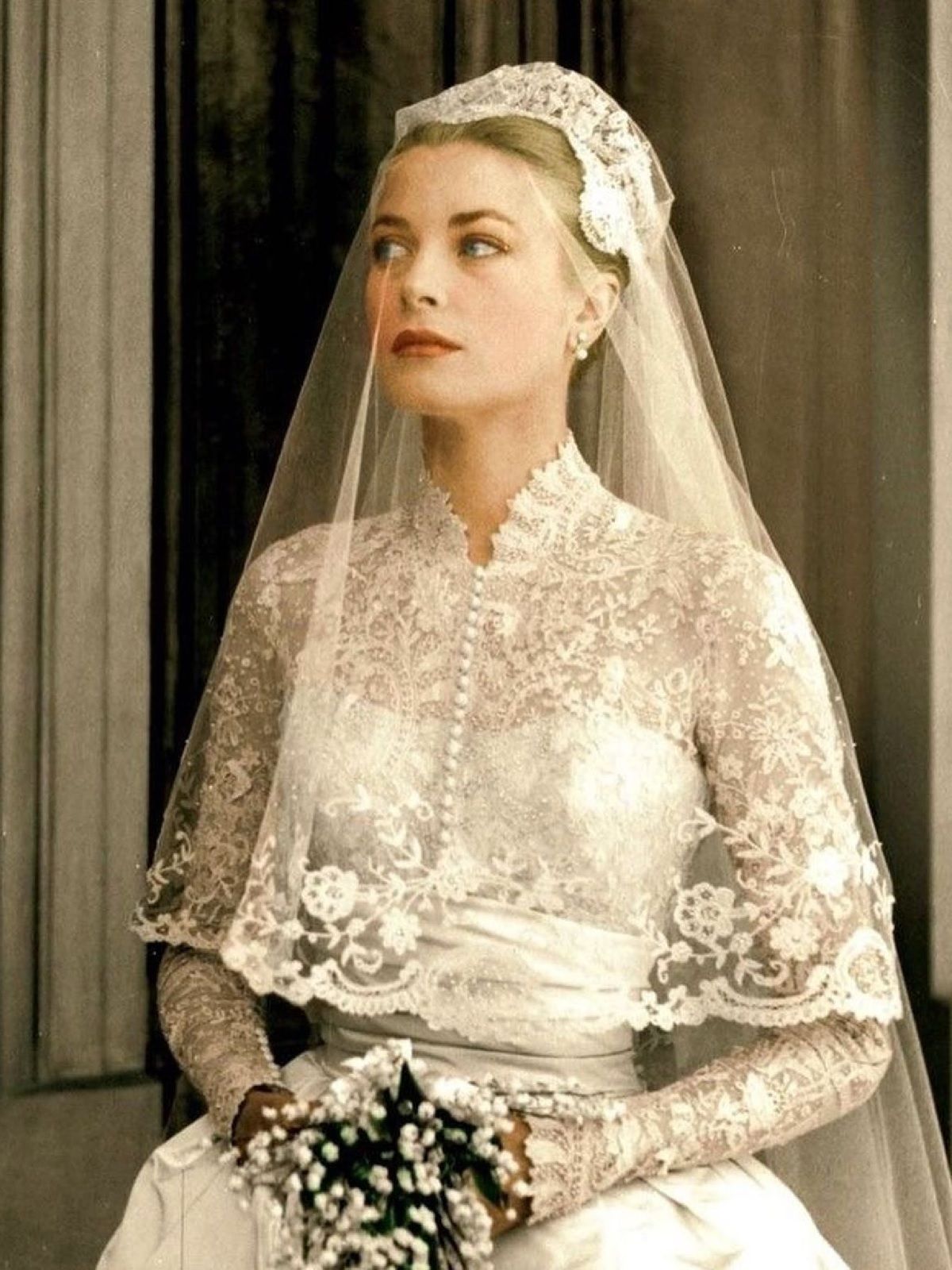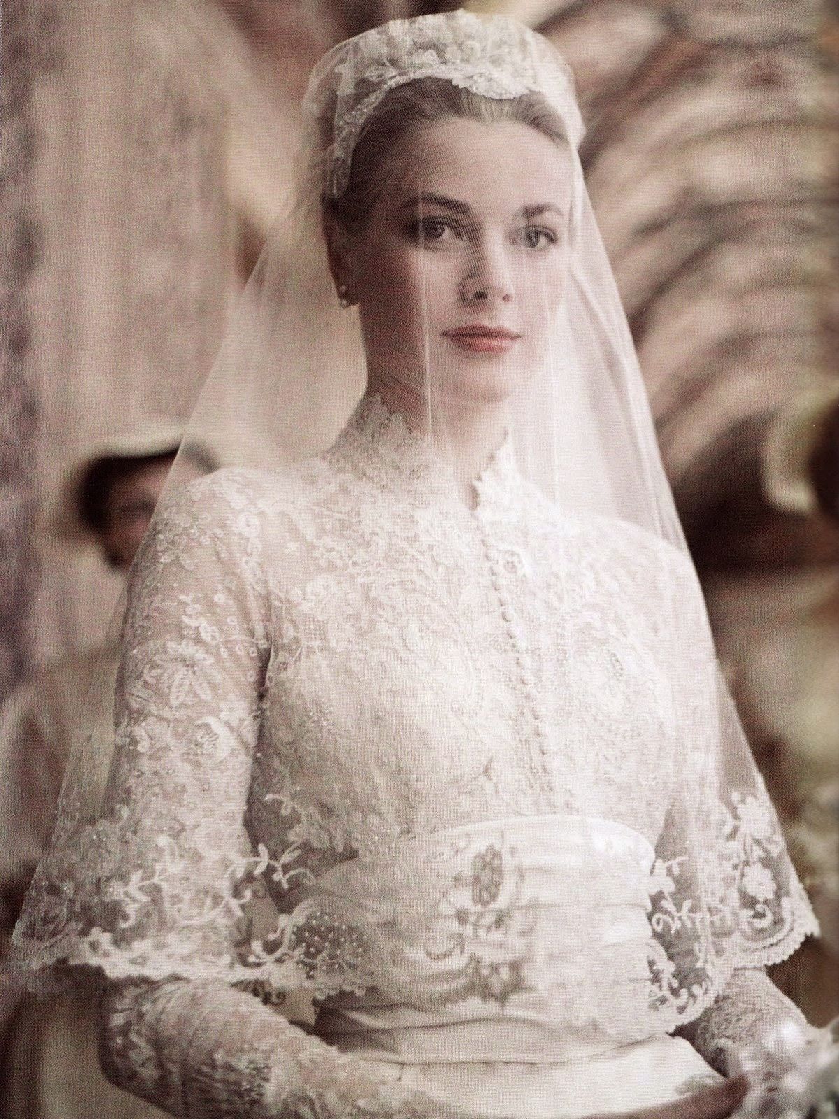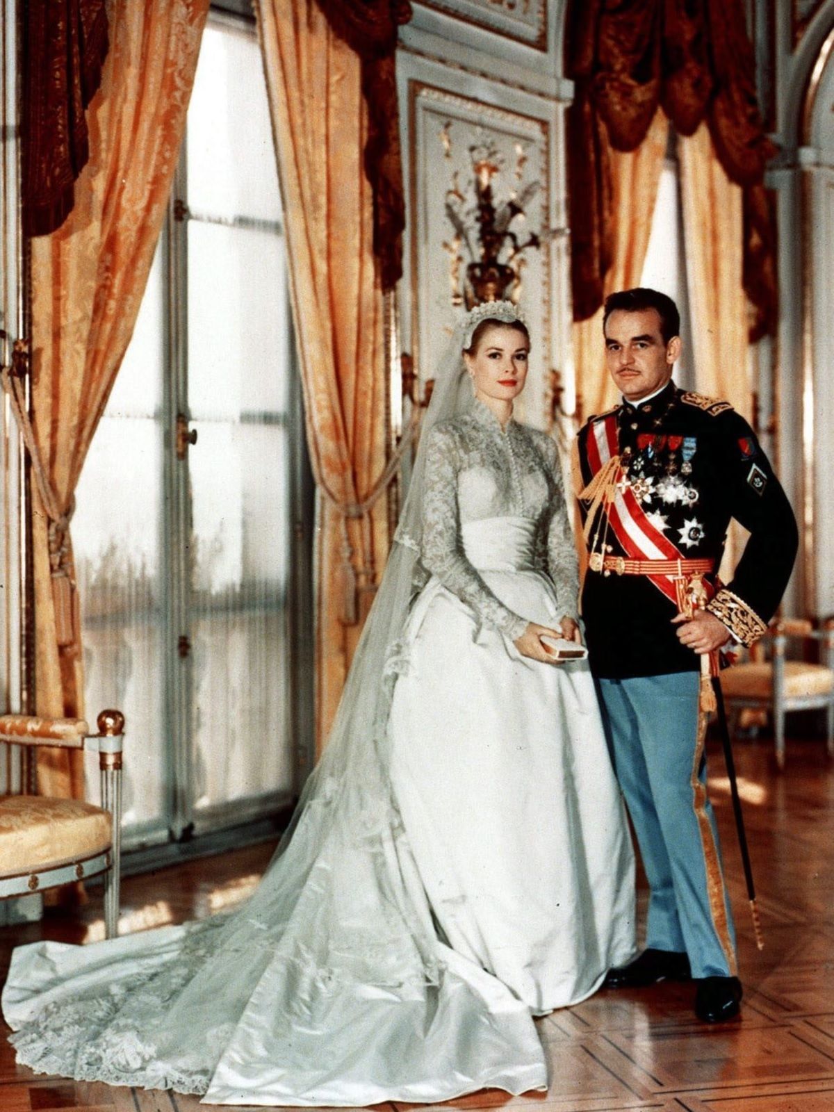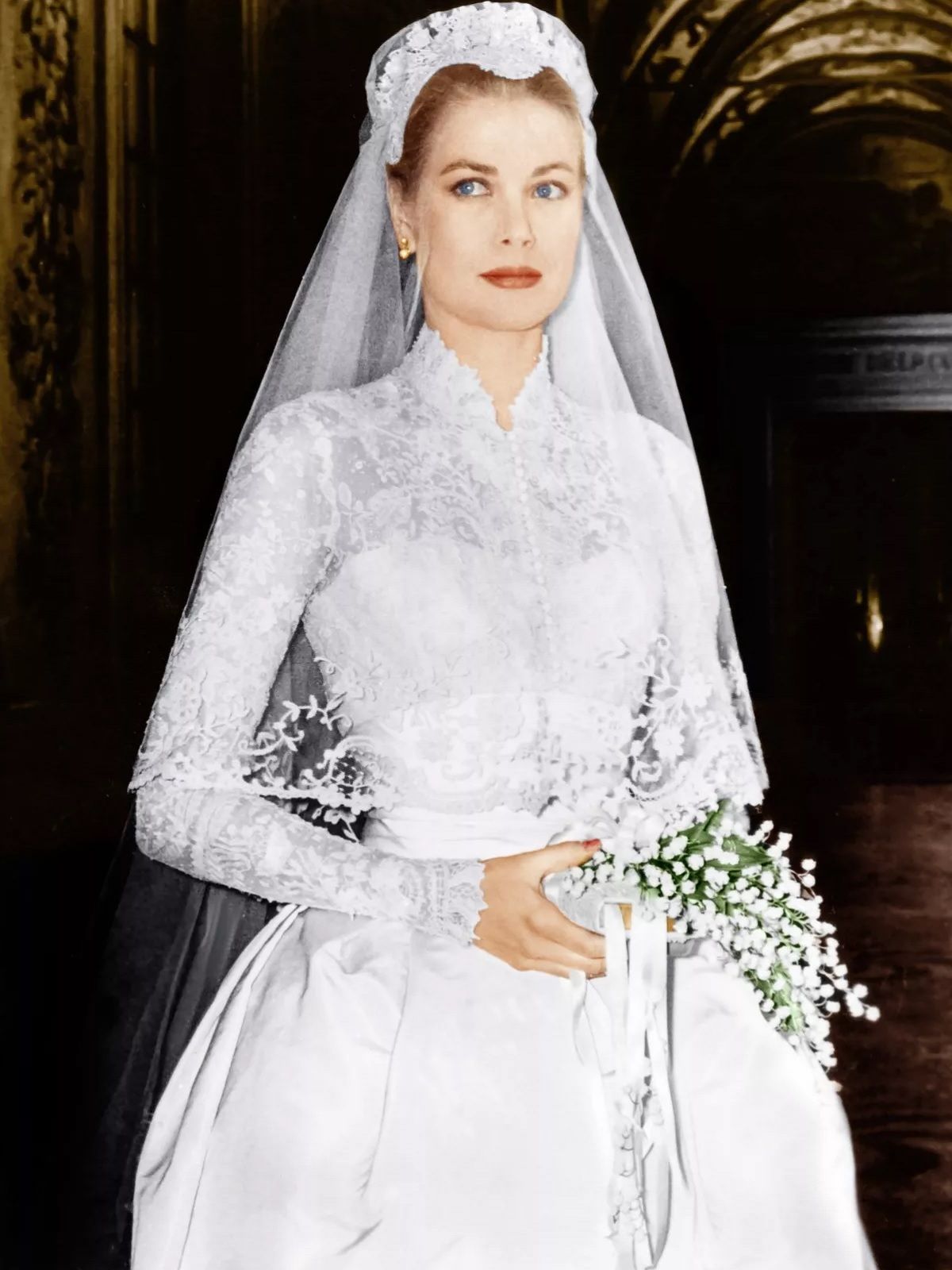 Il vestito: l’abito dell’attrice è diventato una delle ispirazioni preferite delle spose, royal e common: maniche lunghe, un corpetto in pizzo con colletto alla coreana, chiuso sul davanti da dei bottoncini in madreperla, ed una gonna a palloncino in taffetà. Fu un regalo della Metro Goldwyn Meyer e venne disegnato dalla costumista dello studio di produzione, Helen Rose, famosa per la sua maestria nel lavorare i tessuti più delicati tanto da essere soprannominata "la Signora dello chiffon". Per realizzarlo sono stati pare siano stati necessari 24 metri di taffetà di seta, 24 metri di gros de longre e 270 metri di pregiato pizzo Valenciennes. Al posto della tiara, per fermare il velo, Grace Kelly scelse un Juliet cap, adornato con pizzi, fiori d’arancio e gioielli.