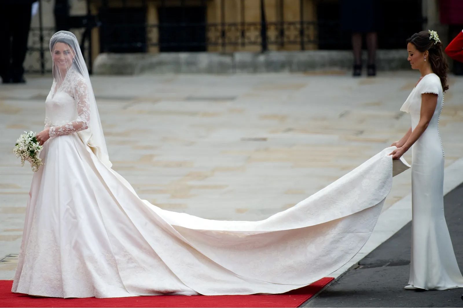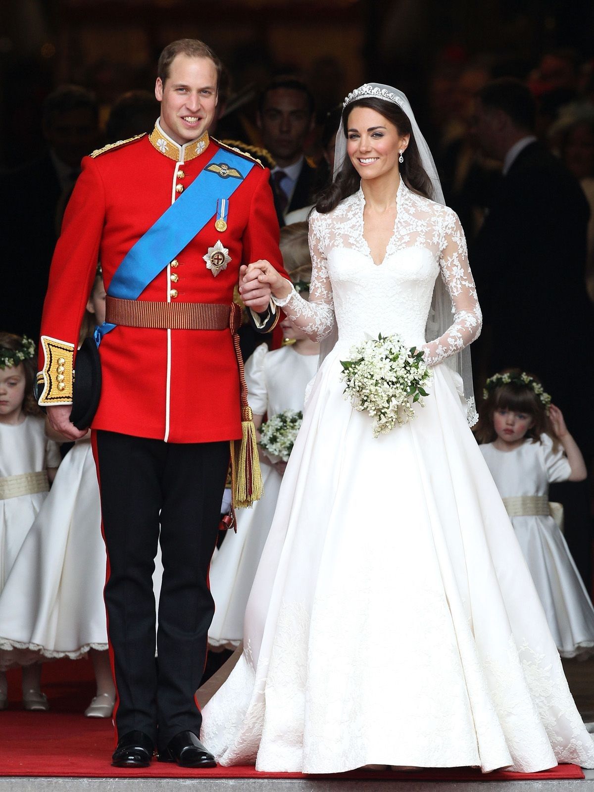 Il vestito: il protagonista del royal wedding più importante degli ultimi anni è stato l’abito creato per Kate Middleton da Sarah Burton, la direttrice creativa di Alexander McQueen. Il modello si ispirava a quello indossato da Grace Kelly per il suo matrimonio con Ranieri III di Monaco, in particolare al pizzo che ricopriva sia le maniche sia il corpetto in satin di seta color avorio, abbellito da 58 piccoli bottoni in gazar e organza. La silhouette dell’abito era completata da una gonna drappeggiata in modo da ricordare un fiore, come nel tradizionale stile Vittoriano. Sul capo, oltre al velo, Kate indossava la tiara Halo di Cartier, risalente al 1936 e prestata dalla Regina Elisabetta II.