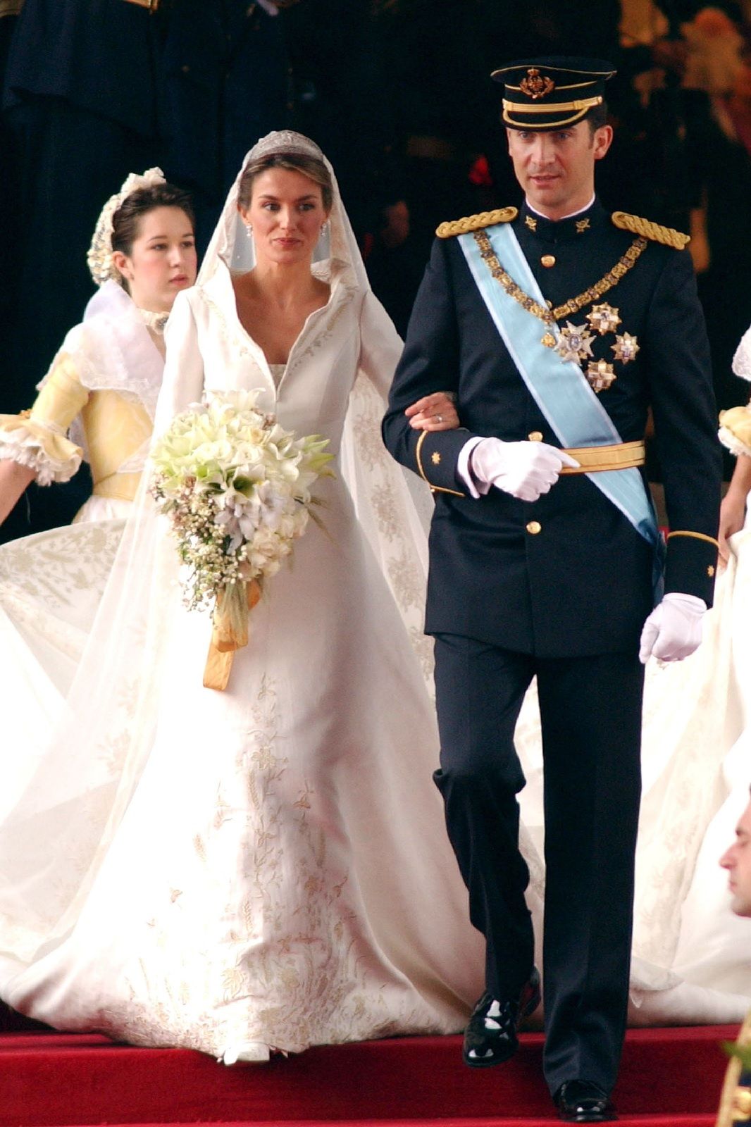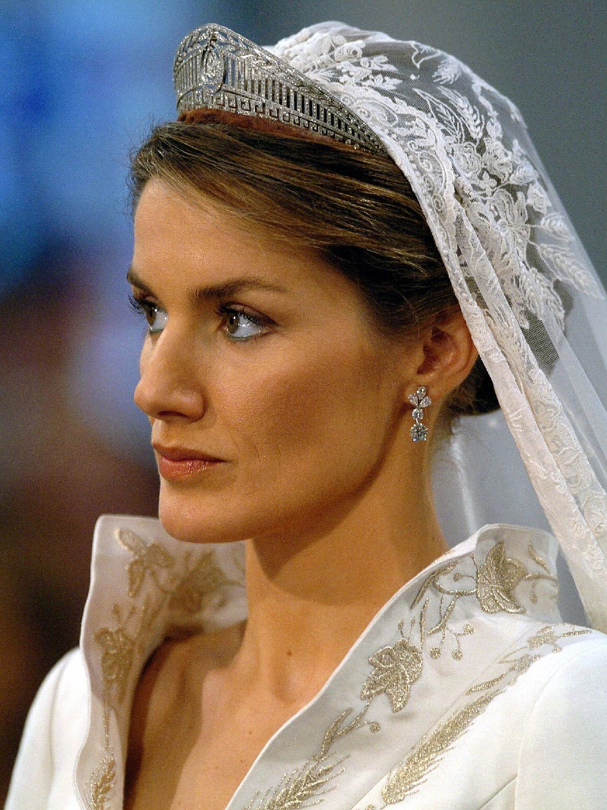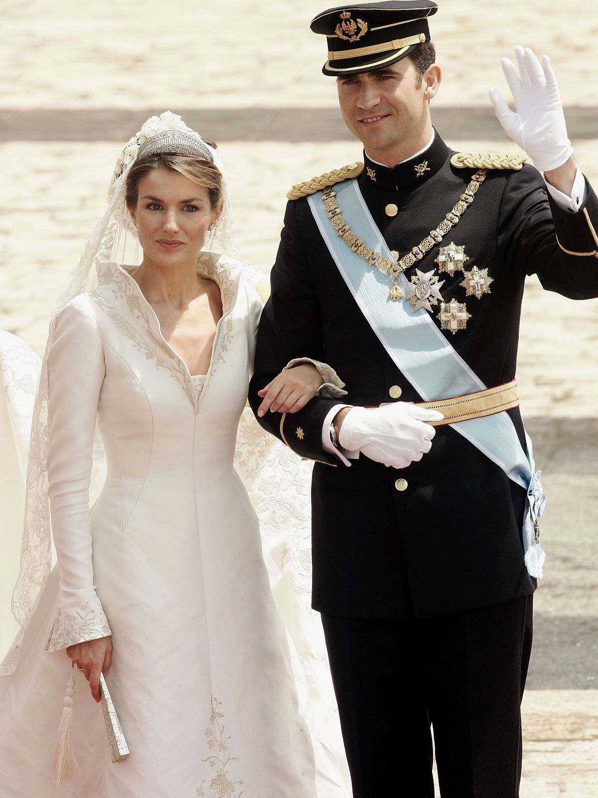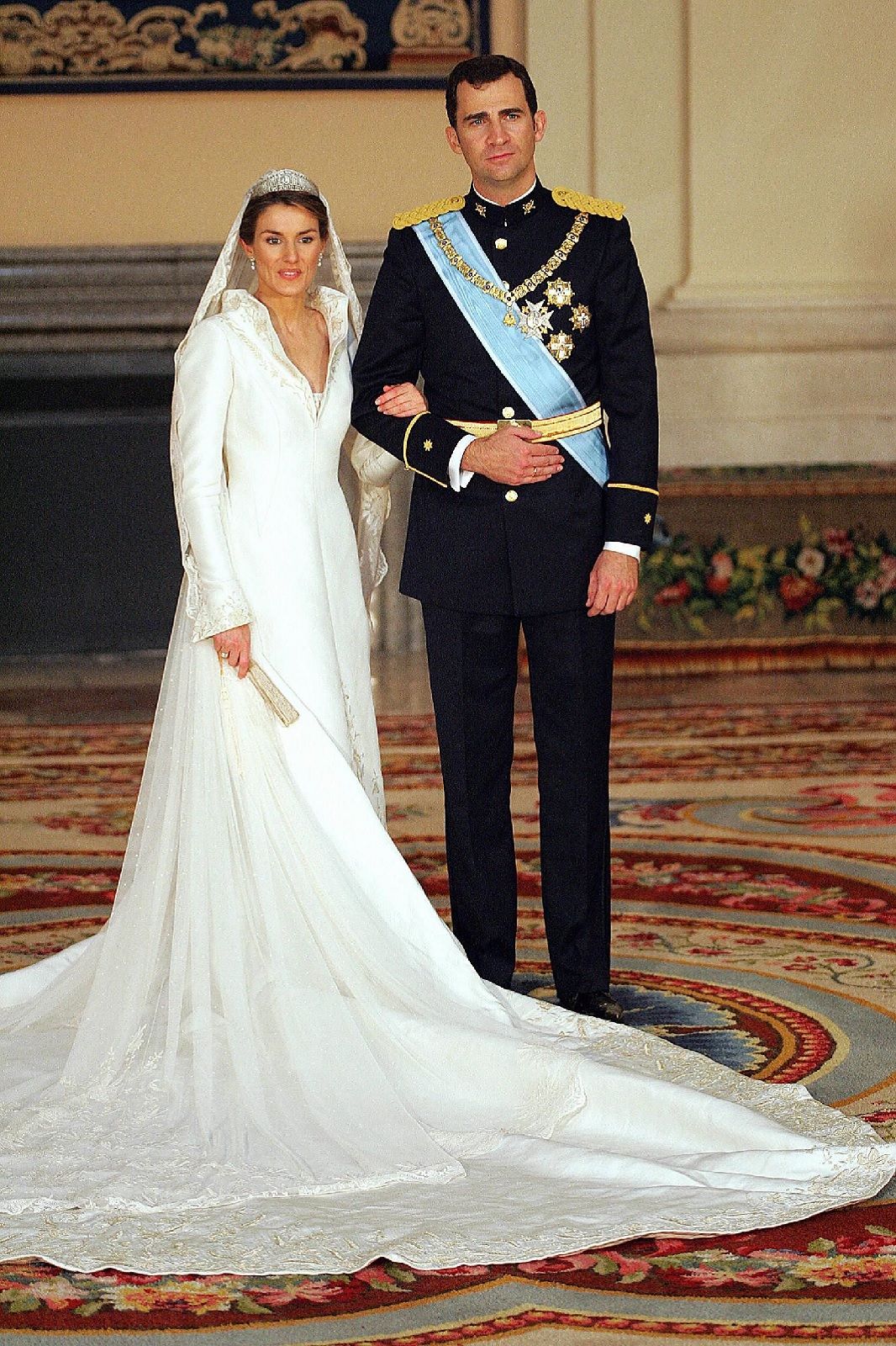 Il vestito: si dice che, con il suo valore di 7 milioni di euro, l’abito che Letizia Ortiz ha scelto per sposare il principe Felipe di Spagna sia il più costoso della storia. L’ex giornalista ha indossato un modello su misura di Manuel Pertegaz caratterizzato da una linea rigorosa, quasi ieratica, ispirata all’estetica rinascimentale. I dettagli erano un omaggio alla famiglia reale. Sulla gonna, il colletto e il velo, infatti, spiccava il ricamo, un filo d'argento che disegnava un giglio, il fiore simbolo della dinastia dei Borboni di Spagna e della casata dei Capetingi.