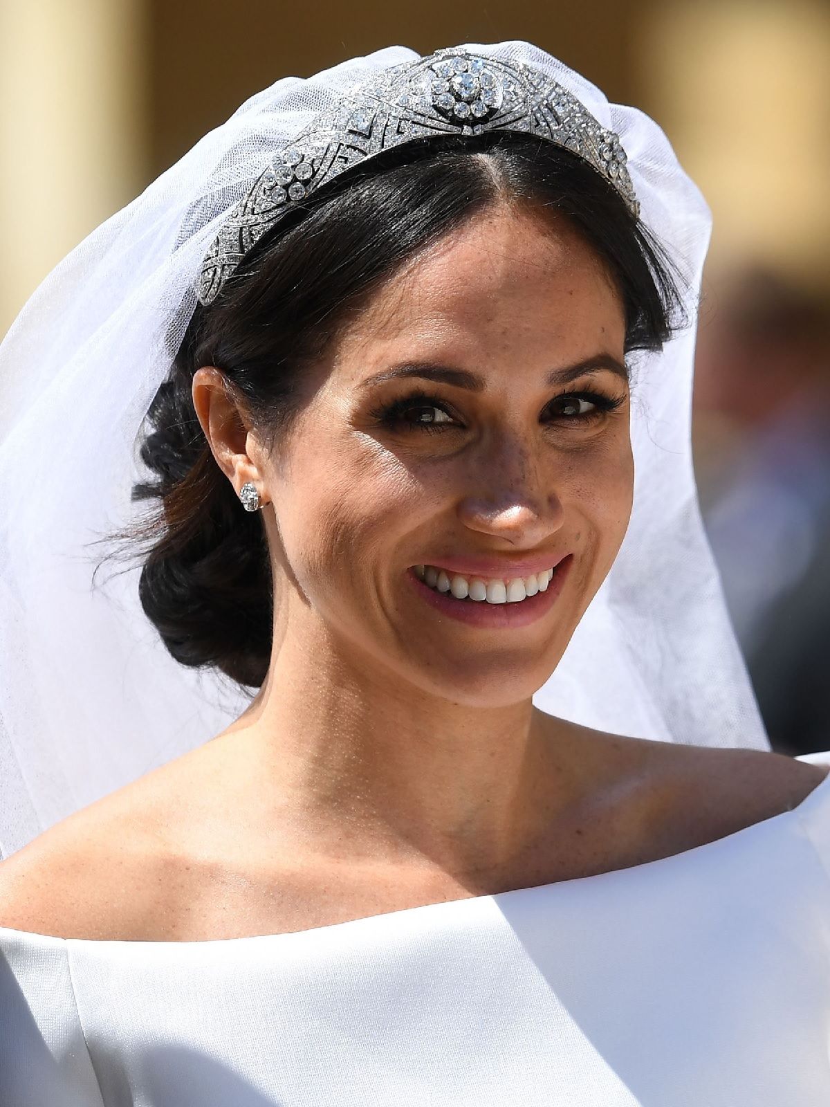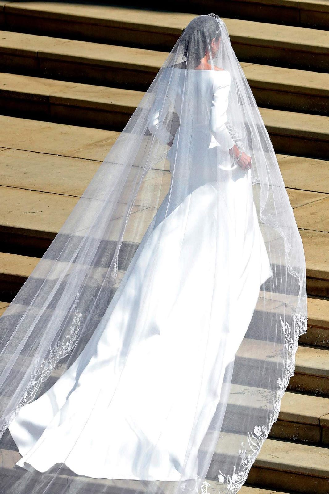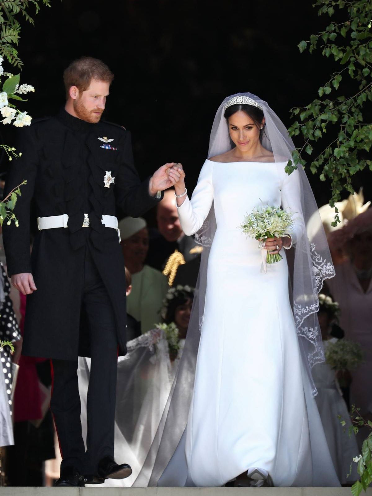 Il vestito: l’ex attrice ha percorso la navata della St. George Chapel in un abito di Givenchy in seta cady, con scollo a barca e maniche a 3/4. Per completare la creazione di Clare Waight Keller, Meghan ha scelto un paio di décolleté di Aquazzura, gioielli di diamanti di Cartier e la tiara in platino tempestato di diamanti chiamata Queen Mary, che, realizzata nel 1932, era appartenuta alla regina Maria, moglie di Giorgio V e nonna della regina Elisabetta. Il velo in tulle di seta era lungo 5 metri e ricamato con 53 fiori che simboleggiavano i Paesi del Commonwealth, più un calicanto d’inverno, come quelli che crescono davanti al cottage di Kensington Palace, e un papavero della California, per ricordare le origini statunitensi della sposa. Durante il ricevimento serale alla Frogmore House Meghan ha sfoggiato un halter dress firmato da Stella McCartney.