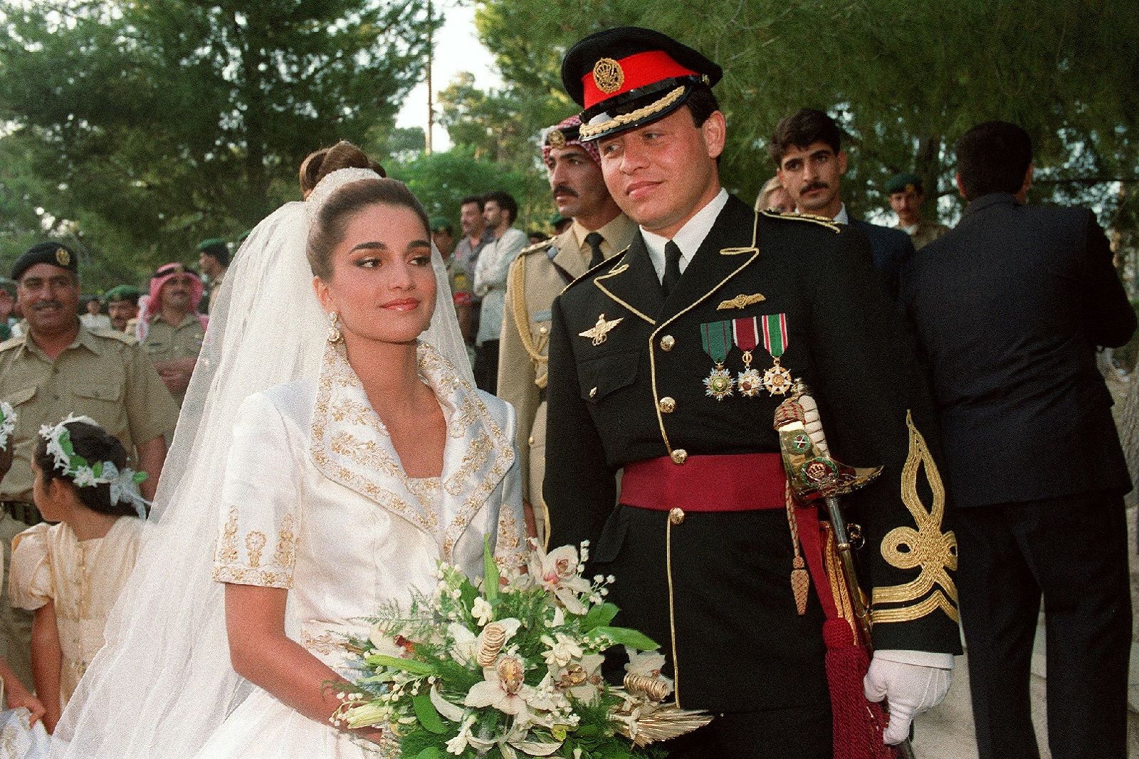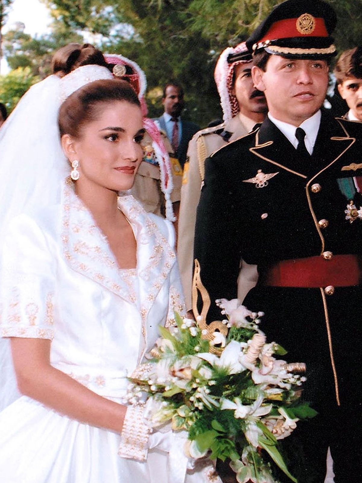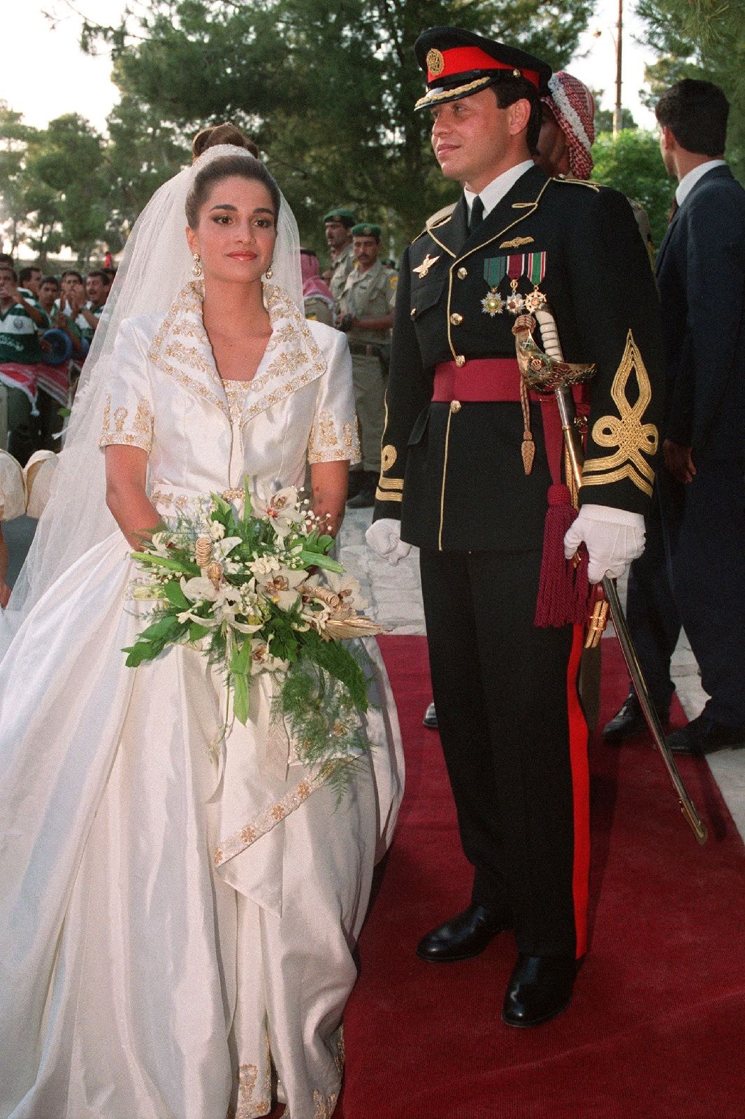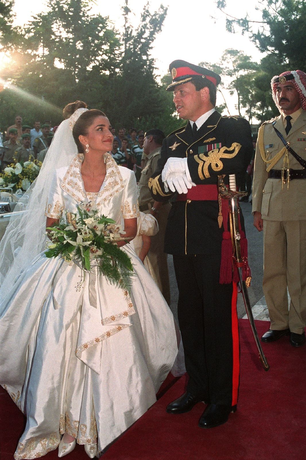 Il vestito: Rania di Giordania ha sposato il principe Abdullah in un intricato abito, creato dallo stilista britannico Bruce Oldfield, composto da un corpetto a giacca e da una gonna voluminosa. A spezzare il bianco dell’outfit c’erano preziose rifiniture dorate.