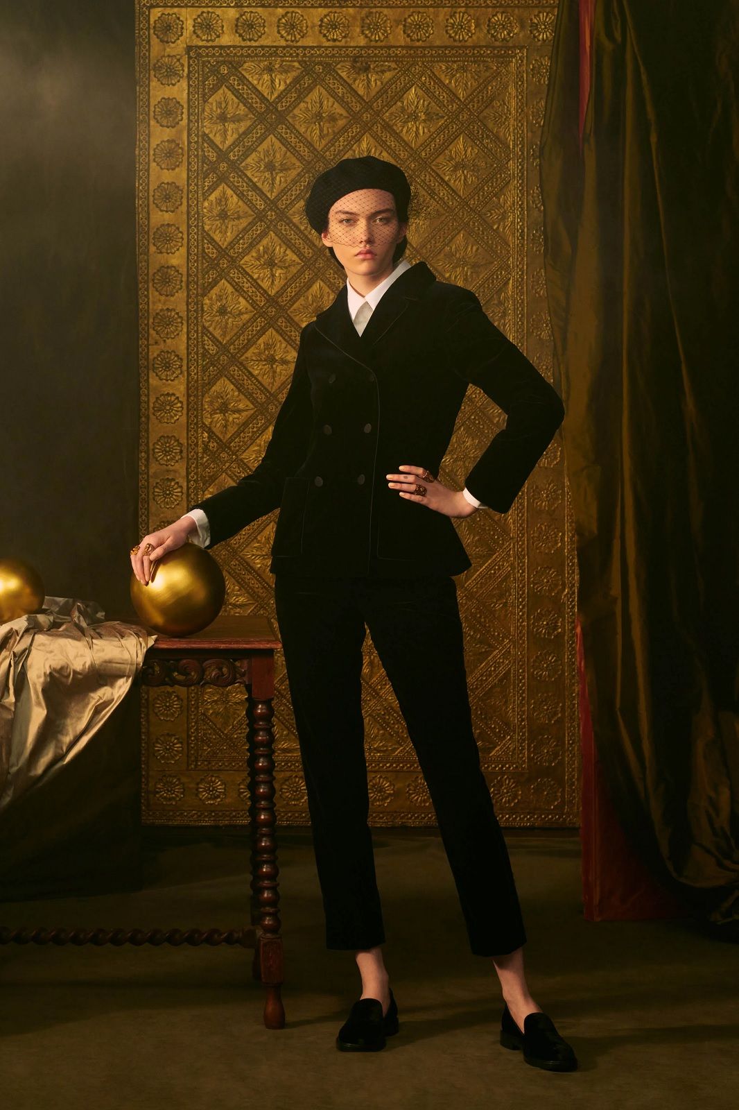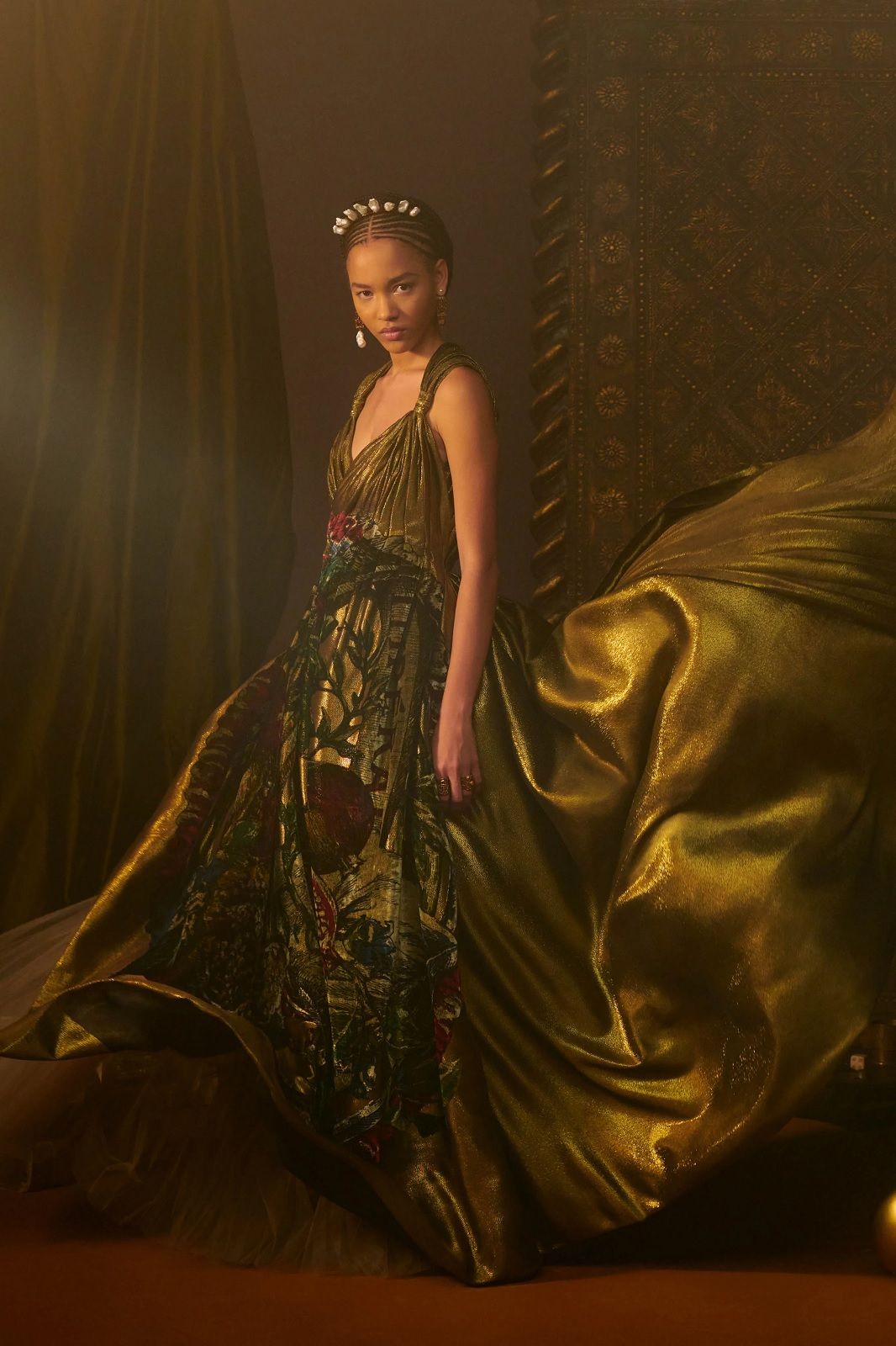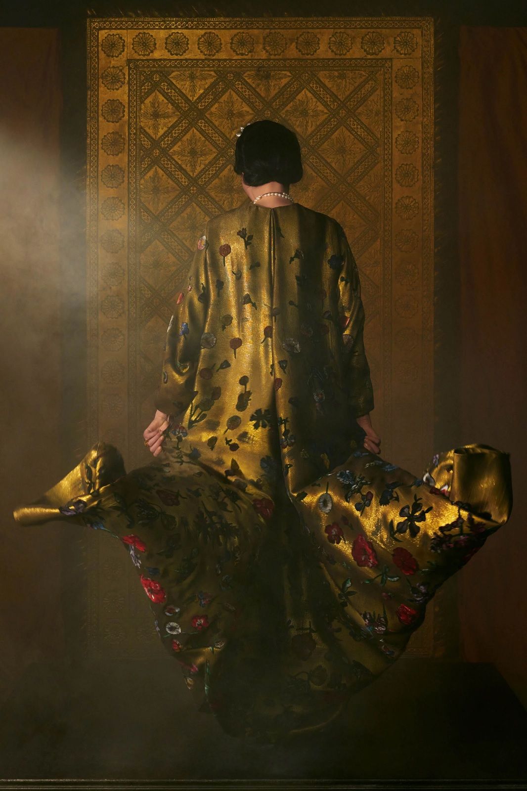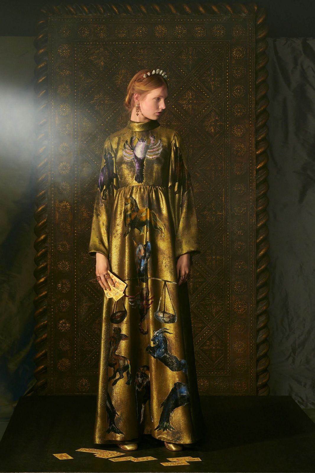 La designer trasforma le misteriose e affascinanti carte divinatorie, così piene di significati e simbolismo, in abiti complessi, opulenti e bellissimi. Sono silhouette architettoniche, degne di una Madonna bizantina o della principessa di una fiaba. Forme, stoffe, texture, colori e ricami si sovrappongono raccontando una storia di pura poesia fatta, invece di parole, di corpetti che sembrano bassorilievi, eteree gonne see-through, completi maschili in velluto, mantelle jacquard, abiti stile impero.