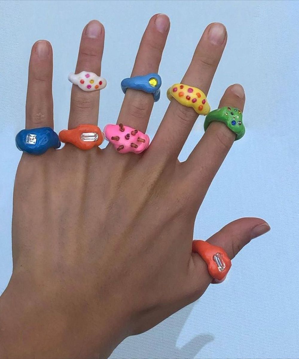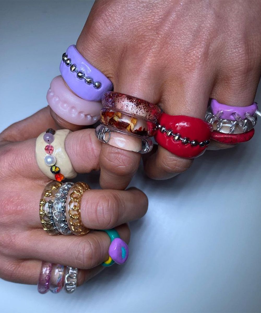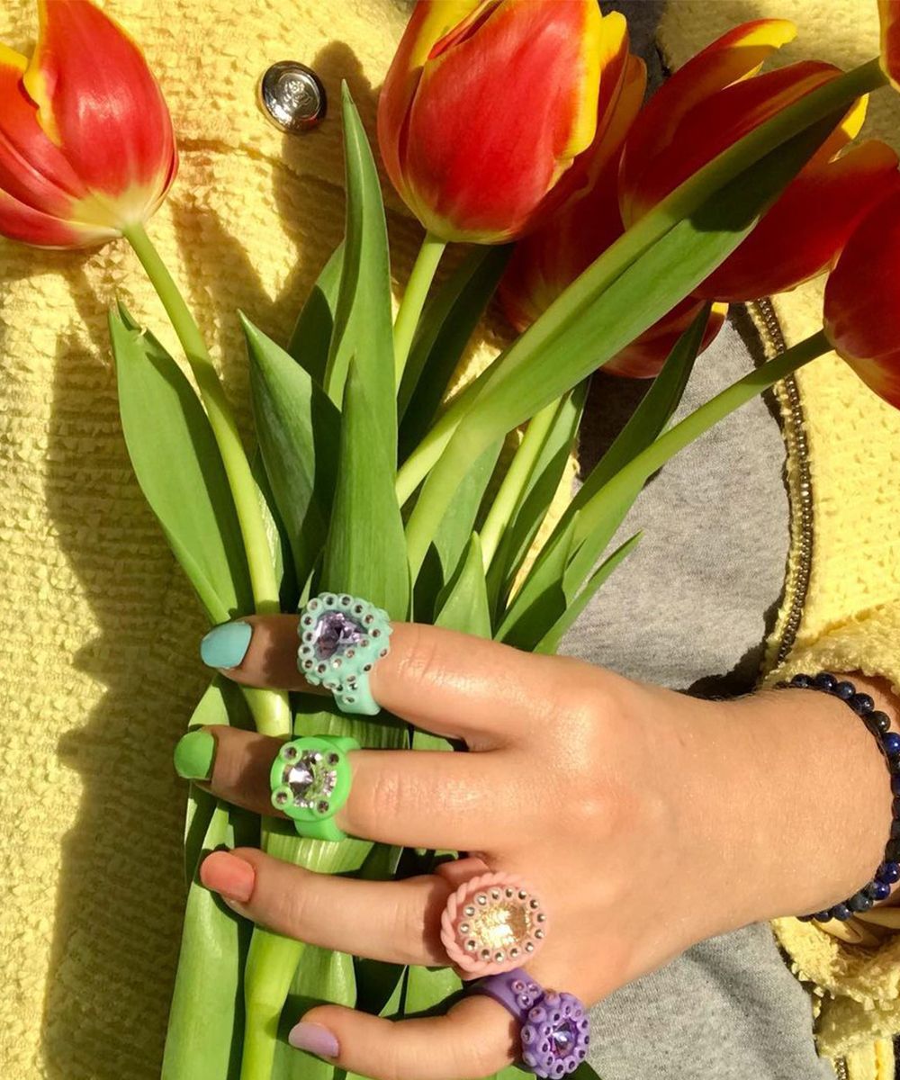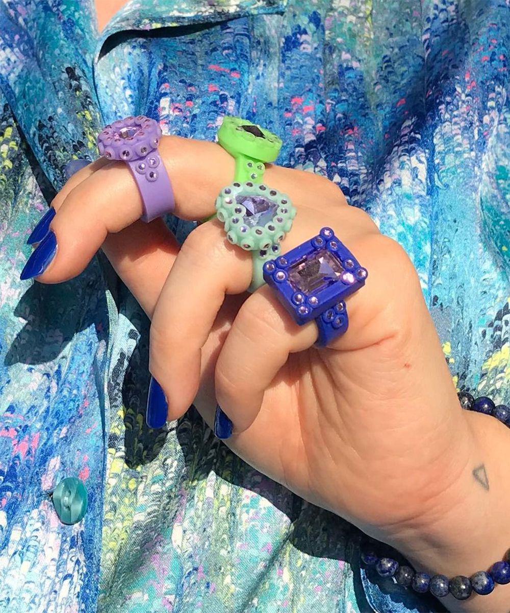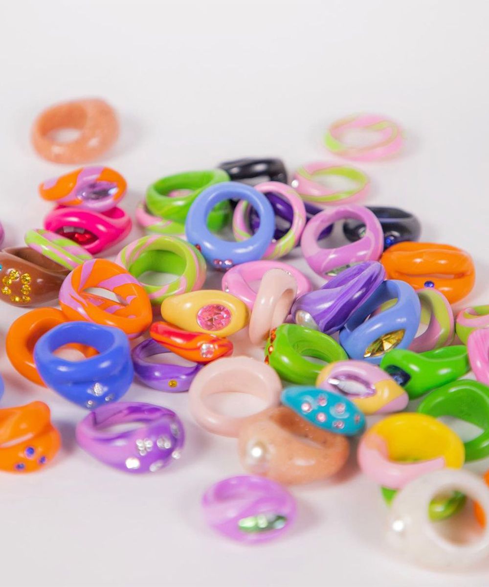 Sono per la maggior parte tutti pezzi unici, realizzati a mano, che spesso nascono dal dialogo tra l’artista e il suo commissionario. In Italia dobbiamo ringraziare Jupiter per averci fatto re-innamorare di questi anelli. Un brand nato nel periodo di lockdown dall'idea di Letizia Bettoni di creare una sintesi ibrida tra design del gioiello e creatività infantile: i suoi anelli si possono ordinare direttamente con un messaggio su Instagram. Rings-à-porter realizzati in un polimero plastico che ricorda la creatività dei bambini sempre con le mani in pasta, alla scoperta di forma e colore. A spopolare, worldwide, anche La Manso, brand amatissimo da Bella Hadid. E per chi storce il naso al pensiero della plastica intorno alle dita, non possiamo promettere un prodotto eco-sostenibile ma che, se acquistato perché piace ed evoca ricordi gioiosi, rimarrà con voi per tantissimo tempo. Il loro è un inno al self-care e al self-love, fanno sentire più cool e sì, anche più potenti. Pezzi unici, nati per aggiungere un tocco pop e divertente ad ogni look.