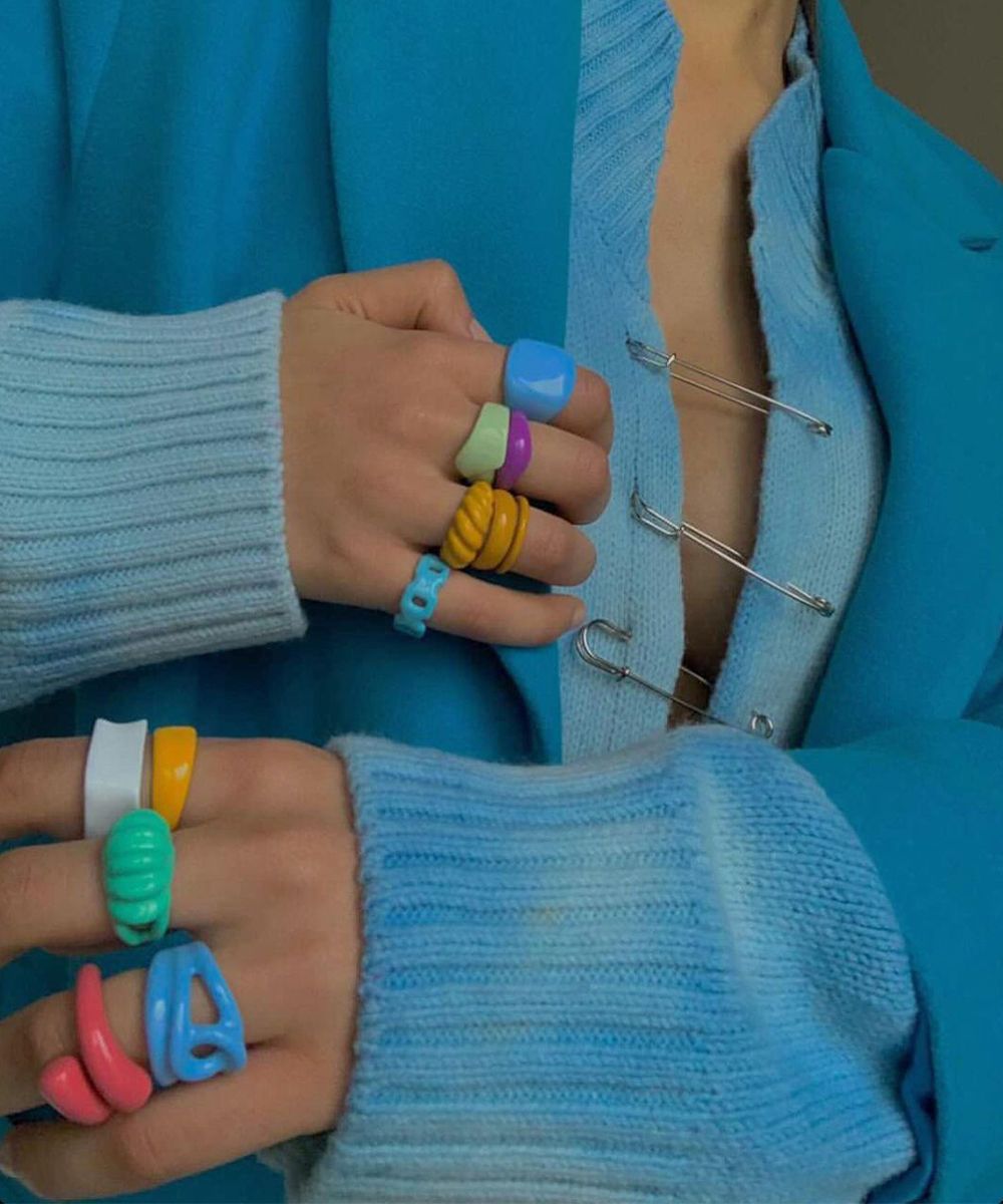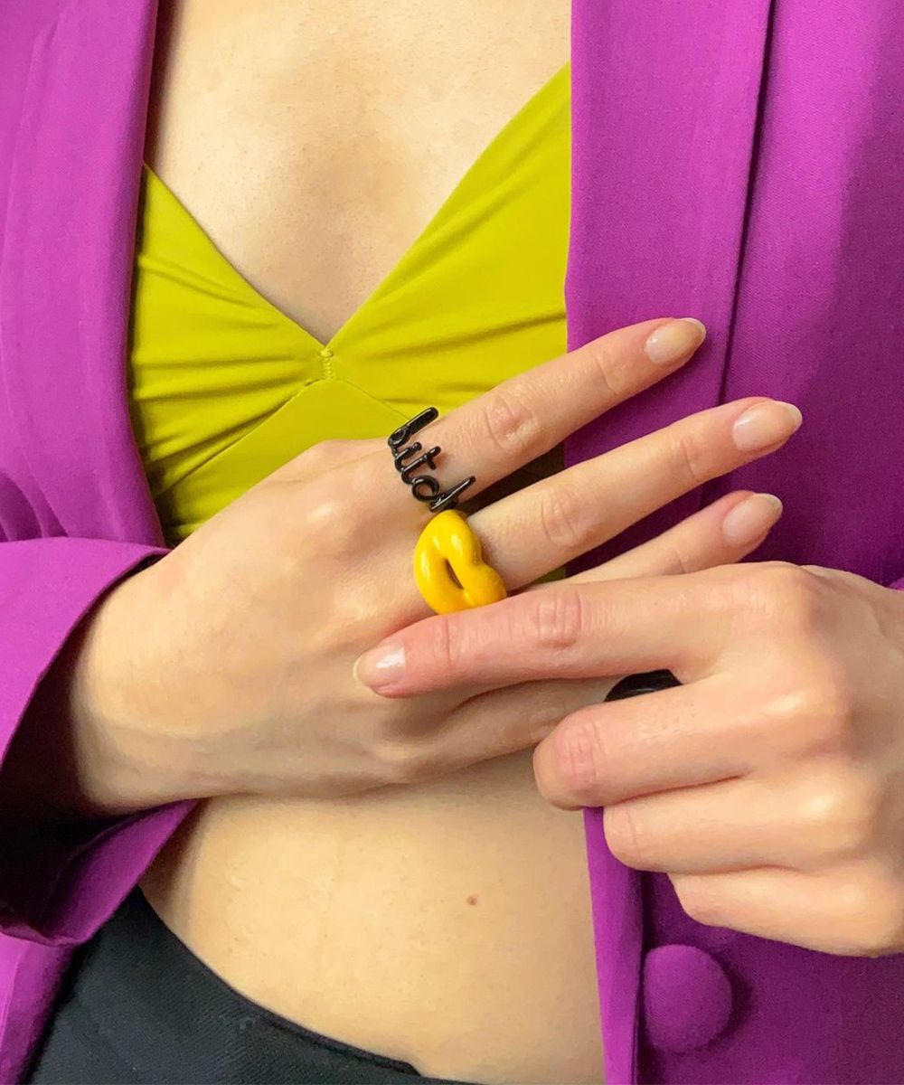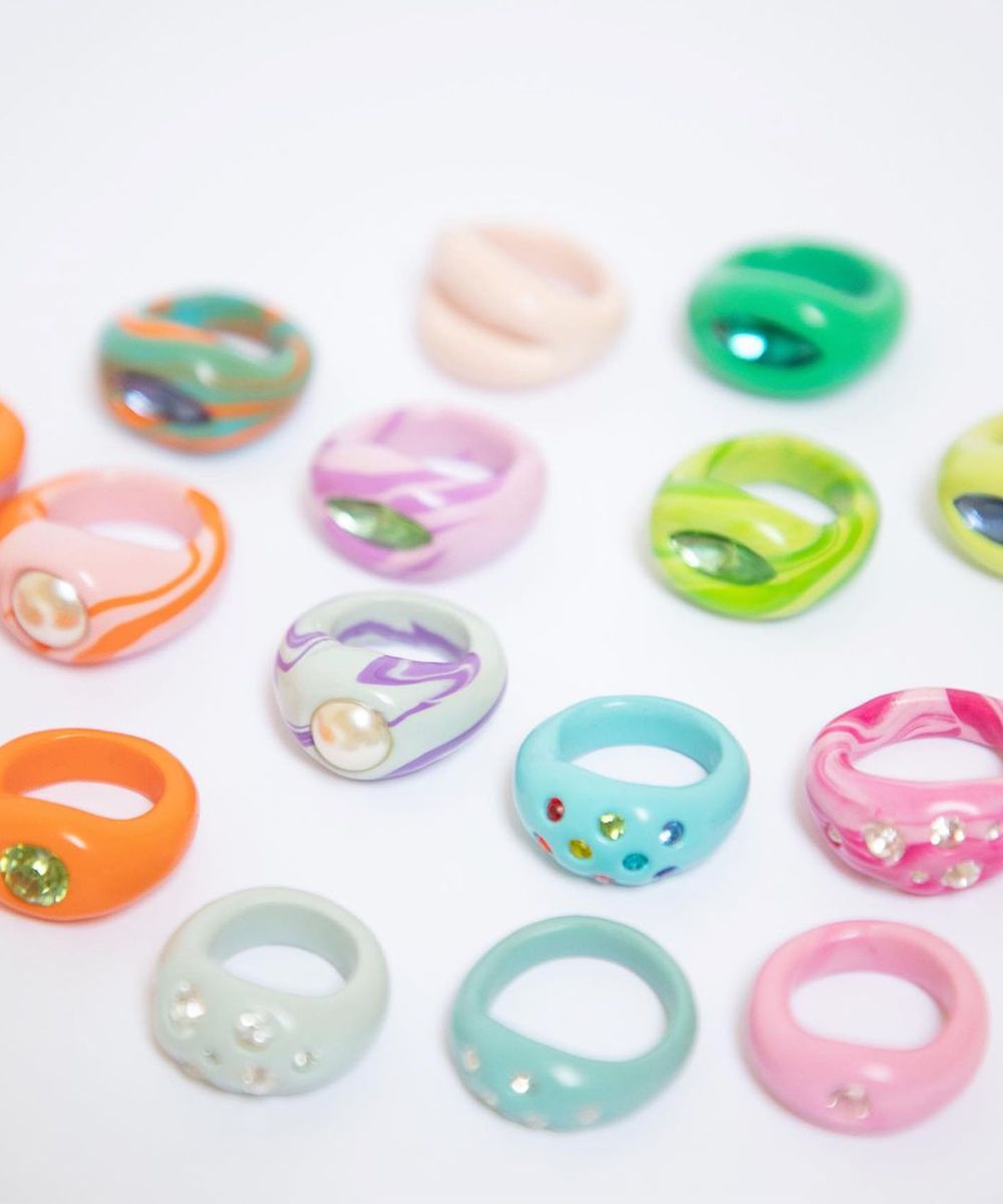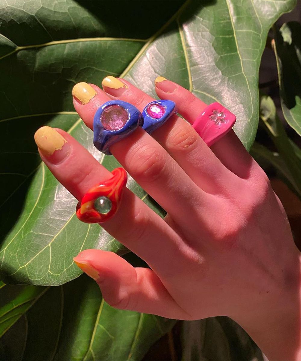 Sono per la maggior parte tutti pezzi unici, realizzati a mano, che spesso nascono dal dialogo tra l’artista e il suo commissionario. In Italia dobbiamo ringraziare Jupiter per averci fatto re-innamorare di questi anelli. Un brand nato nel periodo di lockdown dall'idea di Letizia Bettoni di creare una sintesi ibrida tra design del gioiello e creatività infantile: i suoi anelli si possono ordinare direttamente con un messaggio su Instagram. Rings-à-porter realizzati in un polimero plastico che ricorda la creatività dei bambini sempre con le mani in pasta, alla scoperta di forma e colore. A spopolare, worldwide, anche La Manso, brand amatissimo da Bella Hadid. E per chi storce il naso al pensiero della plastica intorno alle dita, non possiamo promettere un prodotto eco-sostenibile ma che, se acquistato perché piace ed evoca ricordi gioiosi, rimarrà con voi per tantissimo tempo. Il loro è un inno al self-care e al self-love, fanno sentire più cool e sì, anche più potenti. Pezzi unici, nati per aggiungere un tocco pop e divertente ad ogni look.
