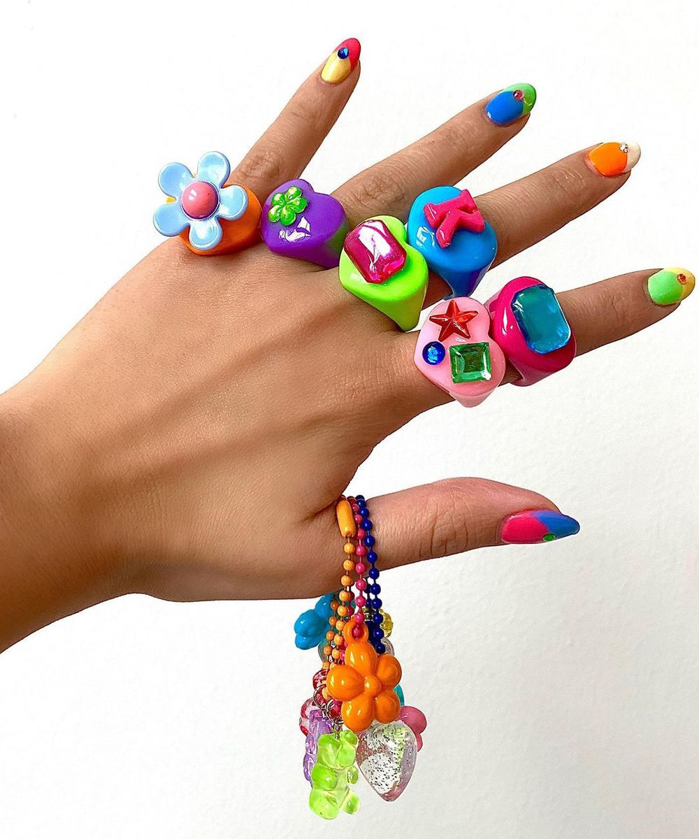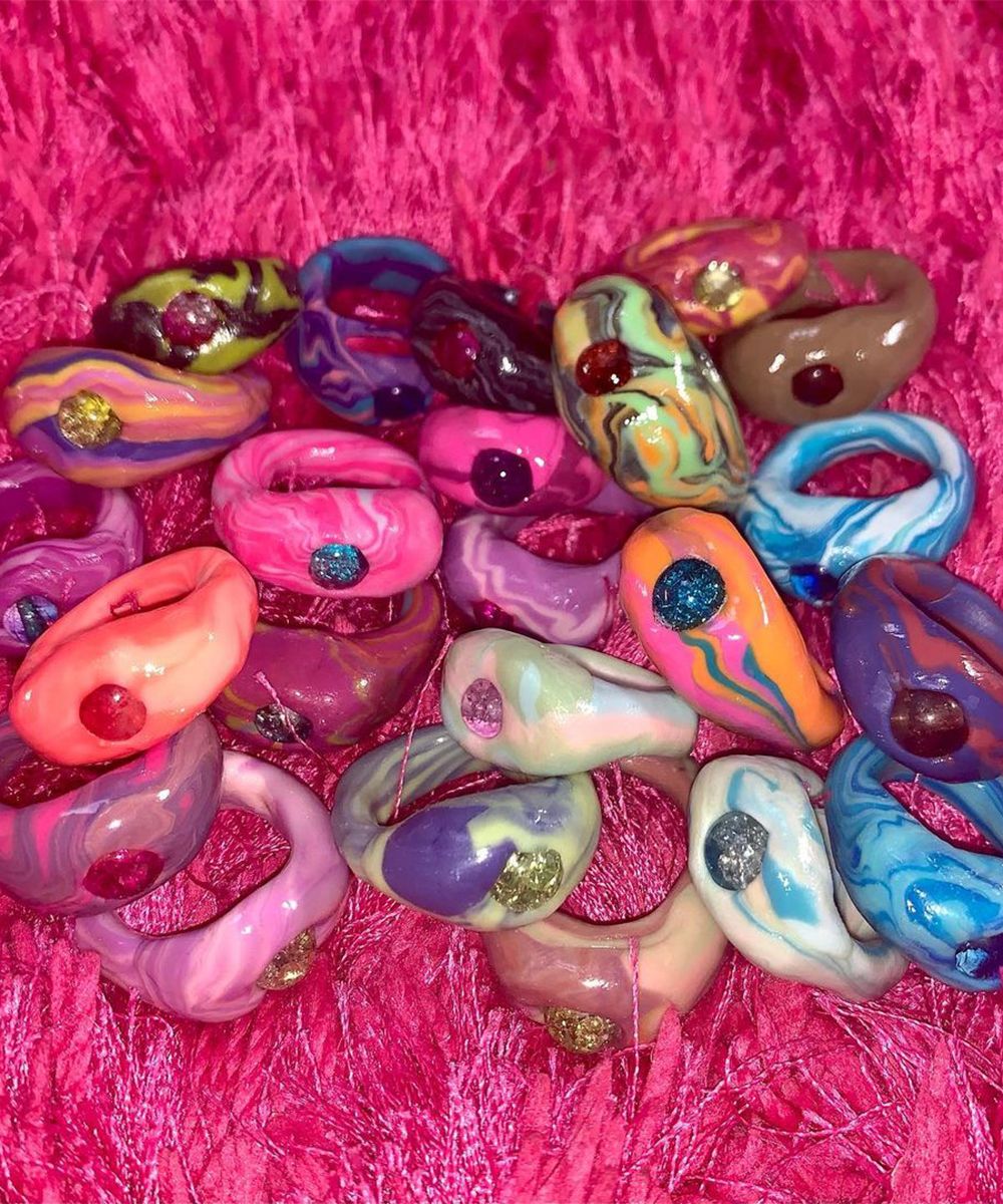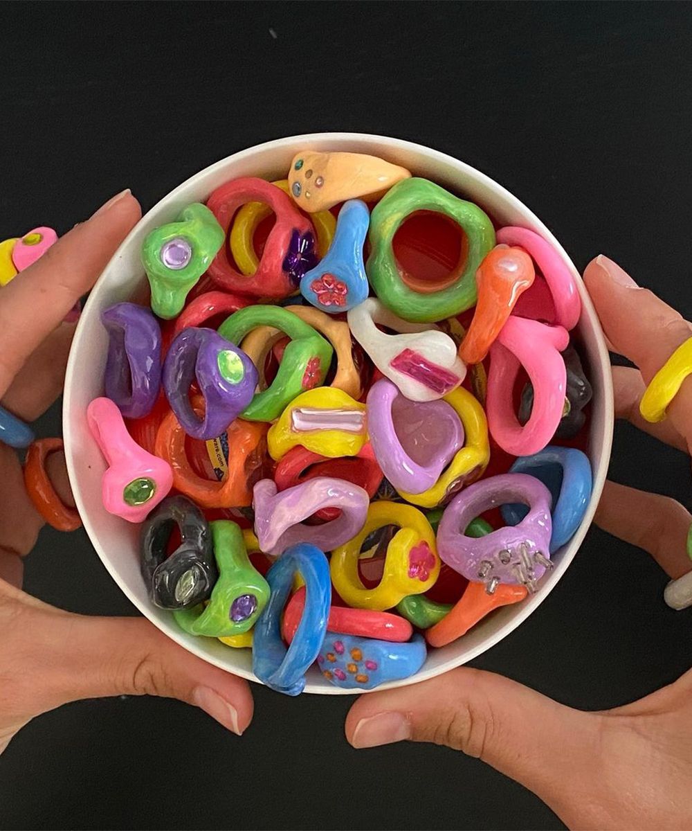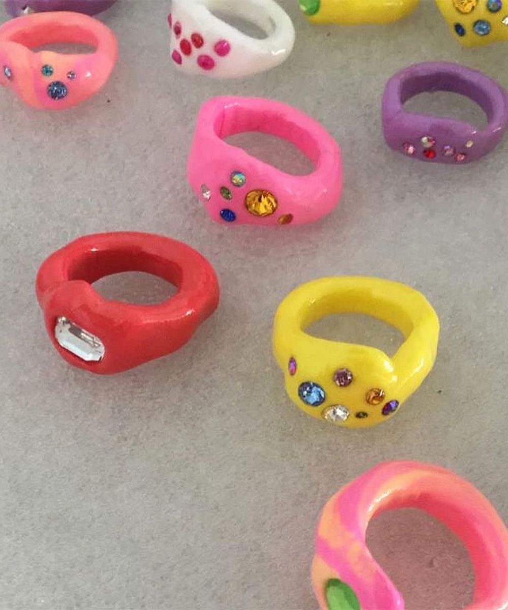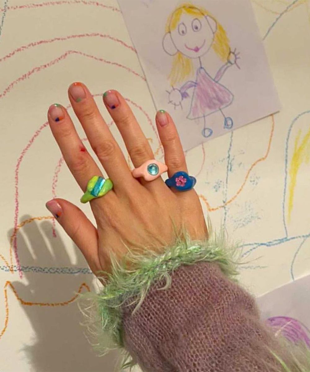 Sono per la maggior parte tutti pezzi unici, realizzati a mano, che spesso nascono dal dialogo tra l’artista e il suo commissionario. In Italia dobbiamo ringraziare Jupiter per averci fatto re-innamorare di questi anelli. Un brand nato nel periodo di lockdown dall'idea di Letizia Bettoni di creare una sintesi ibrida tra design del gioiello e creatività infantile: i suoi anelli si possono ordinare direttamente con un messaggio su Instagram. Rings-à-porter realizzati in un polimero plastico che ricorda la creatività dei bambini sempre con le mani in pasta, alla scoperta di forma e colore. A spopolare, worldwide, anche La Manso, brand amatissimo da Bella Hadid. E per chi storce il naso al pensiero della plastica intorno alle dita, non possiamo promettere un prodotto eco-sostenibile ma che, se acquistato perché piace ed evoca ricordi gioiosi, rimarrà con voi per tantissimo tempo. Il loro è un inno al self-care e al self-love, fanno sentire più cool e sì, anche più potenti. Pezzi unici, nati per aggiungere un tocco pop e divertente ad ogni look.