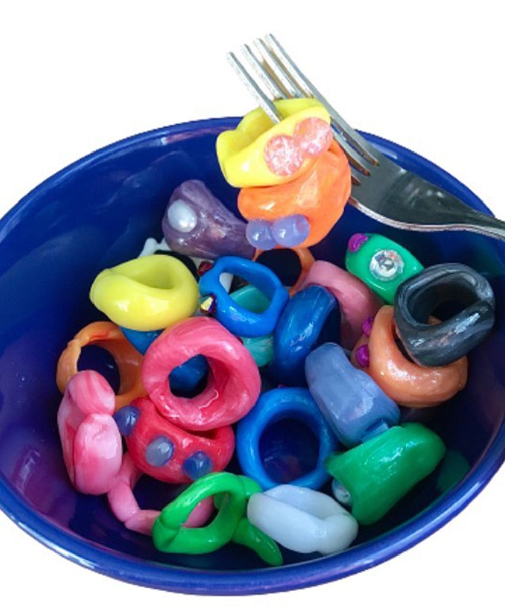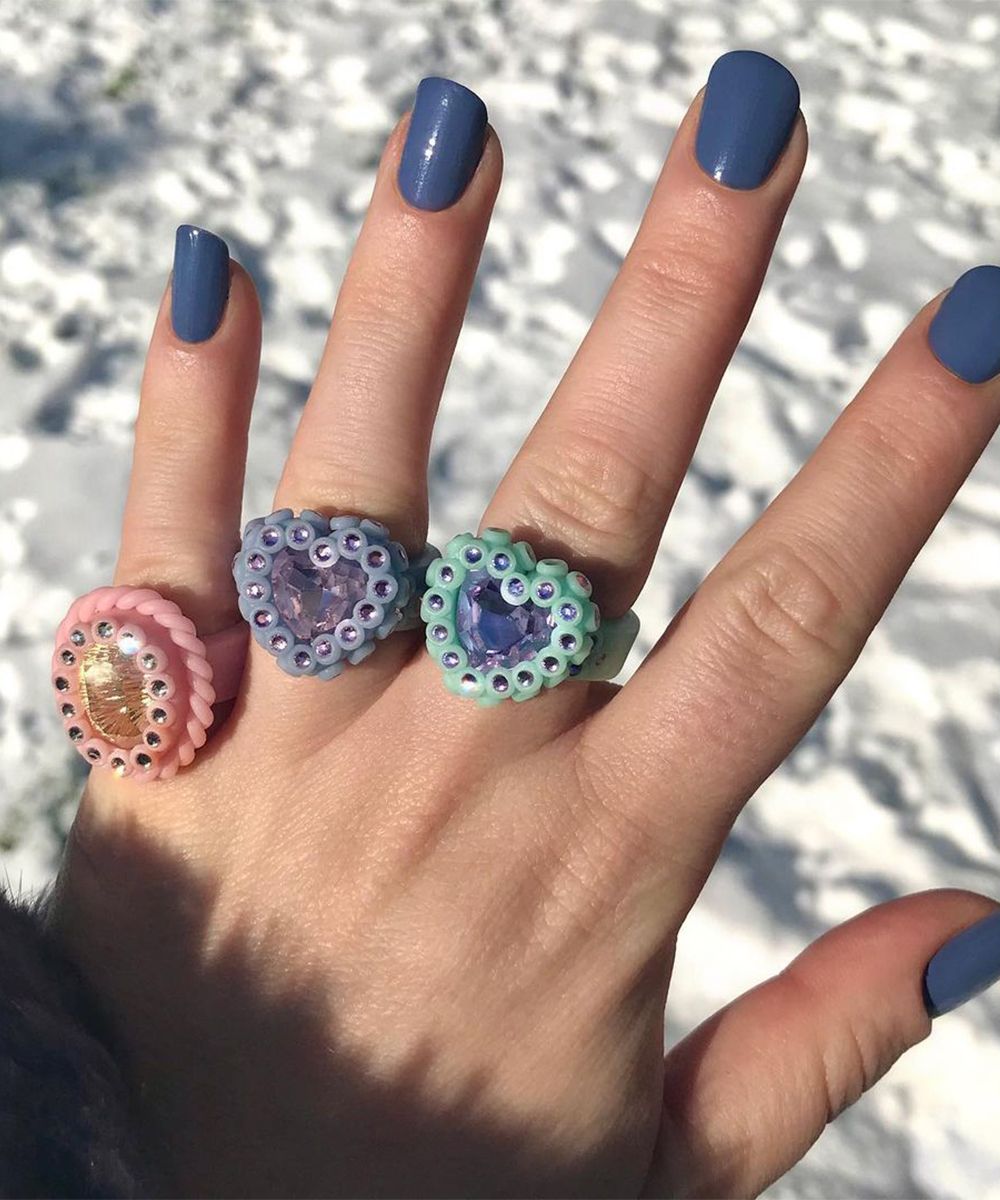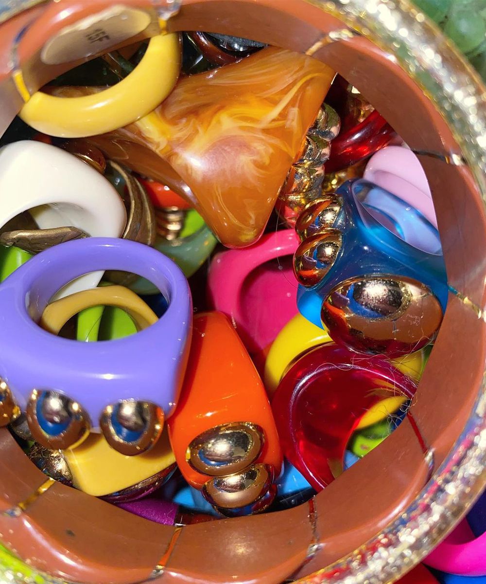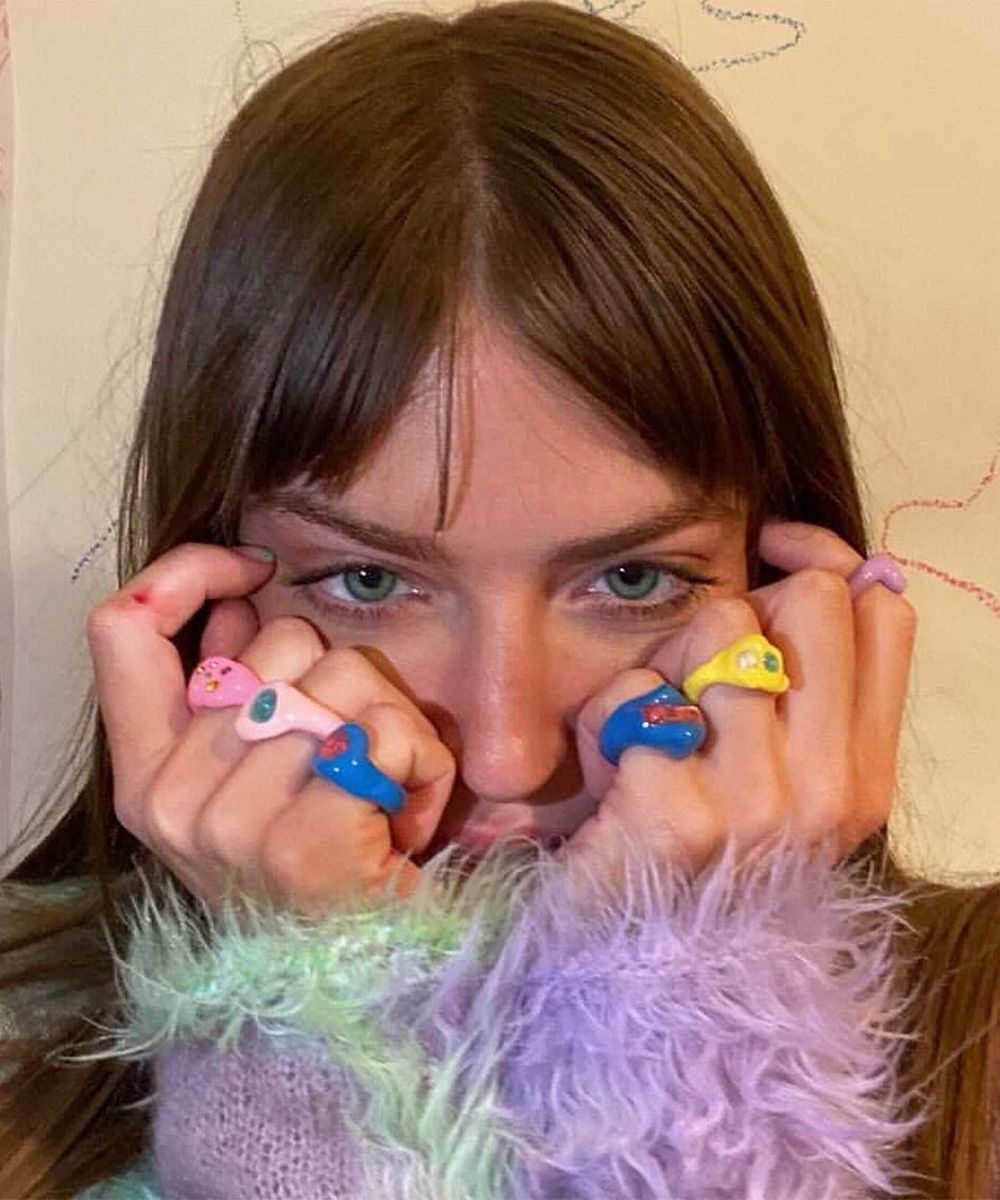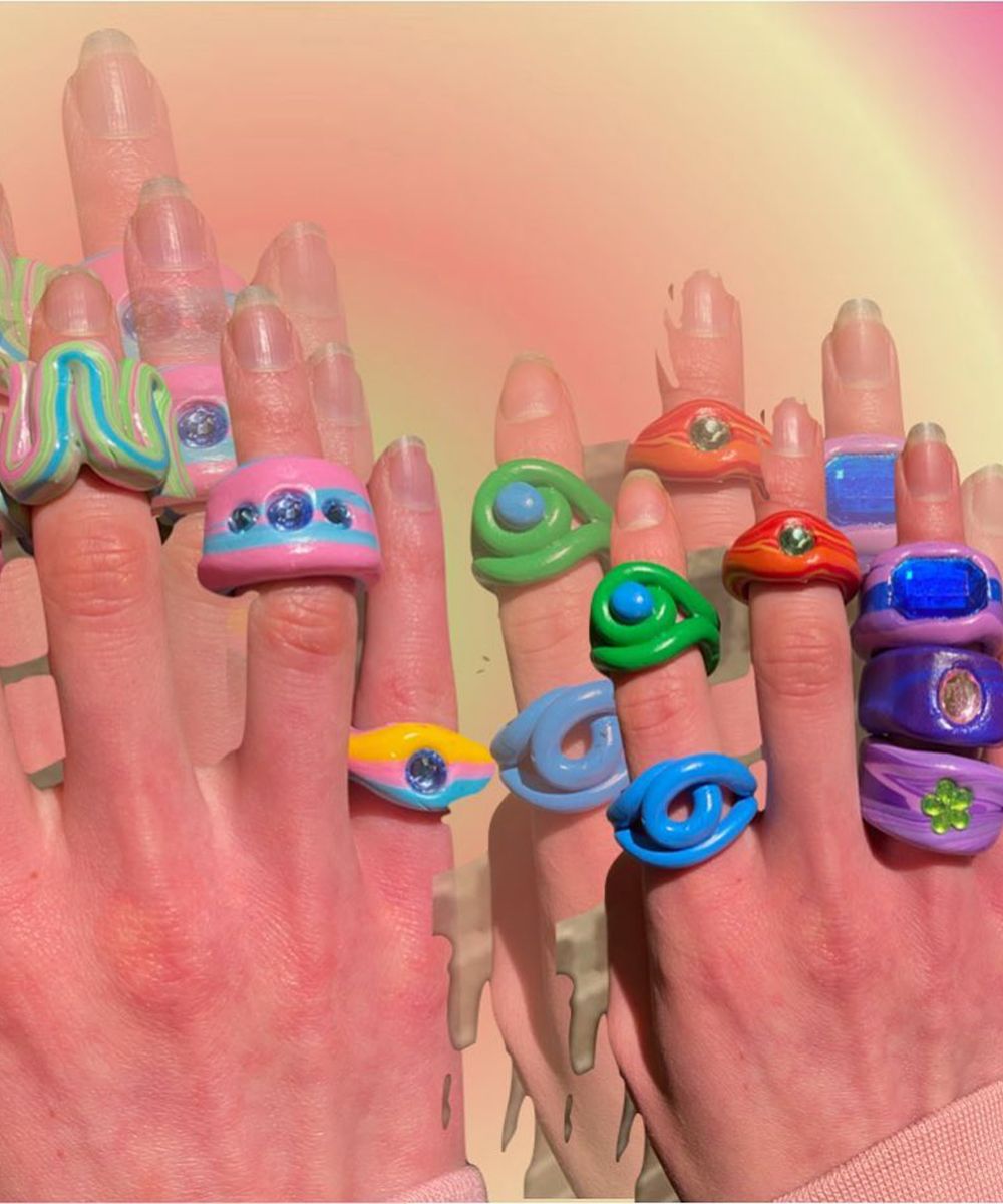 Sono per la maggior parte tutti pezzi unici, realizzati a mano, che spesso nascono dal dialogo tra l’artista e il suo commissionario. In Italia dobbiamo ringraziare Jupiter per averci fatto re-innamorare di questi anelli. Un brand nato nel periodo di lockdown dall'idea di Letizia Bettoni di creare una sintesi ibrida tra design del gioiello e creatività infantile: i suoi anelli si possono ordinare direttamente con un messaggio su Instagram. Rings-à-porter realizzati in un polimero plastico che ricorda la creatività dei bambini sempre con le mani in pasta, alla scoperta di forma e colore. A spopolare, worldwide, anche La Manso, brand amatissimo da Bella Hadid. E per chi storce il naso al pensiero della plastica intorno alle dita, non possiamo promettere un prodotto eco-sostenibile ma che, se acquistato perché piace ed evoca ricordi gioiosi, rimarrà con voi per tantissimo tempo. Il loro è un inno al self-care e al self-love, fanno sentire più cool e sì, anche più potenti. Pezzi unici, nati per aggiungere un tocco pop e divertente ad ogni look.
