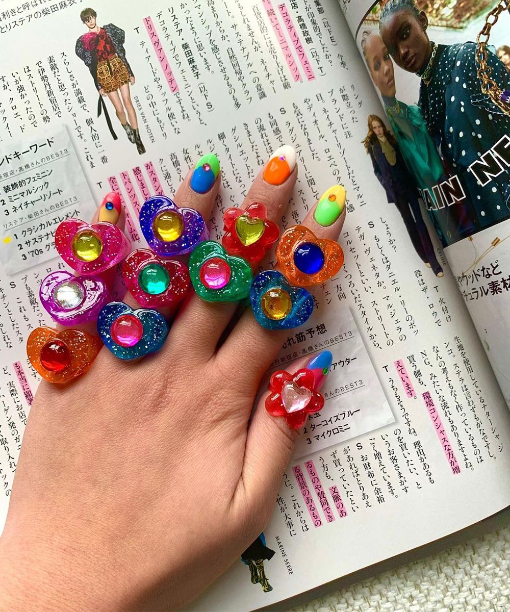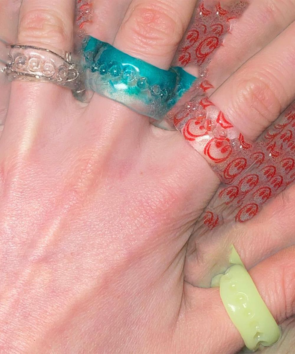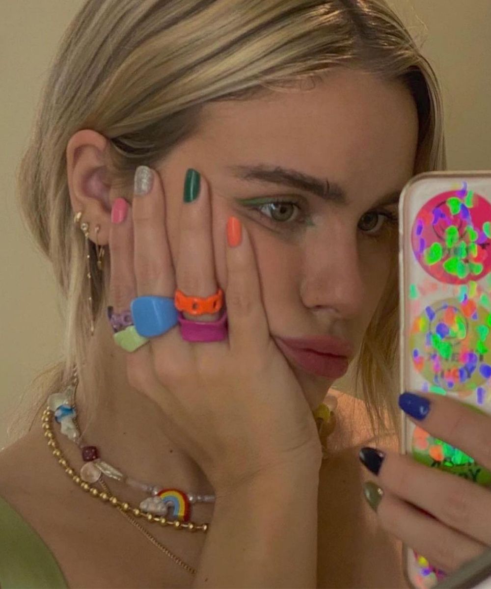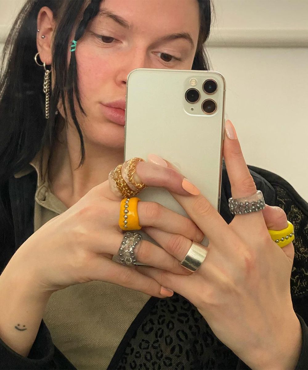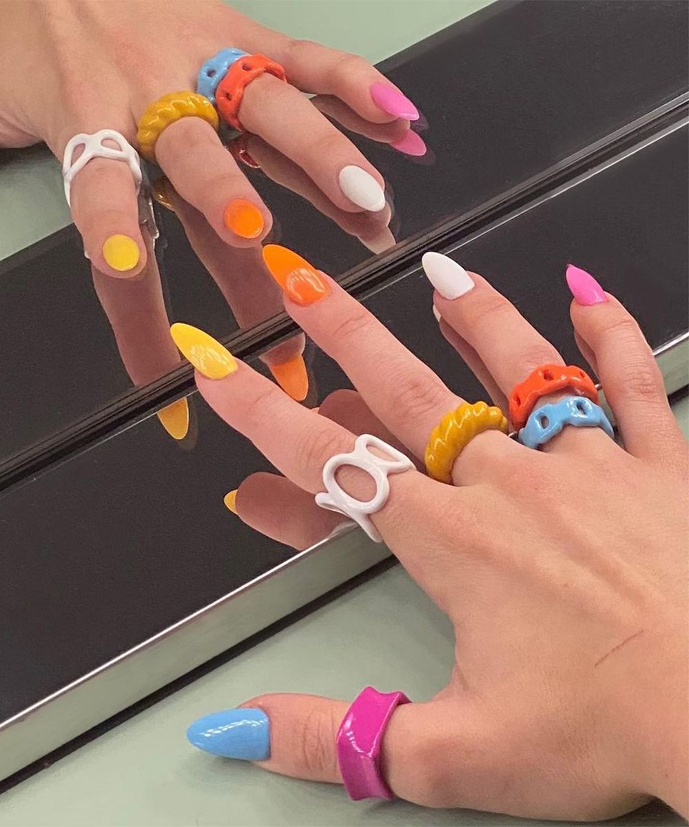 Sono per la maggior parte tutti pezzi unici, realizzati a mano, che spesso nascono dal dialogo tra l’artista e il suo commissionario. In Italia dobbiamo ringraziare Jupiter per averci fatto re-innamorare di questi anelli. Un brand nato nel periodo di lockdown dall'idea di Letizia Bettoni di creare una sintesi ibrida tra design del gioiello e creatività infantile: i suoi anelli si possono ordinare direttamente con un messaggio su Instagram. Rings-à-porter realizzati in un polimero plastico che ricorda la creatività dei bambini sempre con le mani in pasta, alla scoperta di forma e colore. A spopolare, worldwide, anche La Manso, brand amatissimo da Bella Hadid. E per chi storce il naso al pensiero della plastica intorno alle dita, non possiamo promettere un prodotto eco-sostenibile ma che, se acquistato perché piace ed evoca ricordi gioiosi, rimarrà con voi per tantissimo tempo. Il loro è un inno al self-care e al self-love, fanno sentire più cool e sì, anche più potenti. Pezzi unici, nati per aggiungere un tocco pop e divertente ad ogni look.