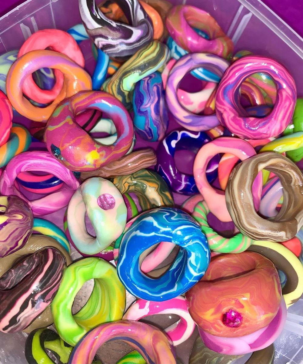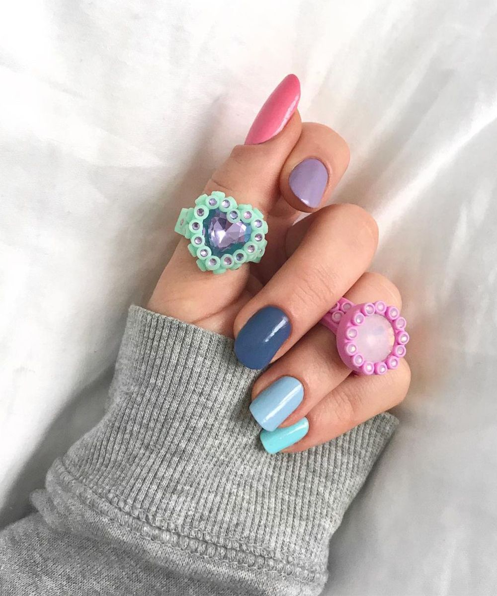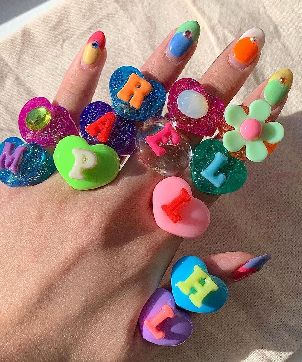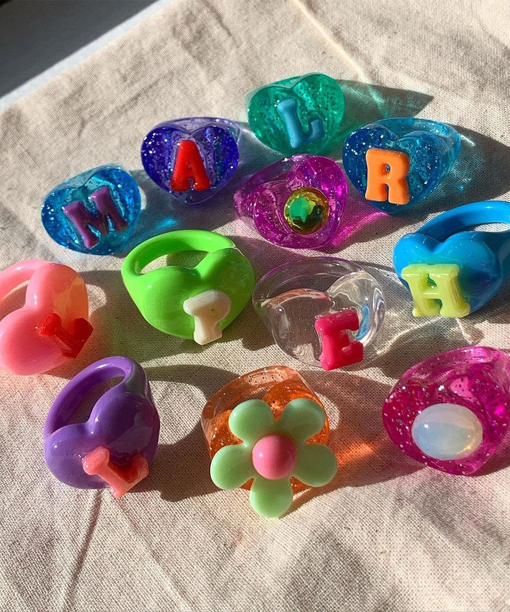 Prima i choker fatti con le conchiglie, poi i bracciali in perline per non perdere il cellulare. E ora è il momento degli anelli in plastica, o in gomma e altri materiali modellabili, un po' in stile Polly Pocket, quelli vistosi e cool che amavamo indossare sul finale dei 90s (e che spesso trovavamo come regalo nei sacchetti delle patatine). Sono piccoli bijoux che, inevitabilmente, riportano alla gioventù vissuta a cavallo tra gli anni '90 e '00. Tutti conditi con glitter e perline luccicanti, piacciono perché non hanno prezzi eccessivi e sono colorati, iper divertenti, e amati da influencer e celebrity come Dua Lipa, Miley Cyrus, Bella Hadid.