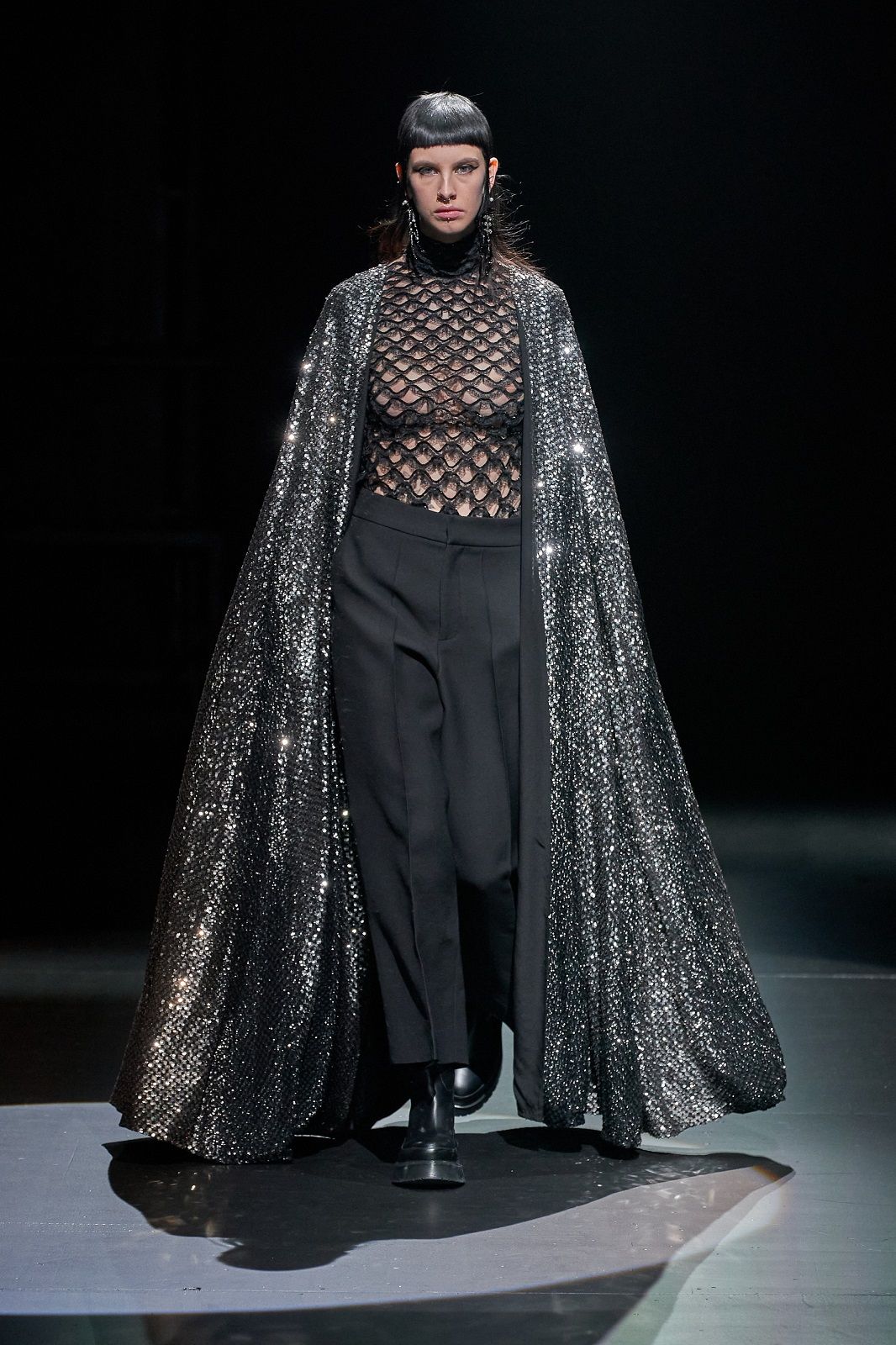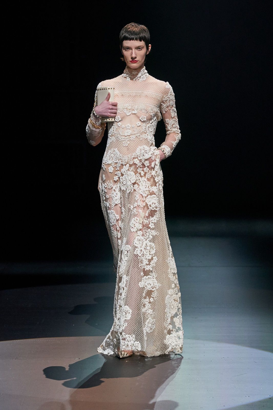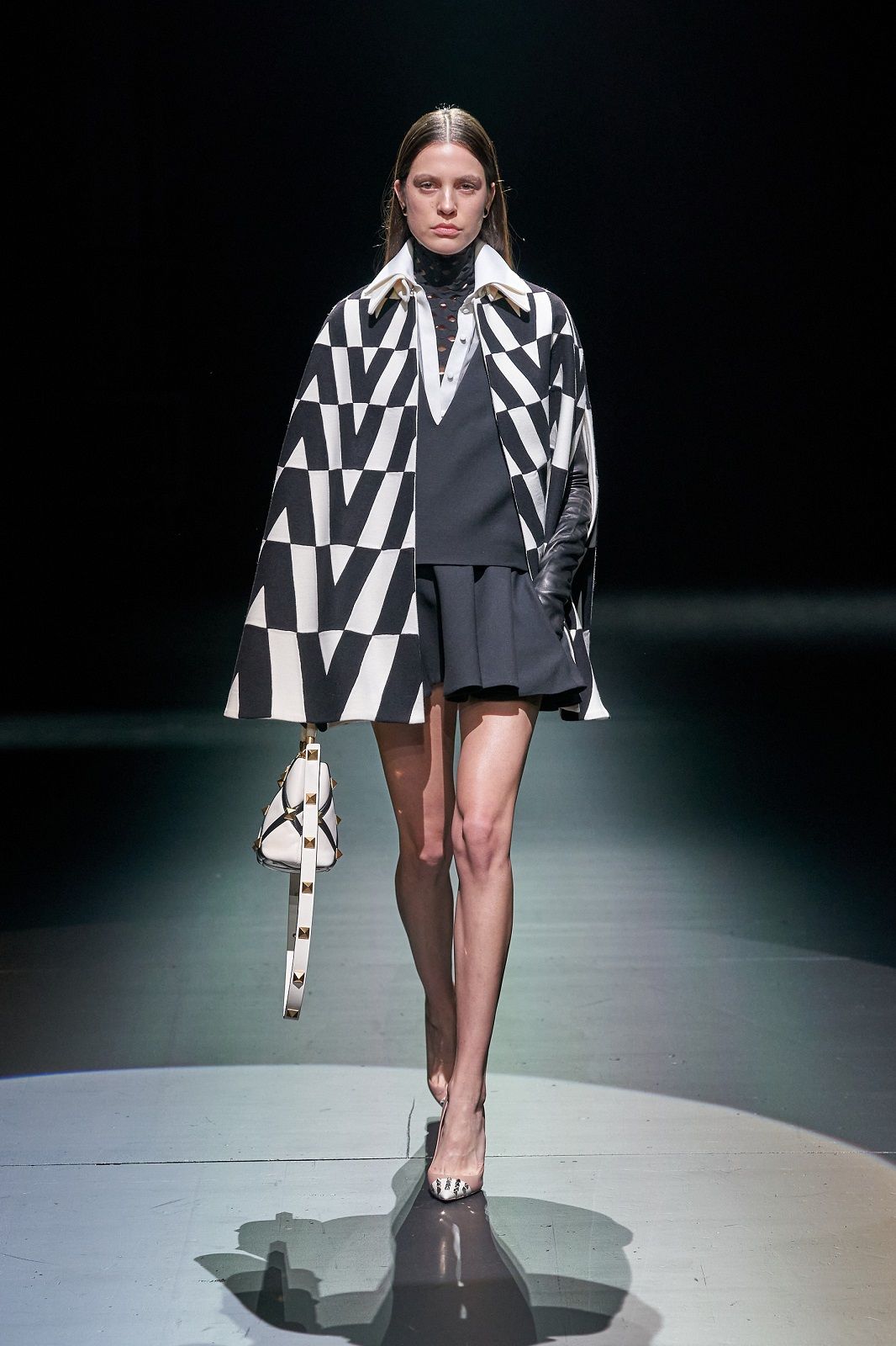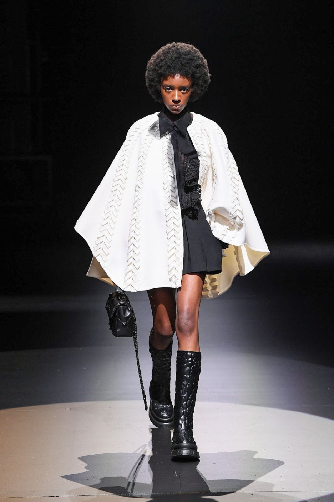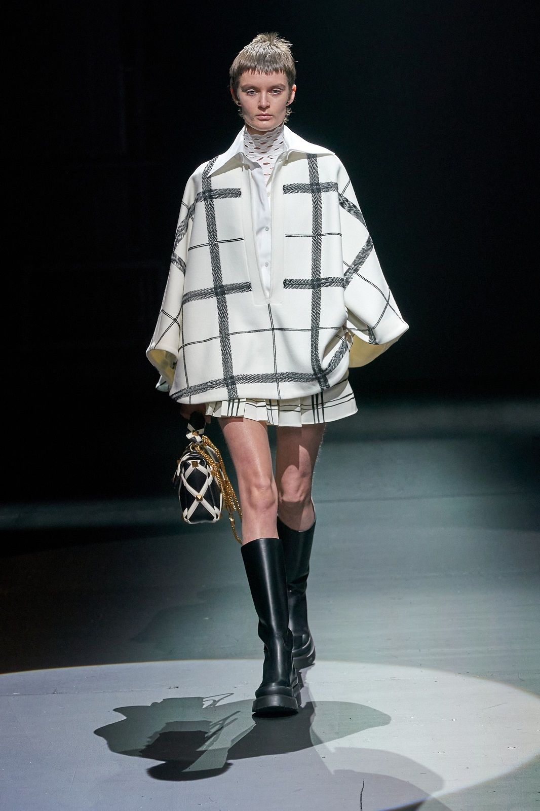 Rielaborati dal talento di Piccioli, punk, romanticismo, sartorialità e Lucio Fontana con i suoi tagli netti che squarciano la tela si traducono in un guardaroba daywear versatile, stratificato, fatto di gonne a pieghe e mini dress che mettono in risalto le gambe, di camicie, pull in knitwear, maglioni a collo alto dalla lavorazione a rete, eleganti mantelle bon ton e maxi coat. Sono i dettagli a dare carattere, un twist quasi anarchico che riequilibra l’heritage couture della Maison: il dualismo cromatico di bianco e nero, spezzato solo da qualche accenno di oro, che crea una serie di contrasti optical; le trasparenze che si fondono con le piume e con lo scintillio delle paillettes; i ricami, gli intarsi e gli intagli che danno corpo alle silhouette e rendono il pizzo simile a una rete e, insieme, omaggiano l’arte di Fontana.