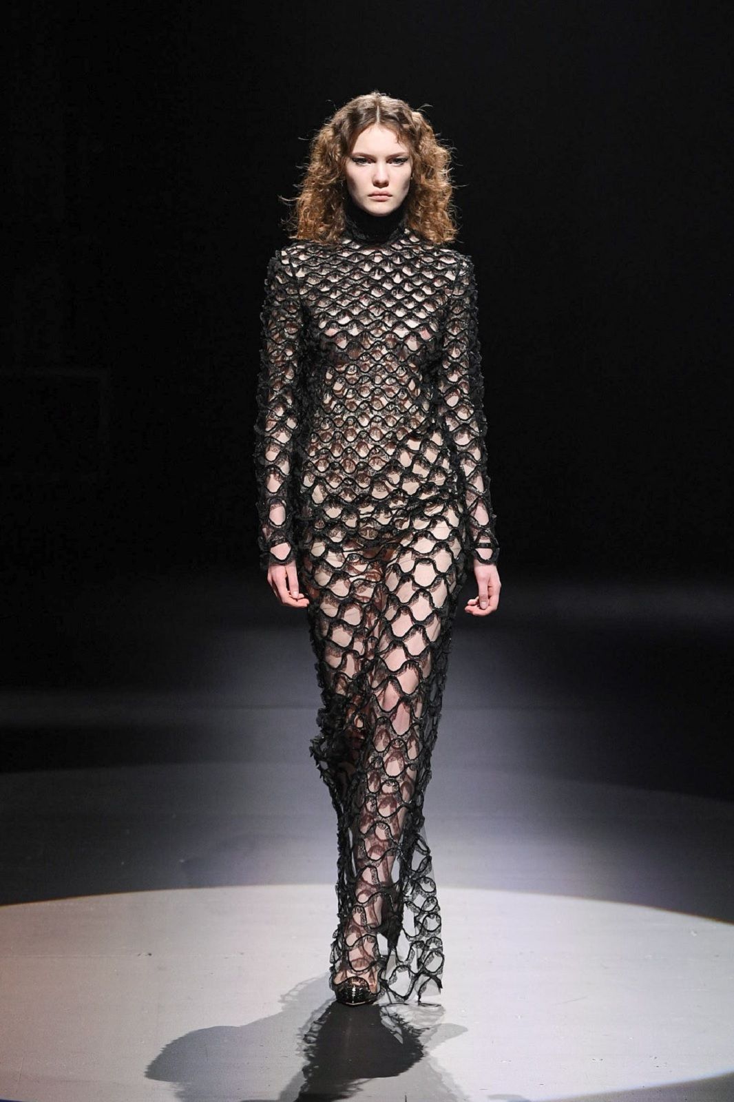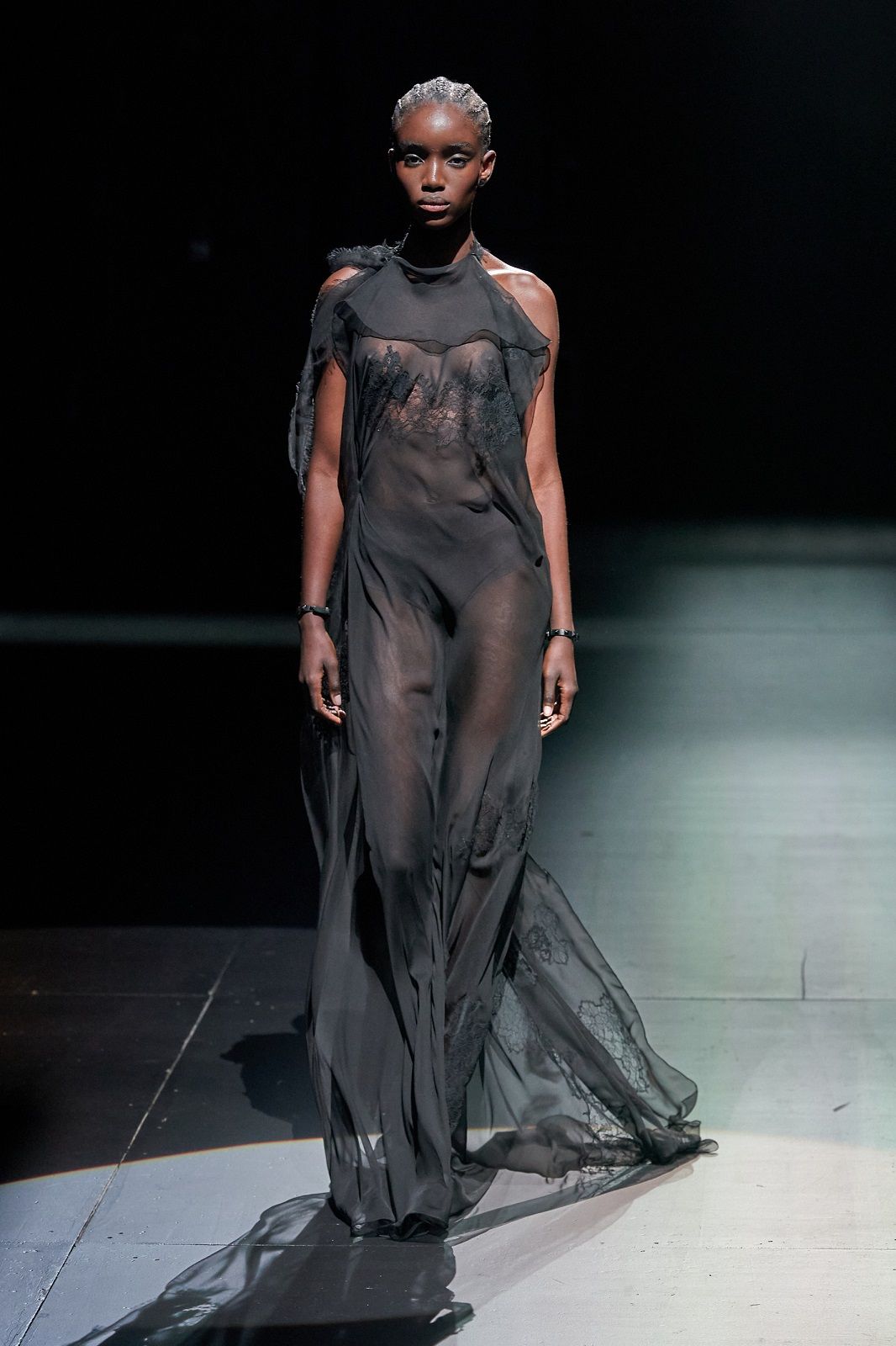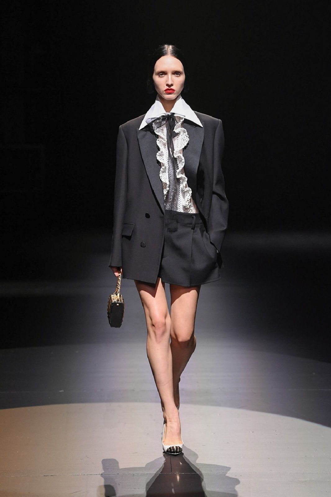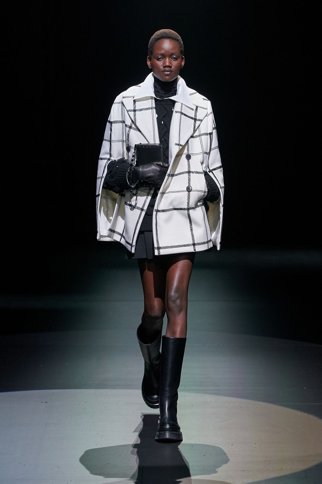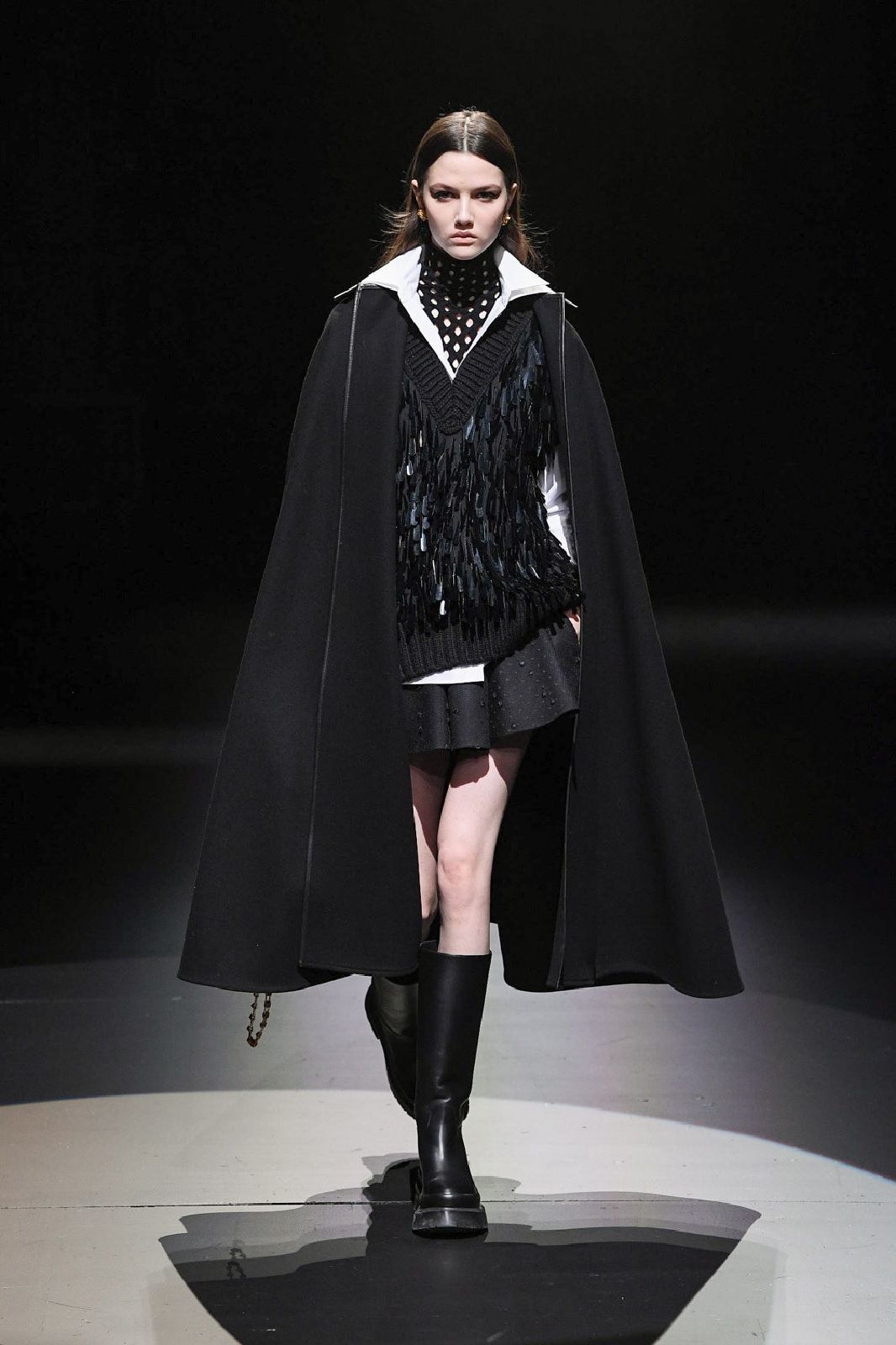 Rielaborati dal talento di Piccioli, punk, romanticismo, sartorialità e Lucio Fontana con i suoi tagli netti che squarciano la tela si traducono in un guardaroba daywear versatile, stratificato, fatto di gonne a pieghe e mini dress che mettono in risalto le gambe, di camicie, pull in knitwear, maglioni a collo alto dalla lavorazione a rete, eleganti mantelle bon ton e maxi coat. Sono i dettagli a dare carattere, un twist quasi anarchico che riequilibra l’heritage couture della Maison: il dualismo cromatico di bianco e nero, spezzato solo da qualche accenno di oro, che crea una serie di contrasti optical; le trasparenze che si fondono con le piume e con lo scintillio delle paillettes; i ricami, gli intarsi e gli intagli che danno corpo alle silhouette e rendono il pizzo simile a una rete e, insieme, omaggiano l’arte di Fontana.