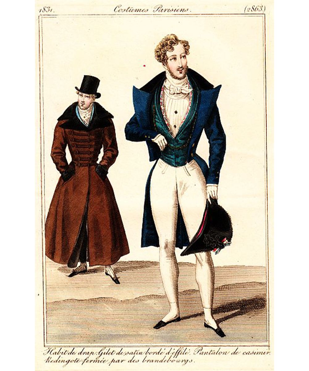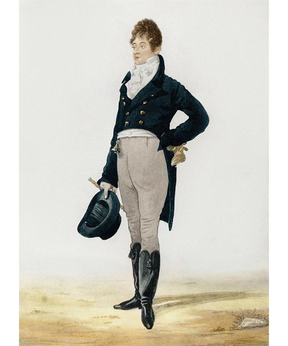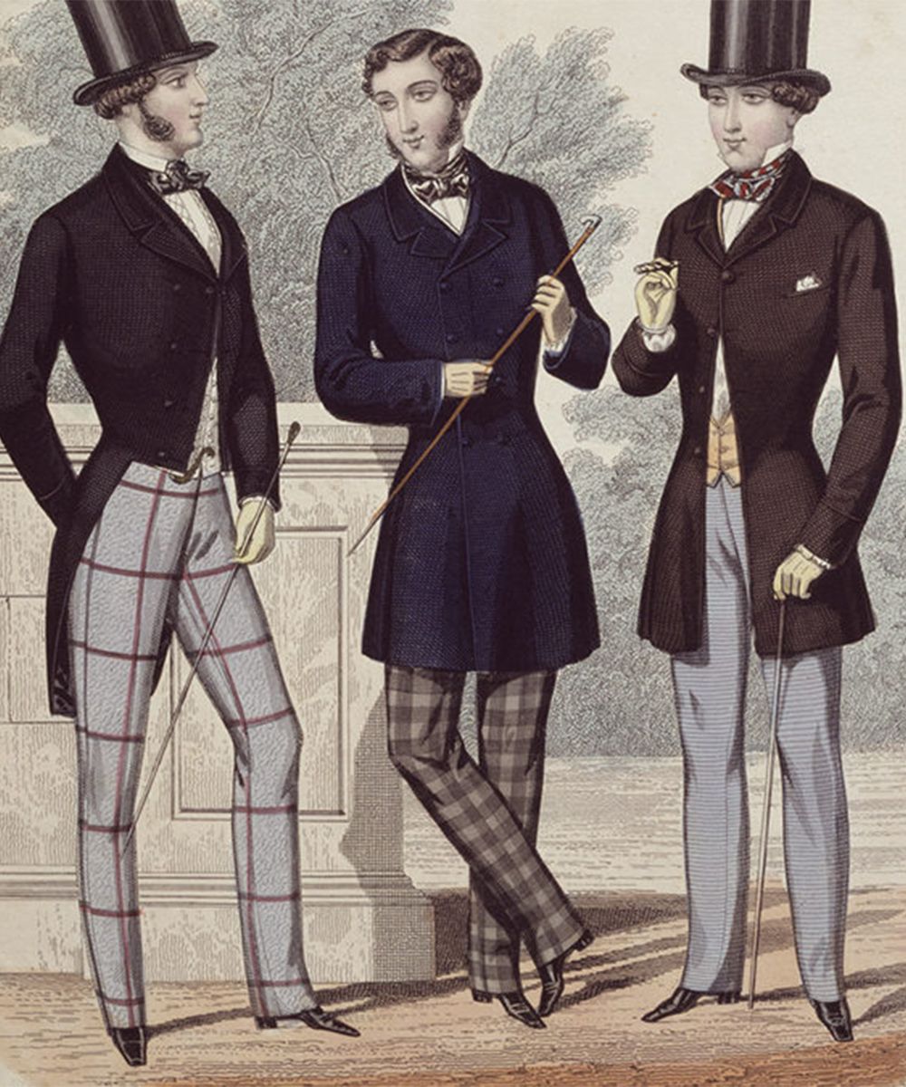 Con l’avvento della Rivoluzione industriale e di una società capitalistico-borghese si assiste a quella che Flügel definì la “Grande rinuncia” del sesso maschile, che corrisponde al ritiro dell’uomo dal panorama della moda. L’abbigliamento maschile non era più quello sfarzoso ed eccentrico tipico dell’aristocrazia, ma divenne più sobrio e rigoroso, simbolo di due classi sociali nascenti: la borghesia e la classe operaia, i primi vestiti in lana, i secondi con abiti di fustagno. Contemporaneamente, la moda maschile si spostò verso il codice d’abbigliamento tipico del gentiluomo inglese, rifiutando la mentalità borghese e mostrando un sentimento di nostalgia verso un’aristocrazia che aveva appena iniziato a cadere. In particolare, George Brummel passò alla storia come il dandy che fece di quella moda un modello di eleganza. Il dandy, spesso narcisista e molto attento alla presentazione della propria immagine, si poneva con una predilezione per l’individualismo piuttosto che per le masse. Alcuni storici parlano del dandismo sia come “anti-fashion” che come “oppositional style”, da una parte quindi qualcosa di atemporale ed elegante, dall’altra uno stile che ha come obiettivo quello di esprimere il dissenso verso un’idea supportata da una maggioranza. In entrambi i casi lo stile del dandy ha rappresentato comunque uno stile senza tempo, reinterpretato per l’abbigliamento femminile da Gabrielle Chanel con l’utilizzo di cashmere, tweed, e forme tipiche del guardaroba maschile.