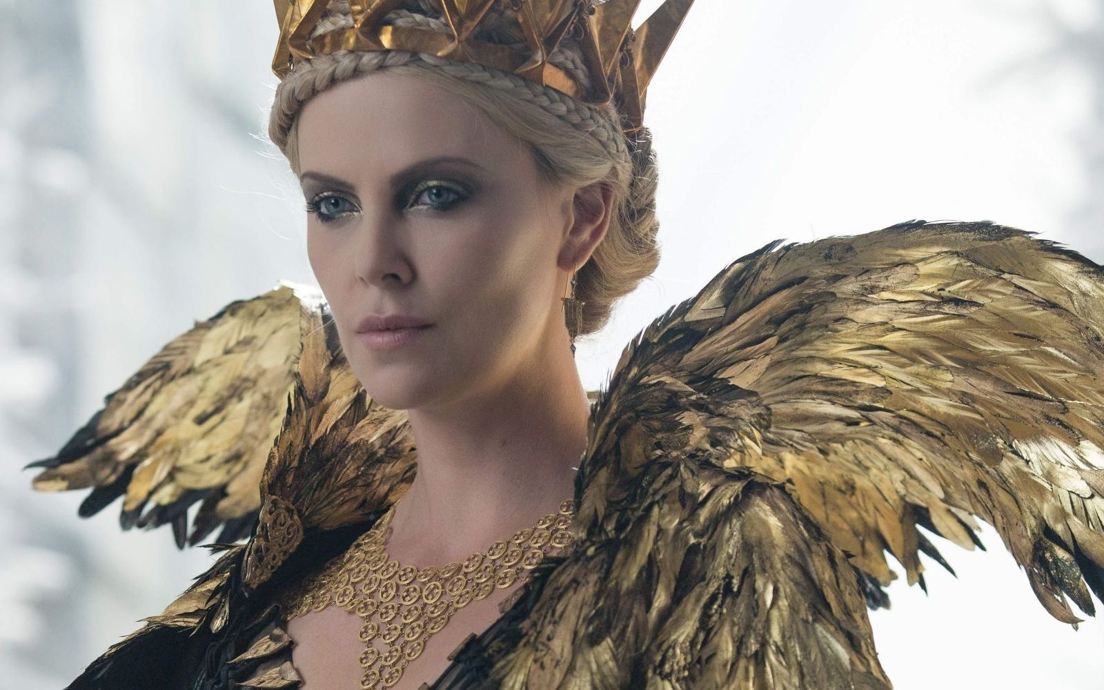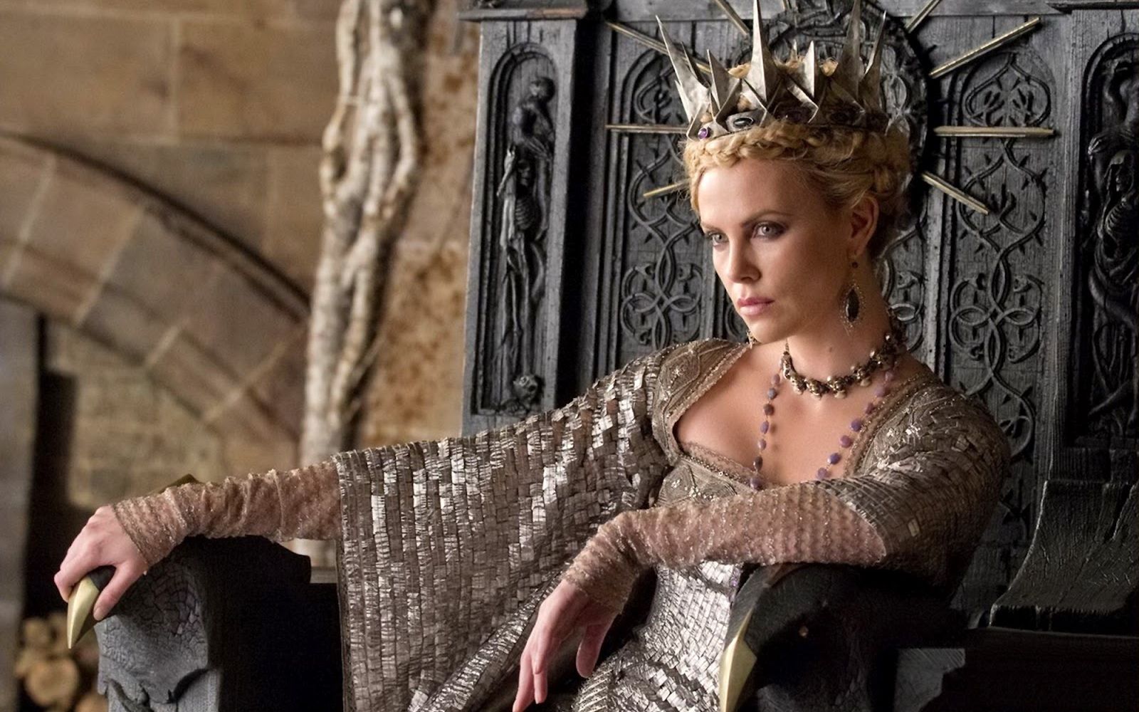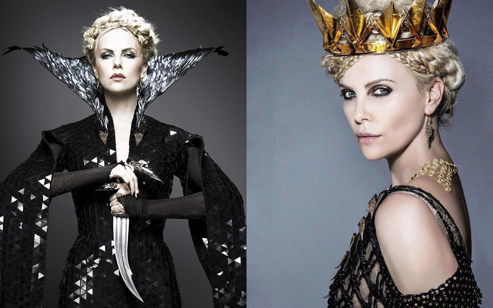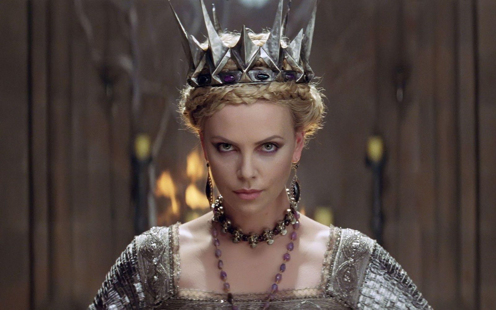 "Specchio, servo delle mie brame, chi è la più bella del reame?". Non è sicuramente la Grimilde di Disney, una strega in mantello nero e long dress ametista, con le sopracciglia folte e arcuate che incorniciano gli occhi verdi che la rendevano simile all’attrice Joan Crawford e la presenza ieratica e inquietante ispirata alla statua di Uta di Ballenstedt che si trova nel coro della cattedrale di Naumburg. La più bella del reame è la regina Ravenna interpretata da Charlize Theron, prima in Biancaneve e il cacciatore, poi in Il Cacciatore e la Regina di Ghiaccio. Crudele, fiera, forte, assetata di potere, invidiosa ed estremamente vanitosa, è la tiranna oscura e potentissima di Tabor, ma, soprattutto, è di una bellezza devastante. La paura che Biancaneve la metta in ombra la fa impazzire, ma, almeno sullo schermo, Ravenna non ha rivali. Il merito è sia della star Hollywoodiana che le dà il volto sia degli splendidi ed architettonici costumi realizzati dal premio Oscar Colleen Atwood. Più che una semplice regina il suo stile la fa sembrare una vera dea nordica: il lungo mantello di piume dorate, l’abito da sposa ispirato ad una gabbia toracica, elaborate creazioni che mixano nero, argento, oro, pelle, bustier, lacci, maniche voluminose e gioielli appariscenti come la sua corona. Anche il make-up riprende i toni metallici degli abiti, ma il vero must è l’eye-liner spesso e nero.