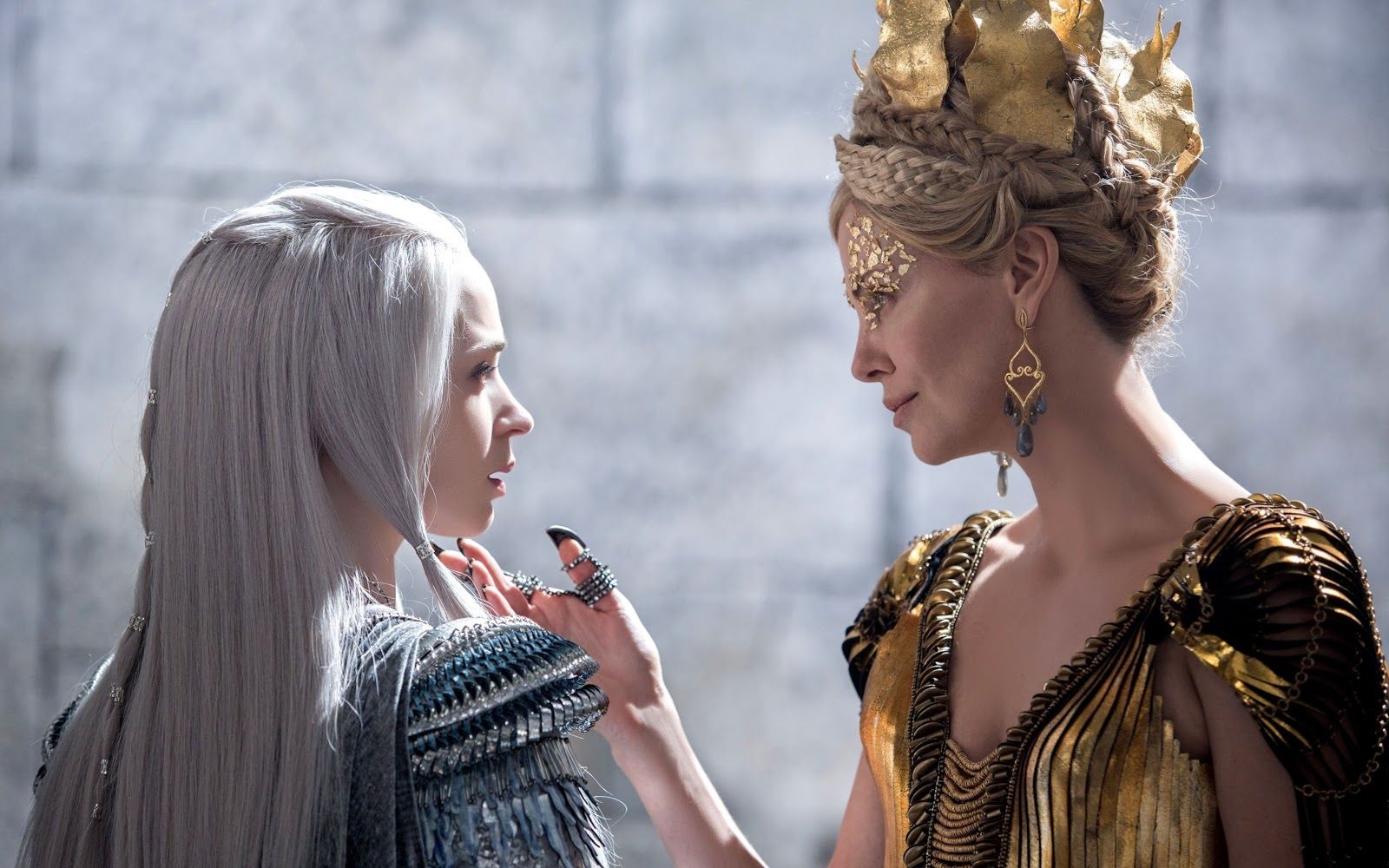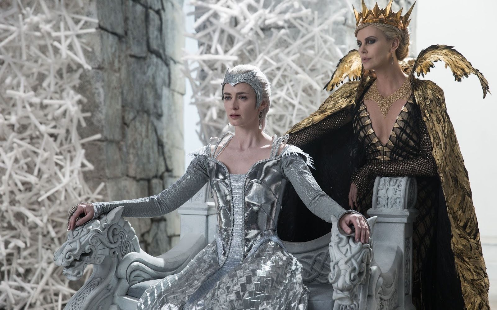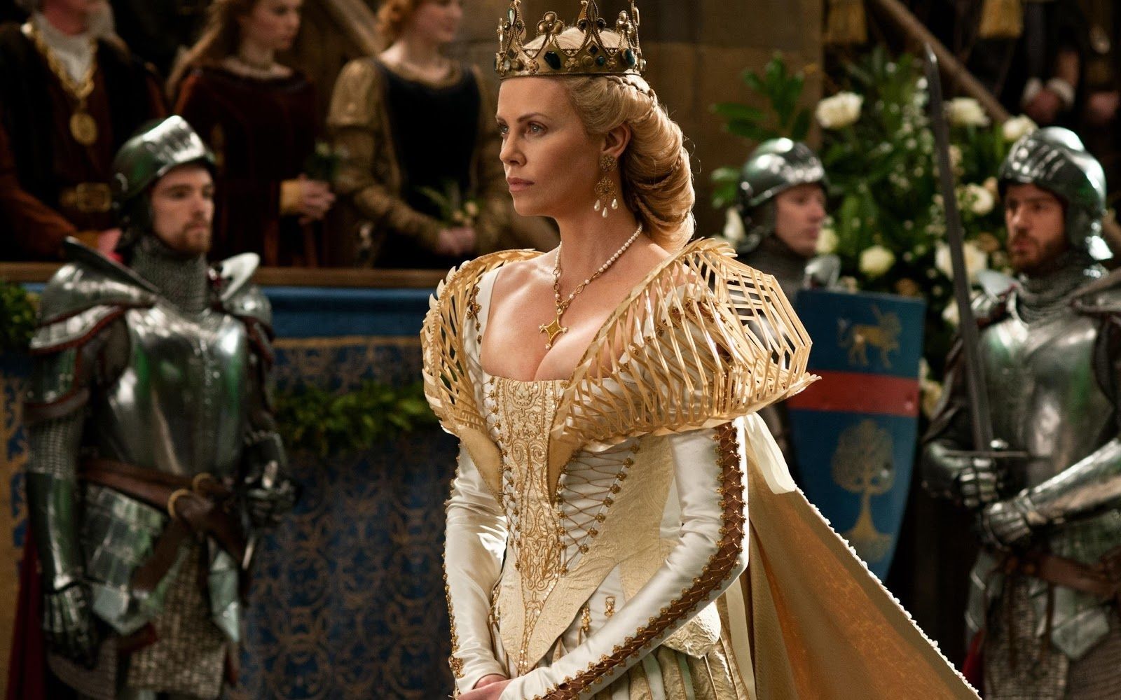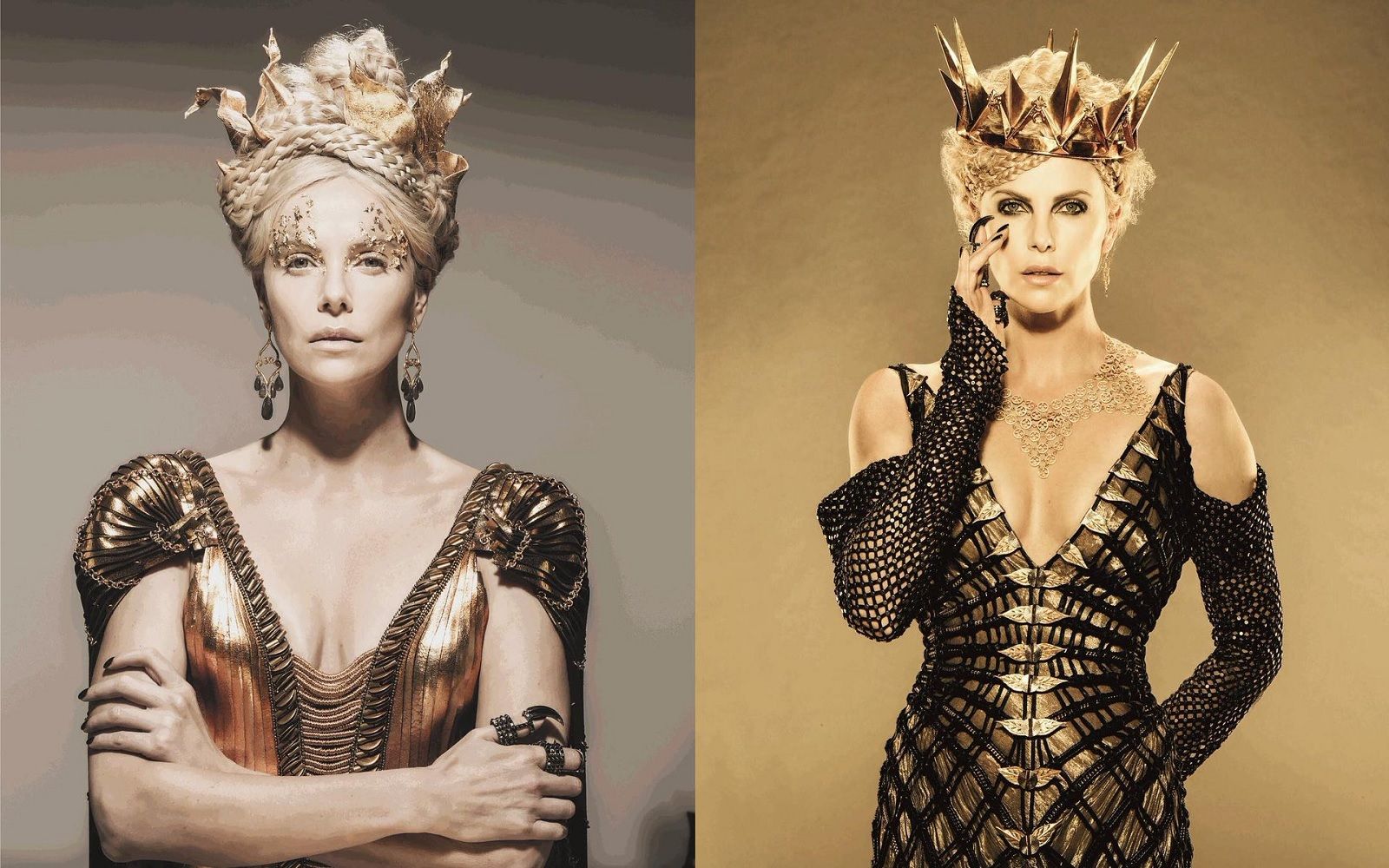 "Specchio, servo delle mie brame, chi è la più bella del reame?". Non è sicuramente la Grimilde di Disney, una strega in mantello nero e long dress ametista, con le sopracciglia folte e arcuate che incorniciano gli occhi verdi che la rendevano simile all’attrice Joan Crawford e la presenza ieratica e inquietante ispirata alla statua di Uta di Ballenstedt che si trova nel coro della cattedrale di Naumburg. La più bella del reame è la regina Ravenna interpretata da Charlize Theron, prima in Biancaneve e il cacciatore, poi in Il Cacciatore e la Regina di Ghiaccio. Crudele, fiera, forte, assetata di potere, invidiosa ed estremamente vanitosa, è la tiranna oscura e potentissima di Tabor, ma, soprattutto, è di una bellezza devastante. La paura che Biancaneve la metta in ombra la fa impazzire, ma, almeno sullo schermo, Ravenna non ha rivali. Il merito è sia della star Hollywoodiana che le dà il volto sia degli splendidi ed architettonici costumi realizzati dal premio Oscar Colleen Atwood. Più che una semplice regina il suo stile la fa sembrare una vera dea nordica: il lungo mantello di piume dorate, l’abito da sposa ispirato ad una gabbia toracica, elaborate creazioni che mixano nero, argento, oro, pelle, bustier, lacci, maniche voluminose e gioielli appariscenti come la sua corona. Anche il make-up riprende i toni metallici degli abiti, ma il vero must è l’eye-liner spesso e nero.