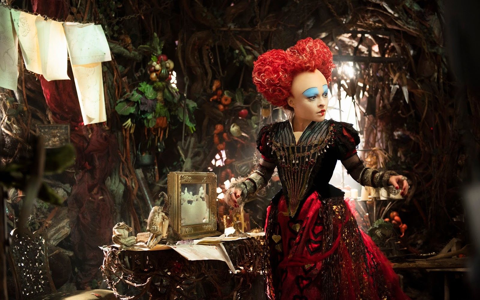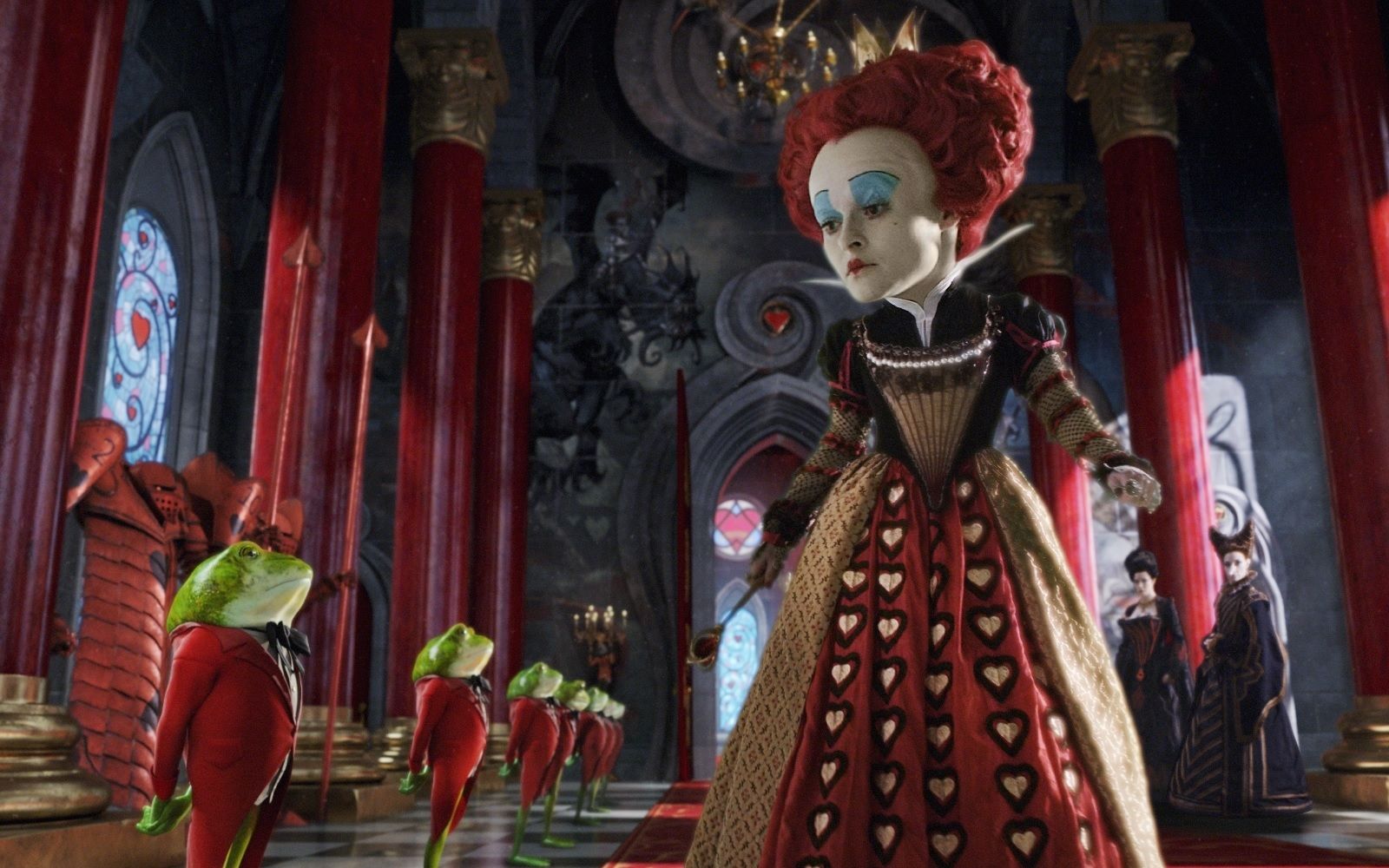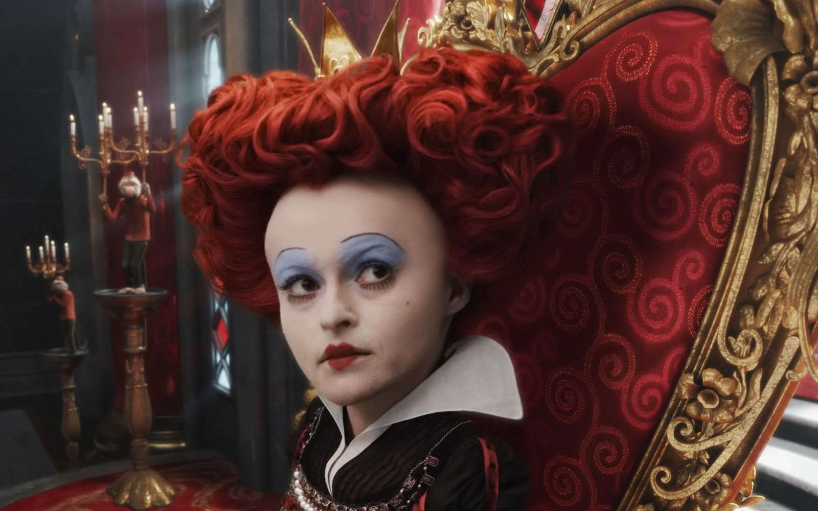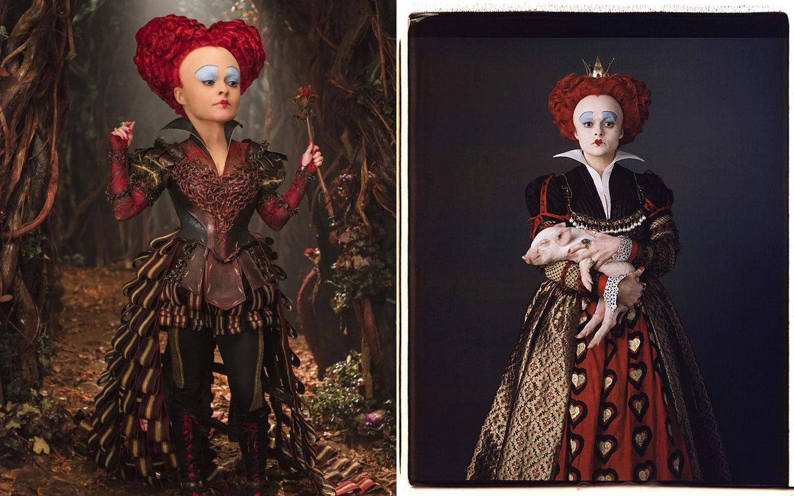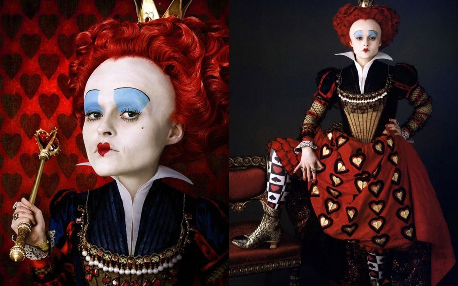 Perfida, grottesca, iraconda e decisamente volubile, la Regina di Cuori dei libri di Lewis Carrol, così come quella Disney, pare sia stata ispirata dalla Regina Vittoria D’Inghilterra, ma a renderla veramente iconica è stata Helena Bonham Carter nella saga cinematografica diretta da Tim Burton. La follia è la stessa: scaglia punizioni per le più bizzarre ragioni, ama tagliare le teste, fa dipingere tutte le rose di rosso e usa i maialini come poggiapiedi. A diventare più surreale fino a ricordare un’opera di Mark Ryden o John Currin è, invece, l’estetica: testa grossa, sproporzionata rispetto al corpo; capelli rossi a forma di cuore, dove spunta una piccola coroncina; abiti vagamente steam-punk. Il make-up è drammatico quanto quello di un clown. Alla base c’è uno spesso strato di cerone bianco su cui sono dipinte una piccola bocca rossa a cuore, le sopracciglia sottilissime ed un semicerchio di ombretto cremoso azzurro.