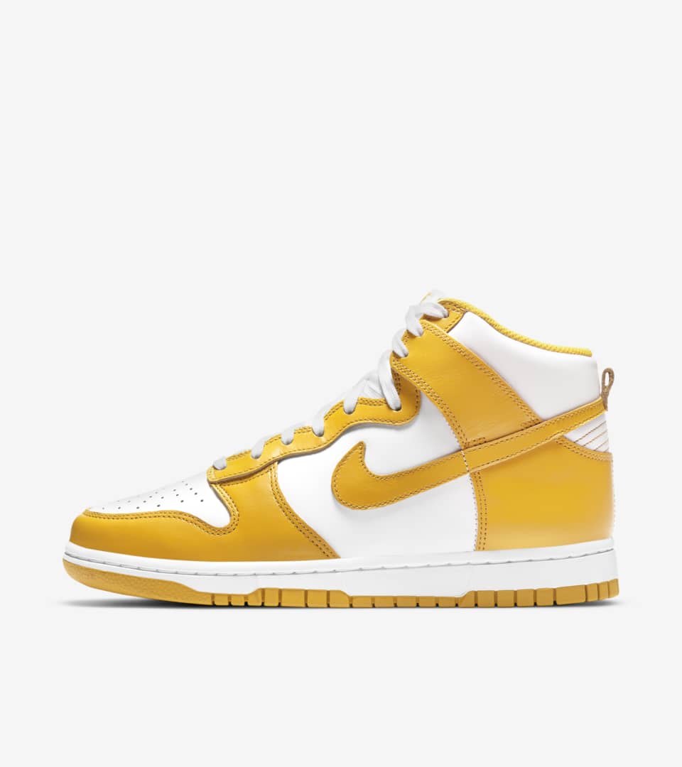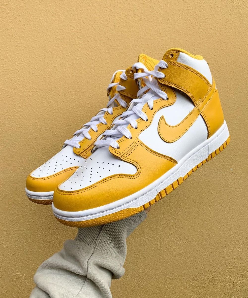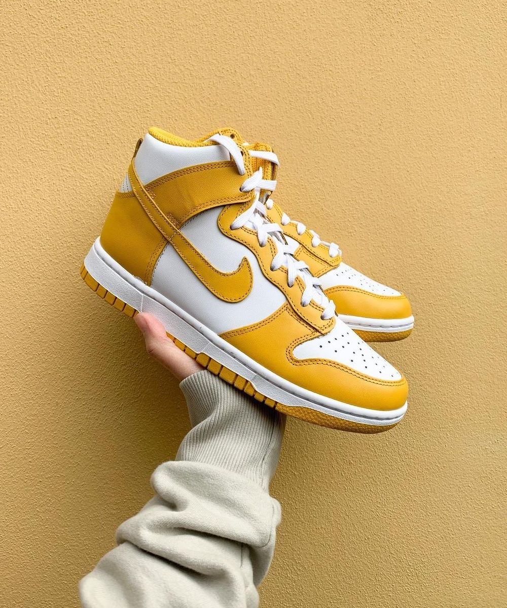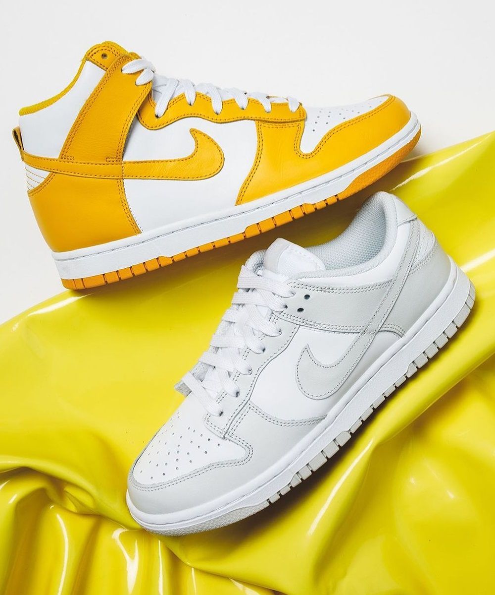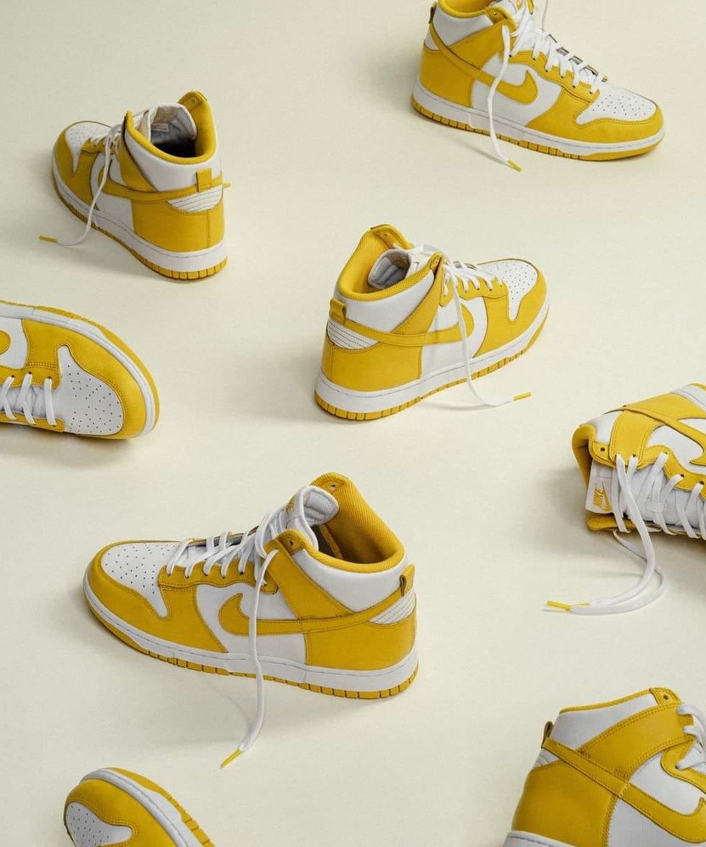 Il modello più luminoso è sicuramente la Nike Dunk High "Dark Sulfur". Sulla tomaia in pelle il giallo, il colore del 2021, si alterna al bianco, amplificando il mood old school delle scarpe. Il design non è l’unico plus, infatti, il colletto imbottito regala una vestibilità e una sensazione di stabilità, mentre i fori sulla punta garantiscono la traspirazione. Se vi siete già innamorati di questa combo di toni, allora non vedrete l’ora di aggiungere alla vostra collezione anche le Nike Dunk Low "Lemon Drop" che arriveranno negli store a fine aprile.