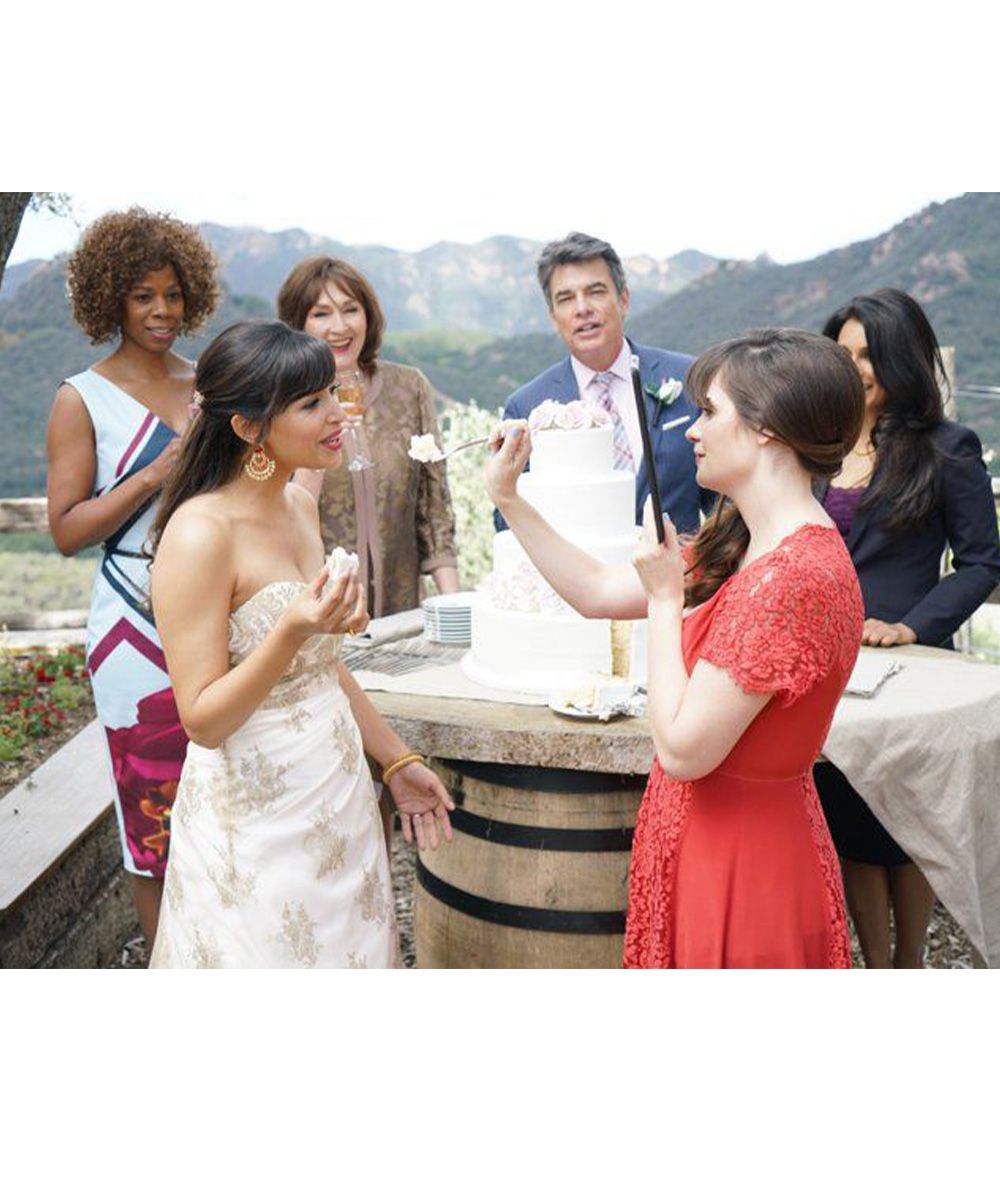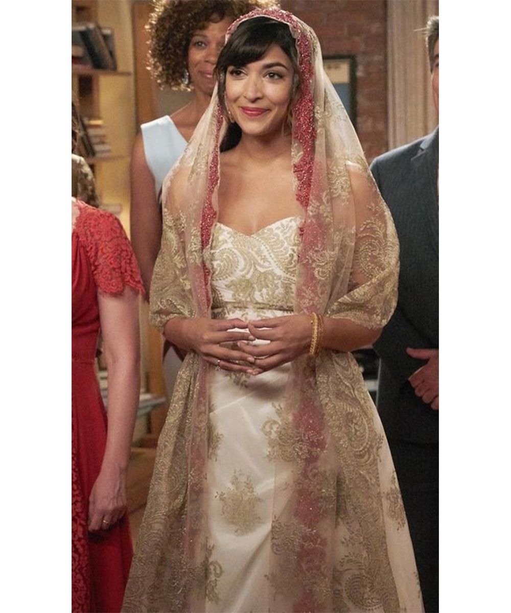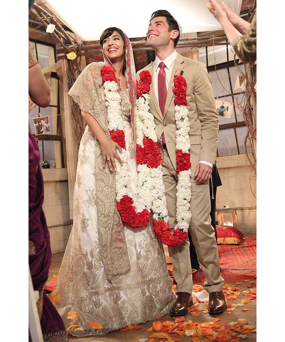 Rimaniamo nella sfera delle comedy series e puntiamo i riflettori su questo abito forse anticonvenzionale ma decisamente da favola. Cece e Schmidt, protagonisti della celeberrima sitcom New Girl, si sono scambiati i voti nel finale di quinta stagione, dopo una lunga e rocambolesca relazione. Lei, interpretata dalla modella-attrice Hannah Simone, ha indossato un sari dorato completo di fiori rossi e bianchi, mentre Schmidt ha abbinato la combinazione di colori con un vestito marrone chiaro e una cravatta rossa. L’effetto è piuttosto wow.