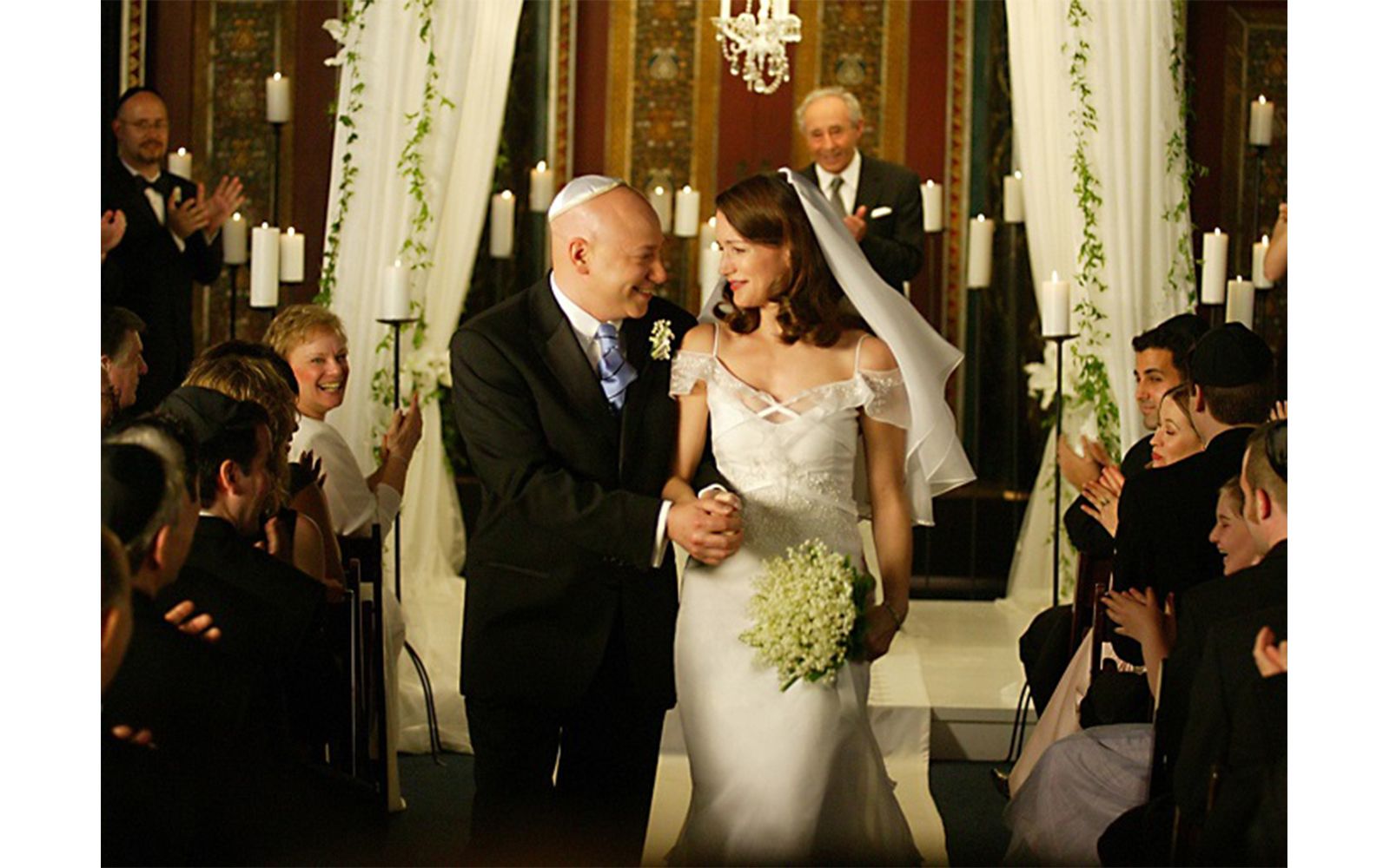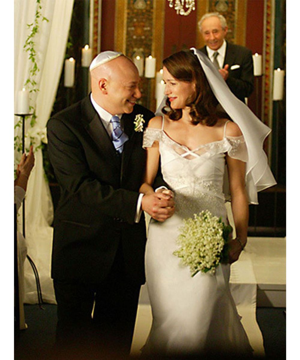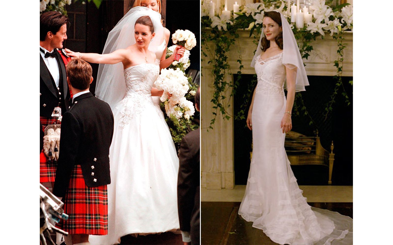 Rimaniamo a New York con lo sguardo puntato verso un’altra serie TV che ha fatto la storia della moda, prima ancora che del piccolo schermo. Sex and the City. Qui le protagoniste Carrie, Miranda, Samantha e Charlotte hanno saputo emozionarci con outfit straordinari, ognuna nel suo modo e stile. Sempre merito di una grande stylist come Patricia Field, che è riuscita a ricreare con ogni OOTD realtà favolose attorno alle bff di SATC… ma mai come in occasione di un matrimonio. Sono certa che ogni fashion addict che abbia divorato la serie culto di Darren Star – che ha plasmato l’immaginario fashionista collettivo di una generazione intera – non può non ricordare il Cloud Dress firmato Vivienne Westwood e indossato dall’intramontabile Carrie Bradshaw in Sex and the City – the movie. Tuttavia, noi seguaci del piccolo schermo vogliamo ricordare un altro incredibile wedding dress sfoggiato nella sesta stagione da Charlotte York in occasione del matrimonio con l’avvocato divorzista Harry Goldenblatt. Per l’esattezza l’abito dall’allure timeless era un abito by Badgley Mischka con spalline scoperte molto chic e nastri che attraversavano il corpetto. A completare il look un velo in organza portato sulle spalle e incastonato in un’acconciatura di boccoli anni ’50.